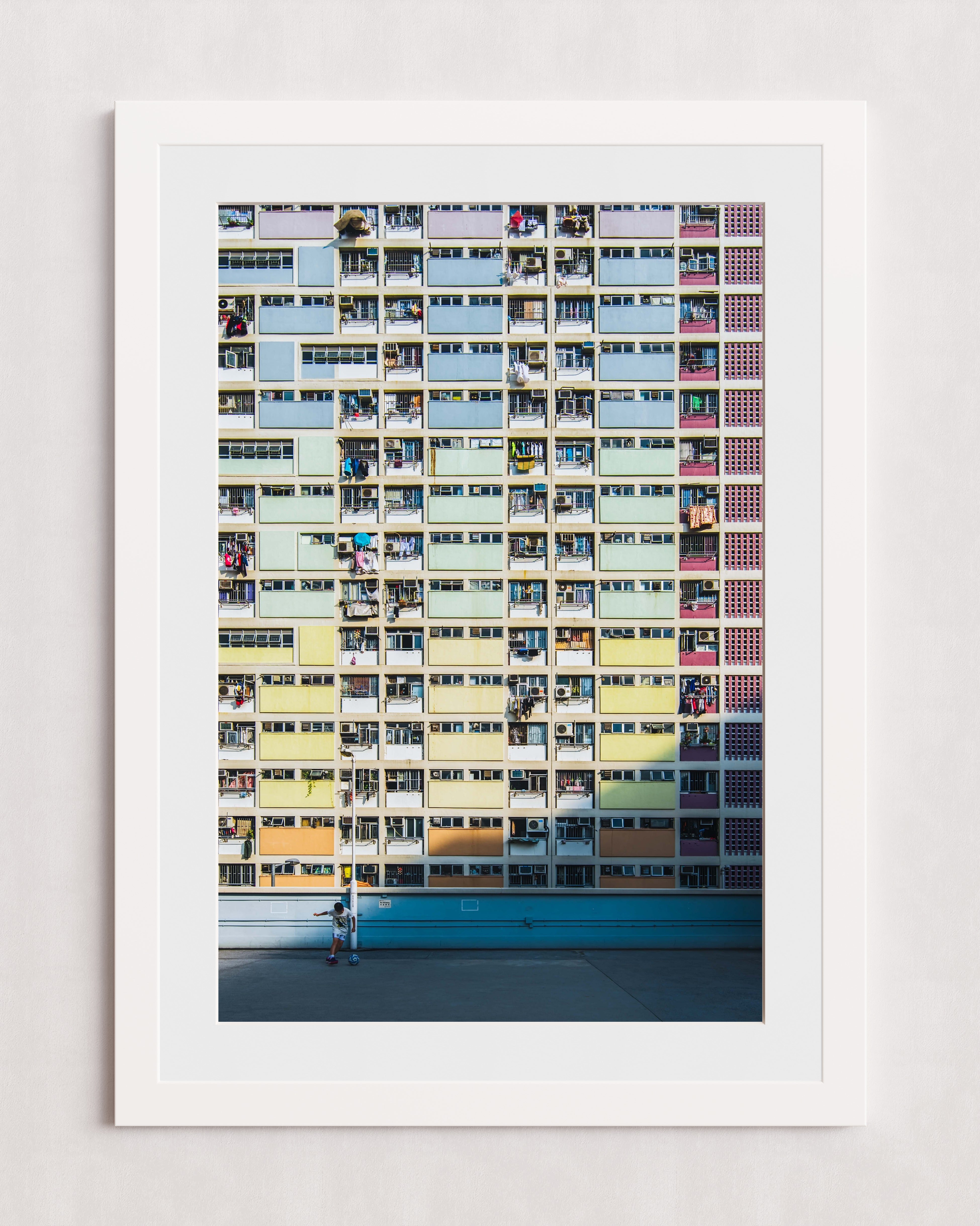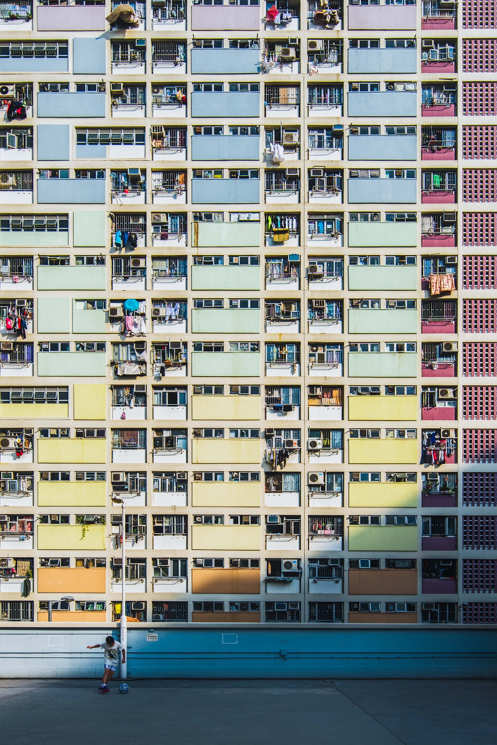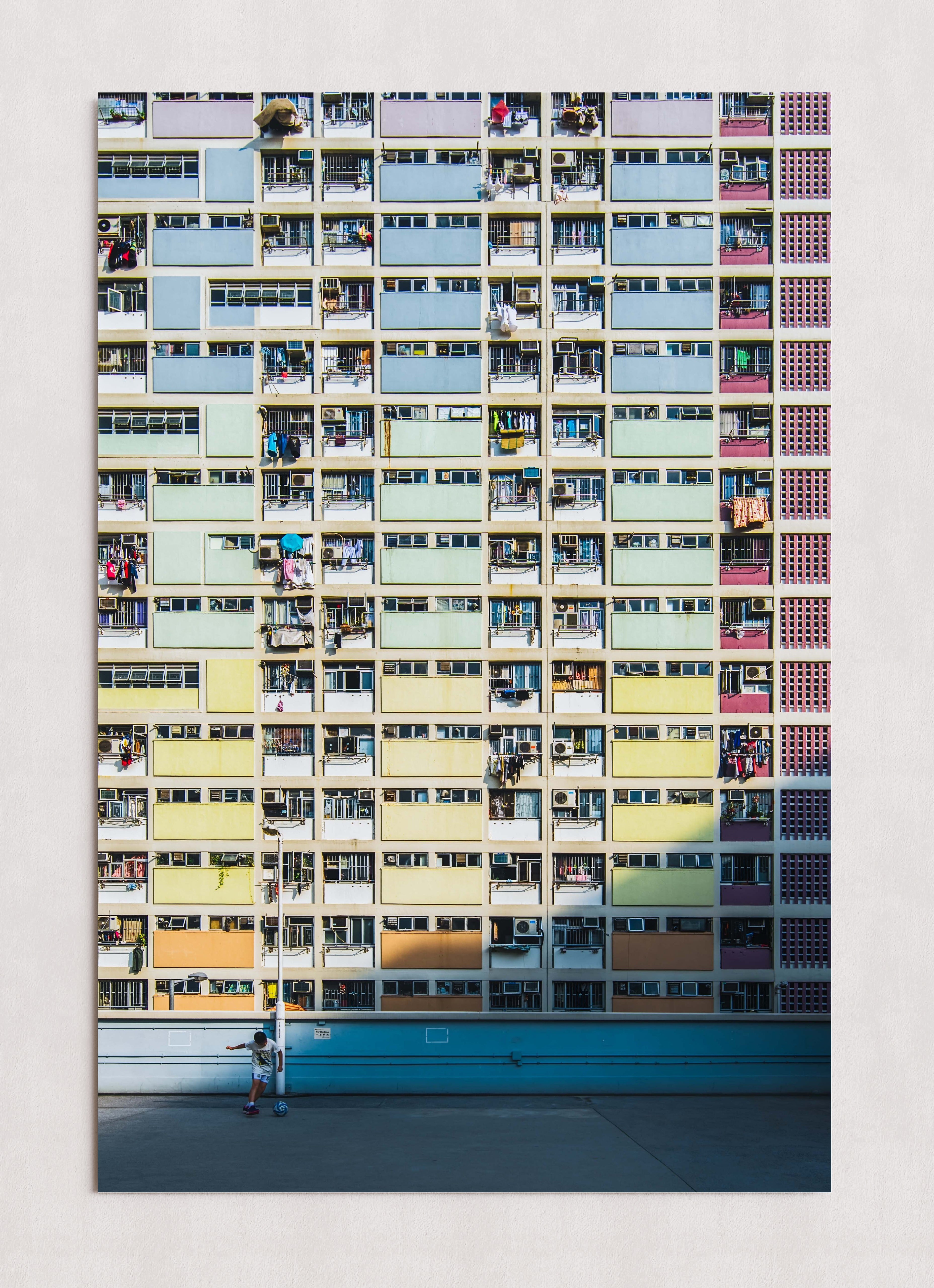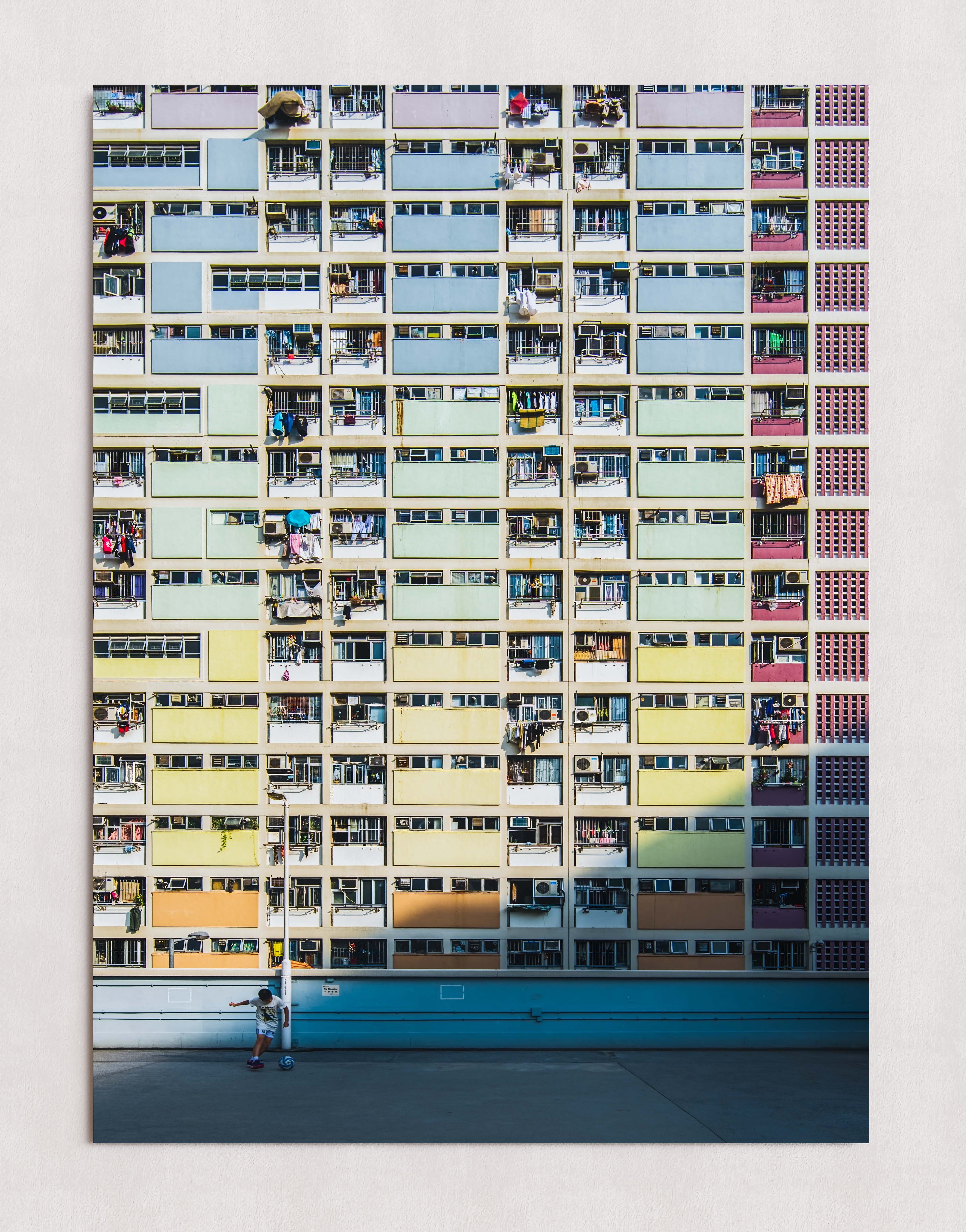 Un immeuble d'appartements aux couleurs chatoyantes, percé de nombreux balcons et fenêtres, domine le paysage. Au premier plan, une personne se tient debout sur une surface en béton baignée de soleil, ce qui accentue l'échelle de la structure imposante.