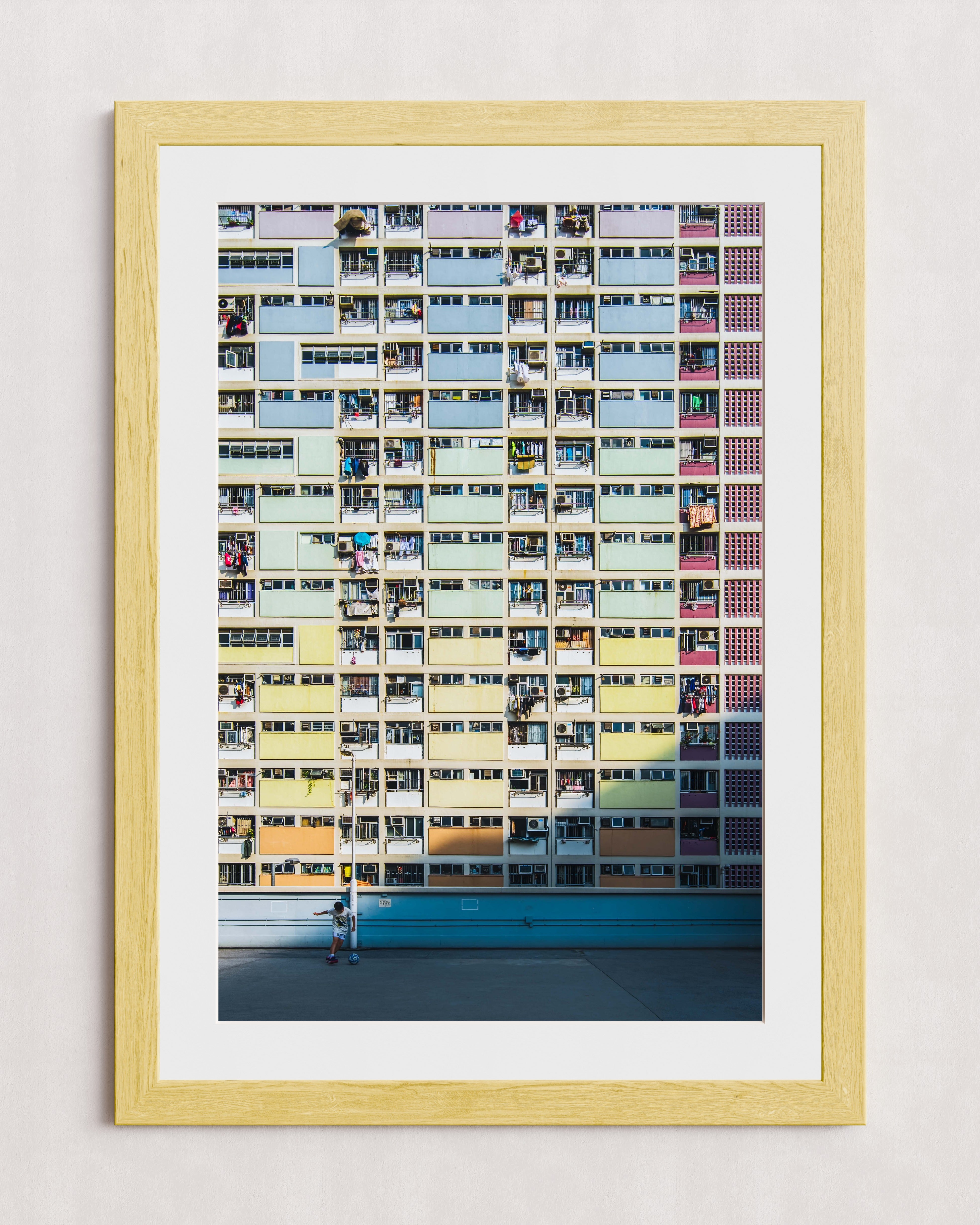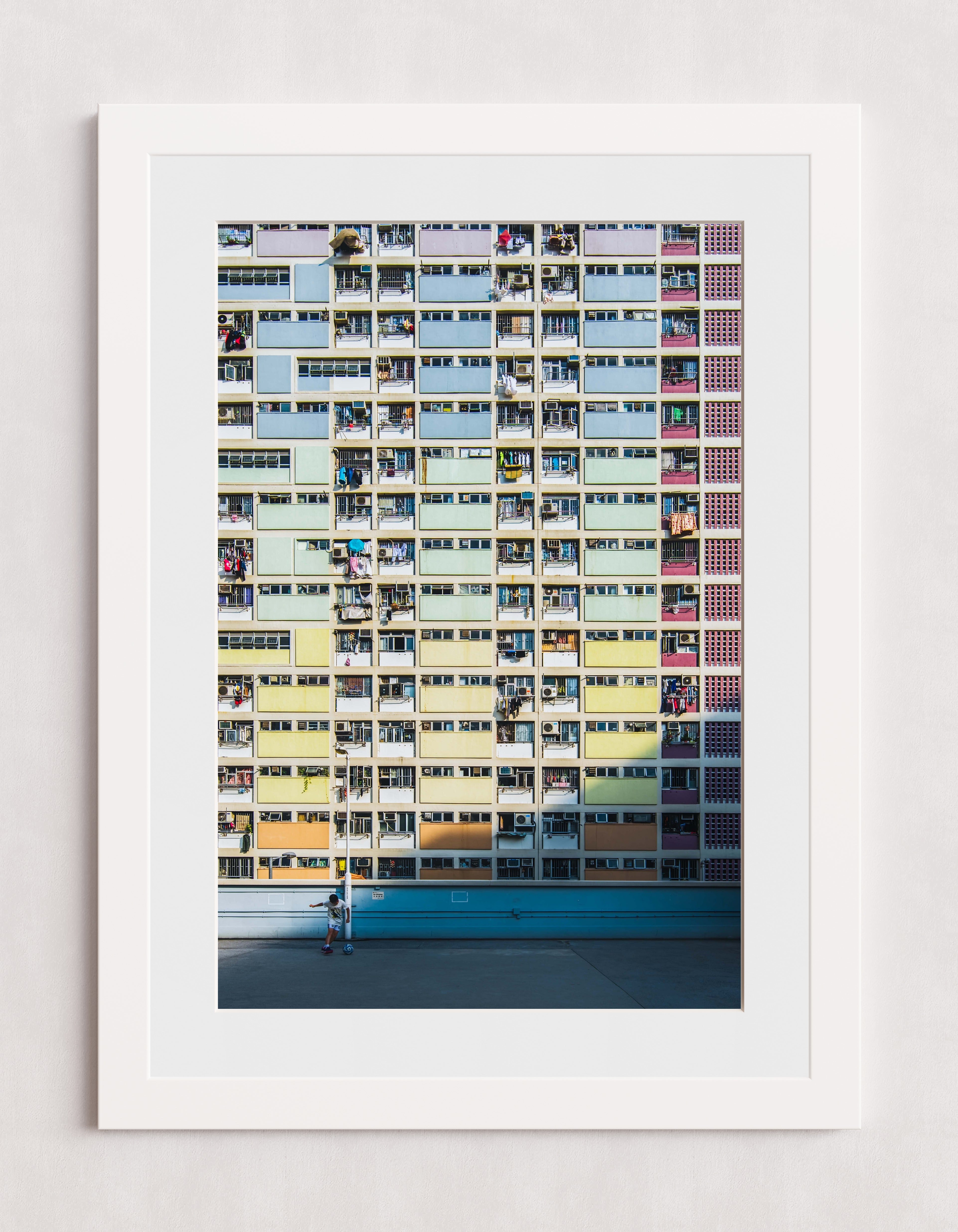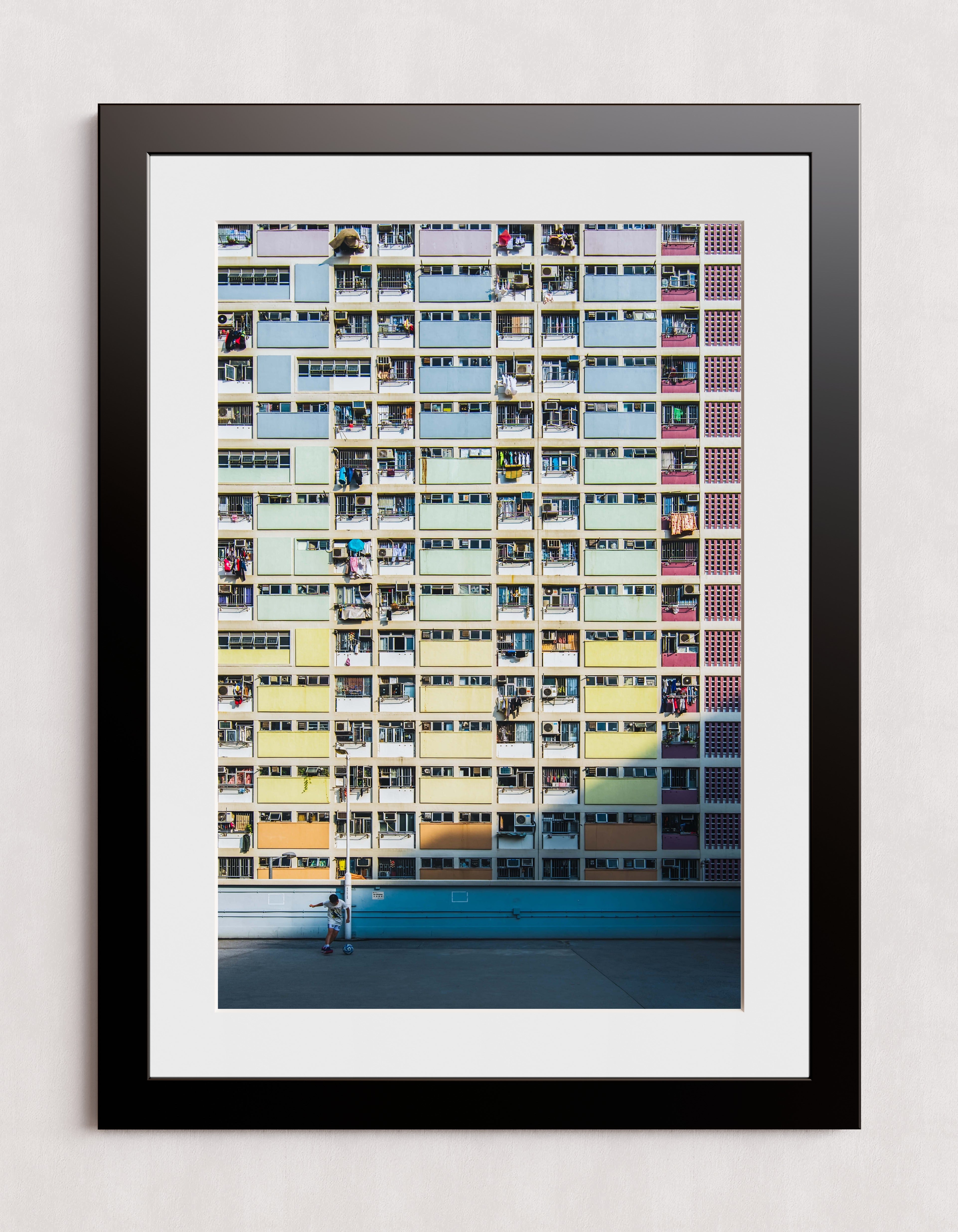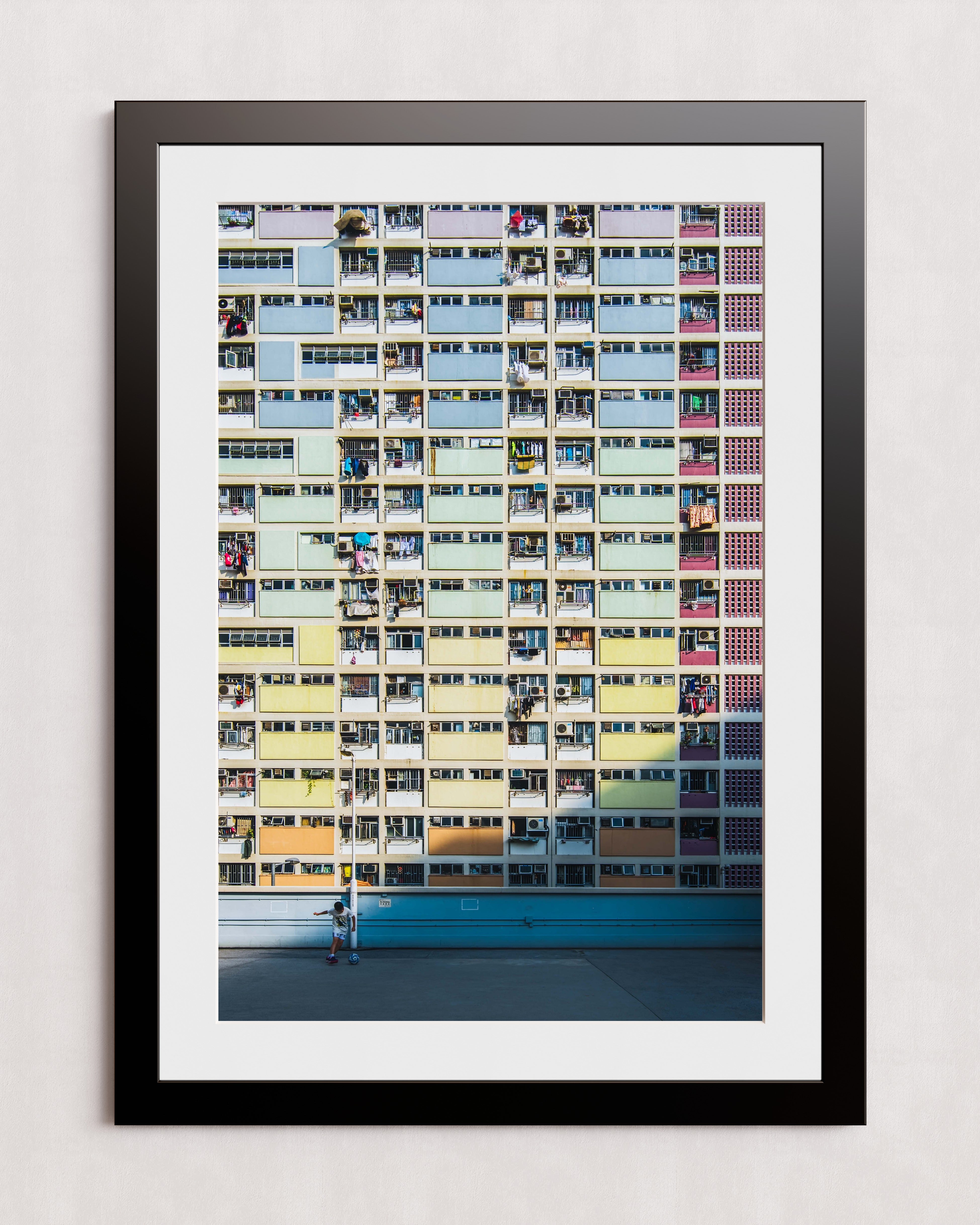 Un immeuble d'appartements aux couleurs chatoyantes, percé de nombreux balcons et fenêtres, domine le paysage. Au premier plan, une personne se tient debout sur une surface en béton baignée de soleil, ce qui accentue l'échelle de la structure imposante.