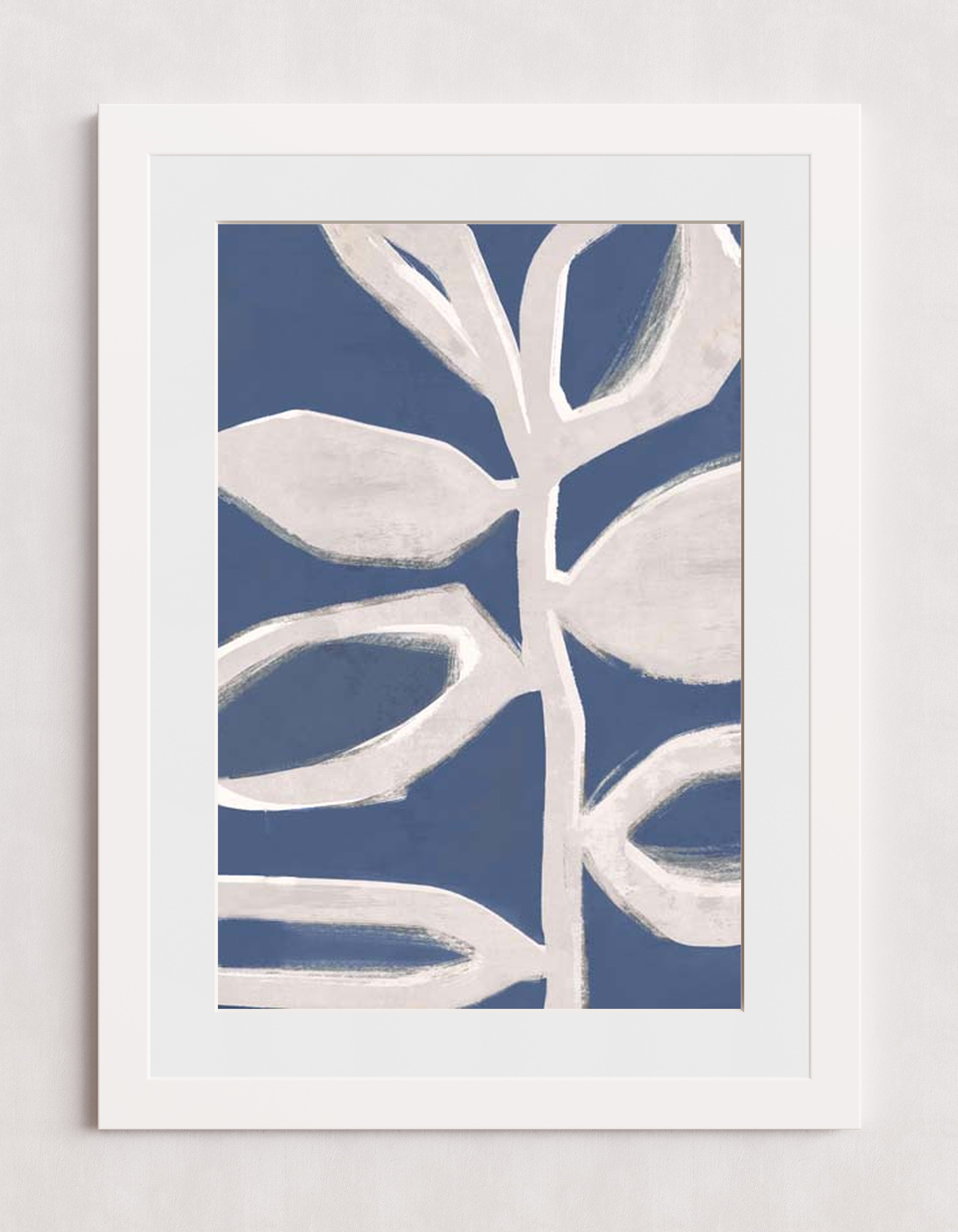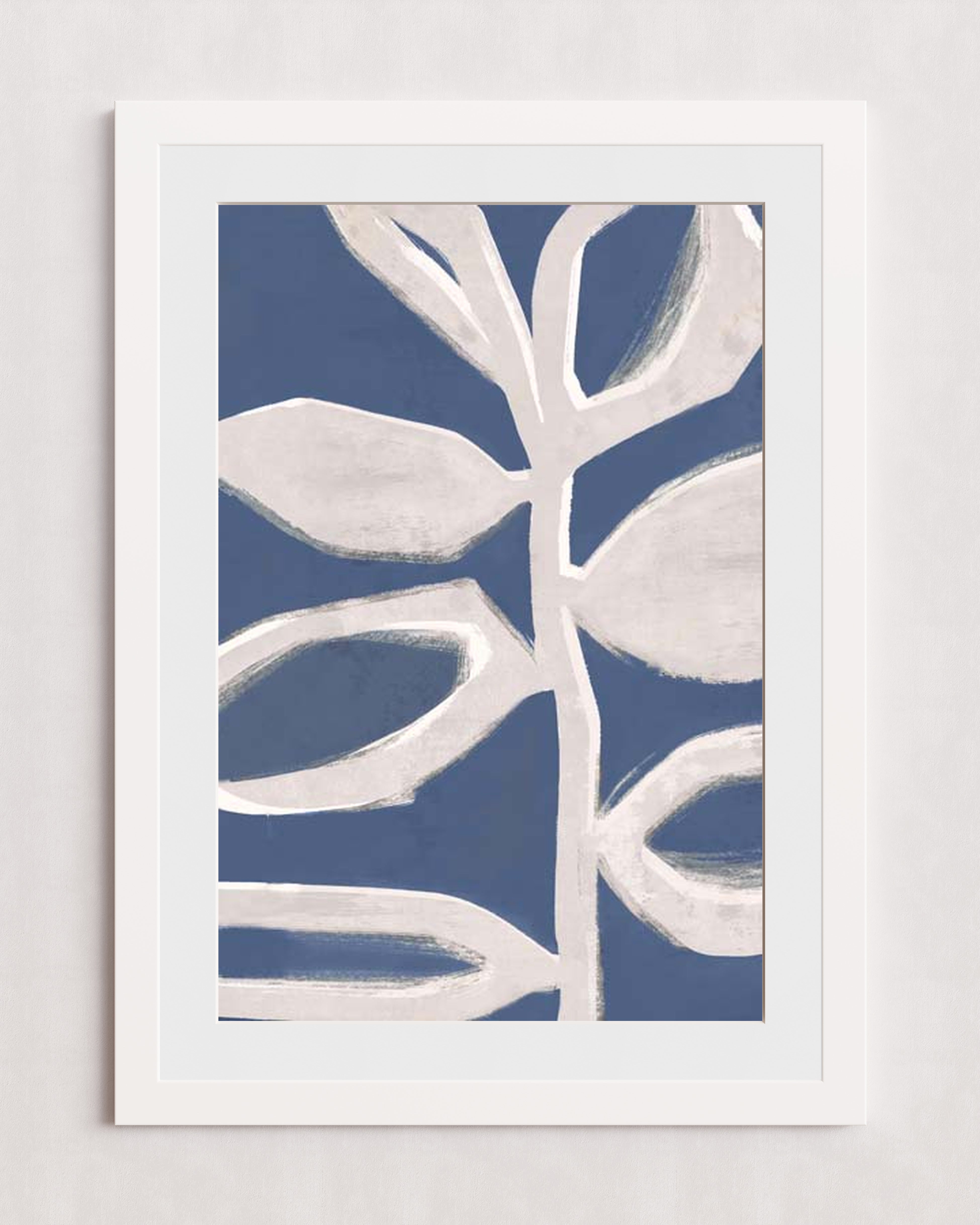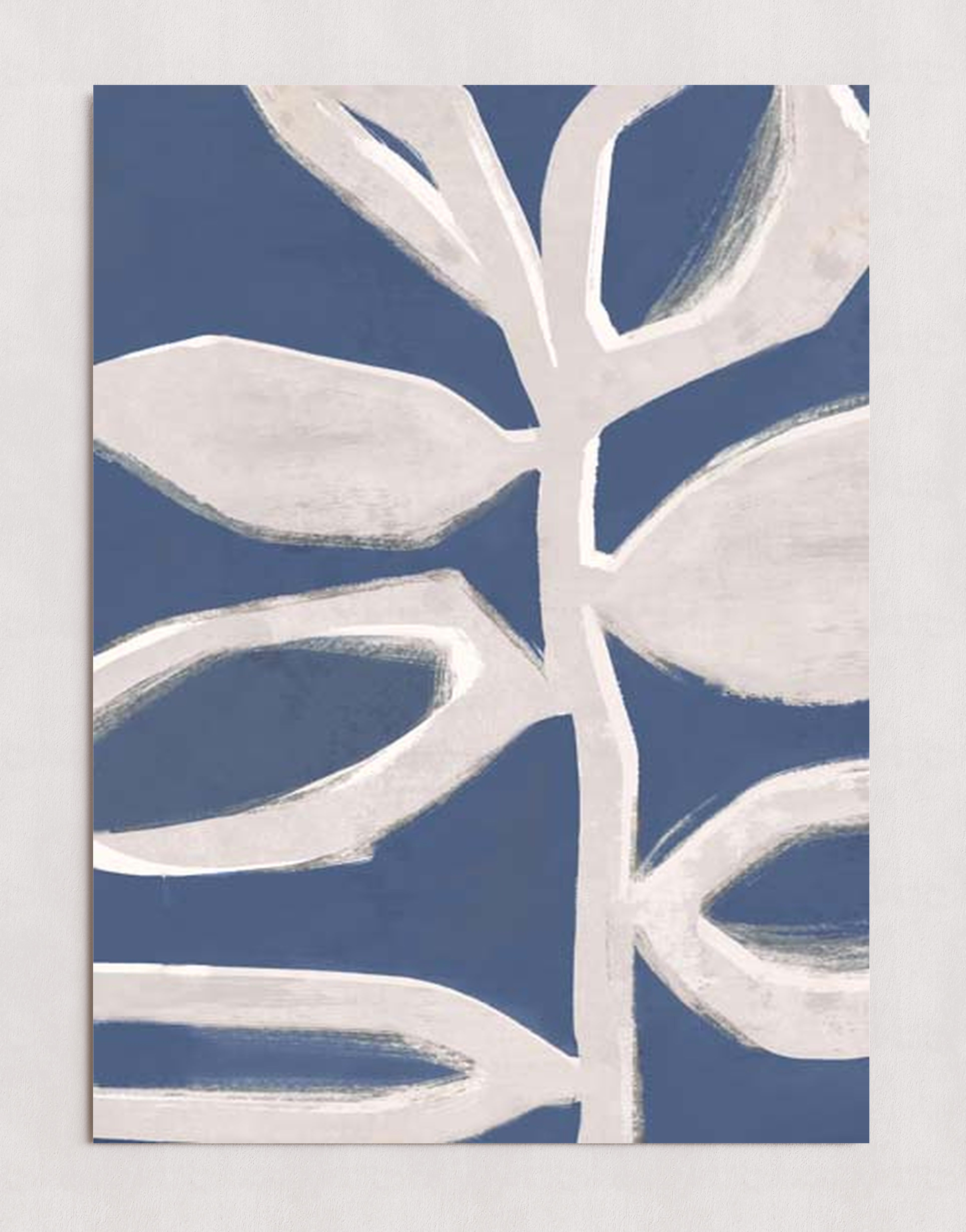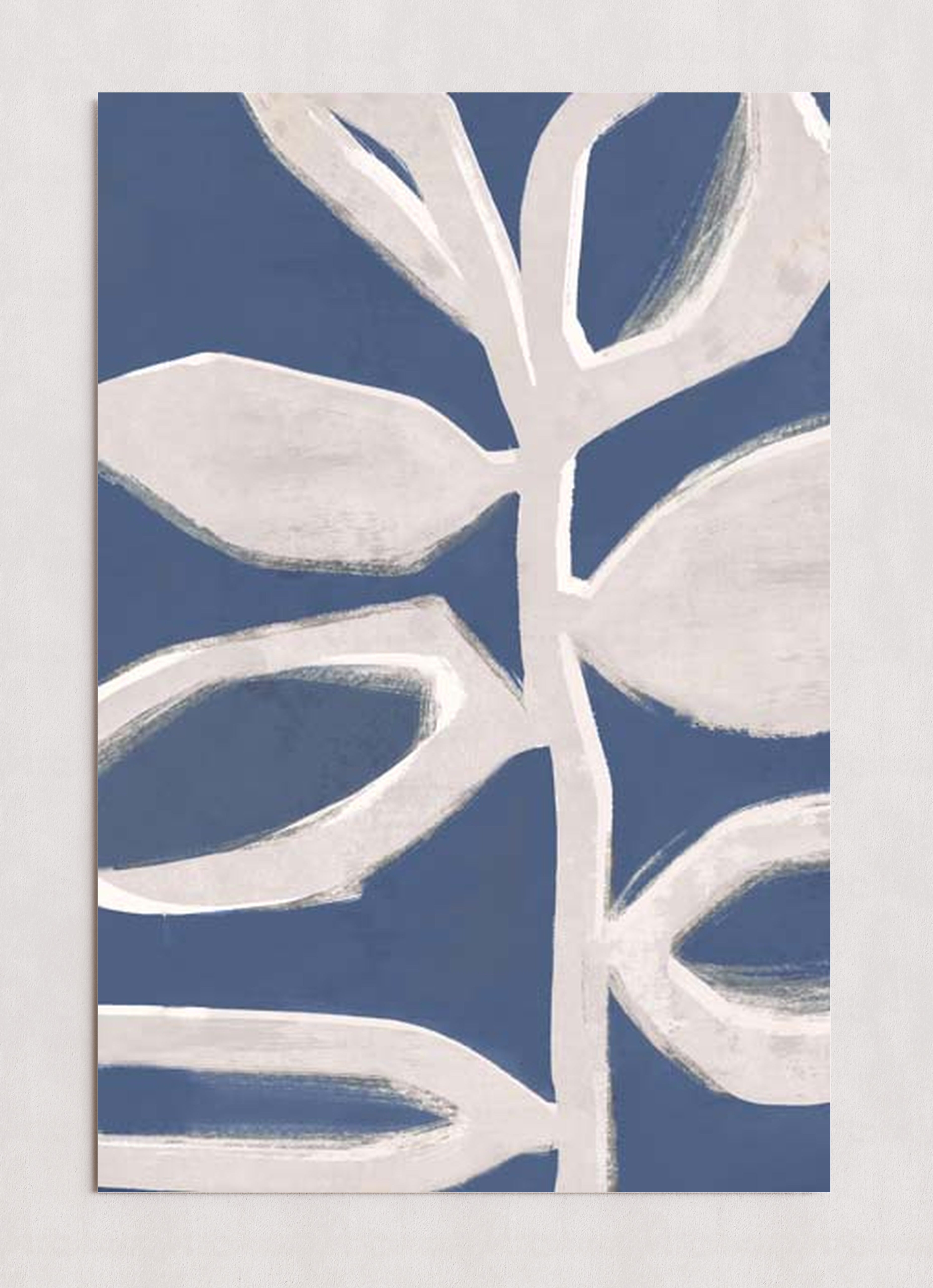 Illustration abstraite de feuilles blanches stylisées sur fond bleu clair. Le design met l'accent sur la simplicité et l'esthétique moderne, avec des textures de coups de pinceau audacieux.