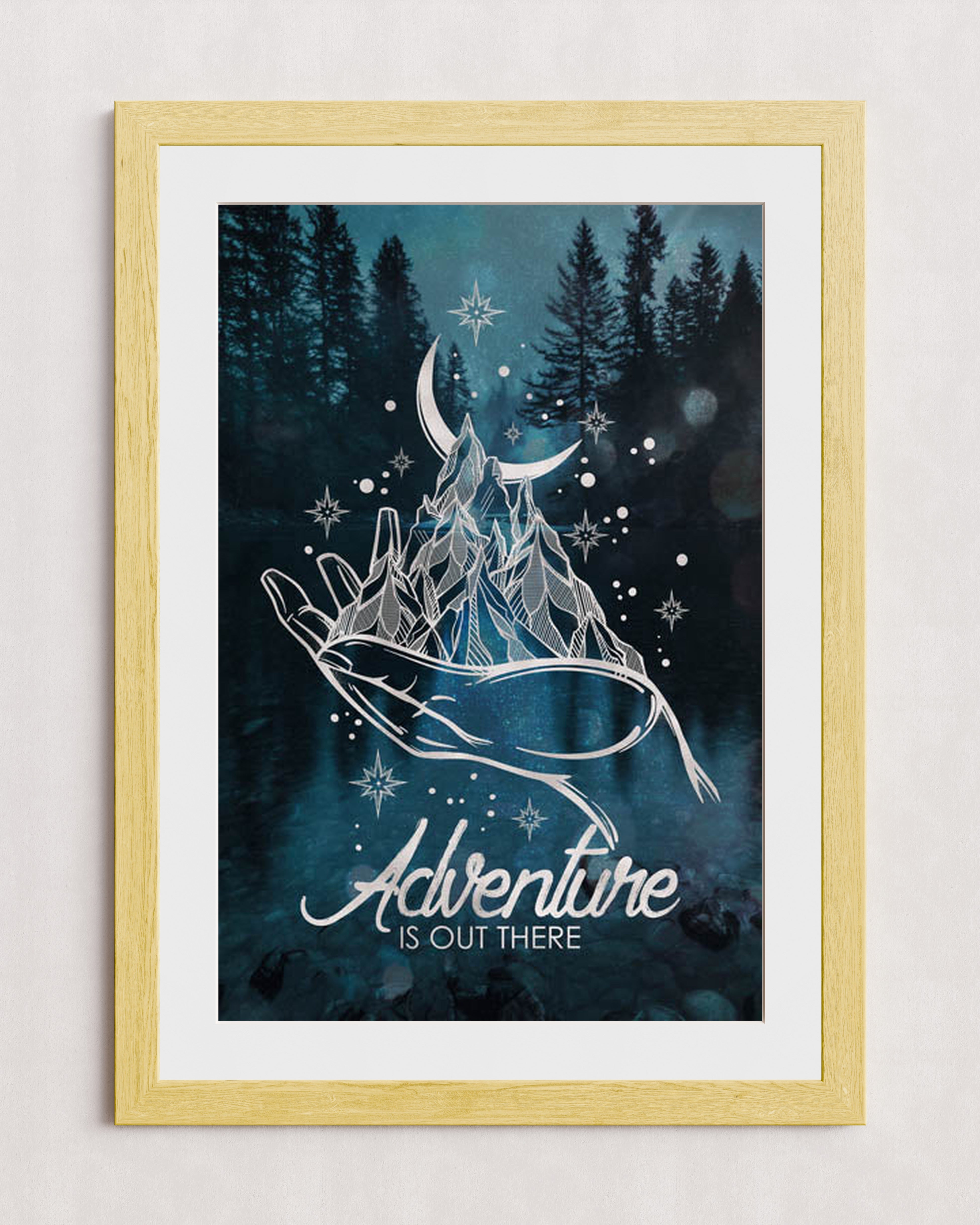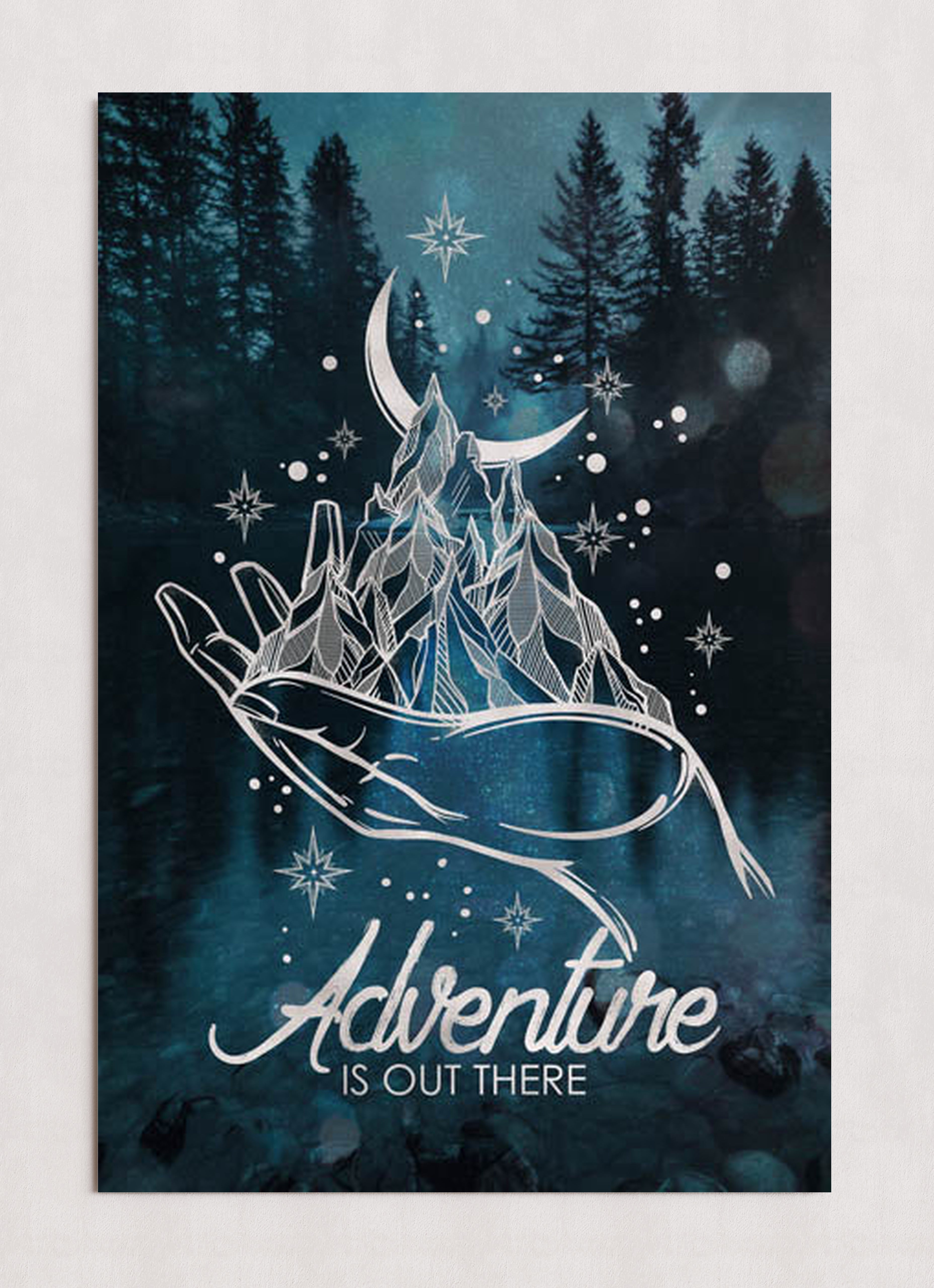 A stylized illustration of mountains cradled in an open hand, set against a serene forest and lake backdrop. The text 'Adventure is out there' is prominently displayed in artistic typography.