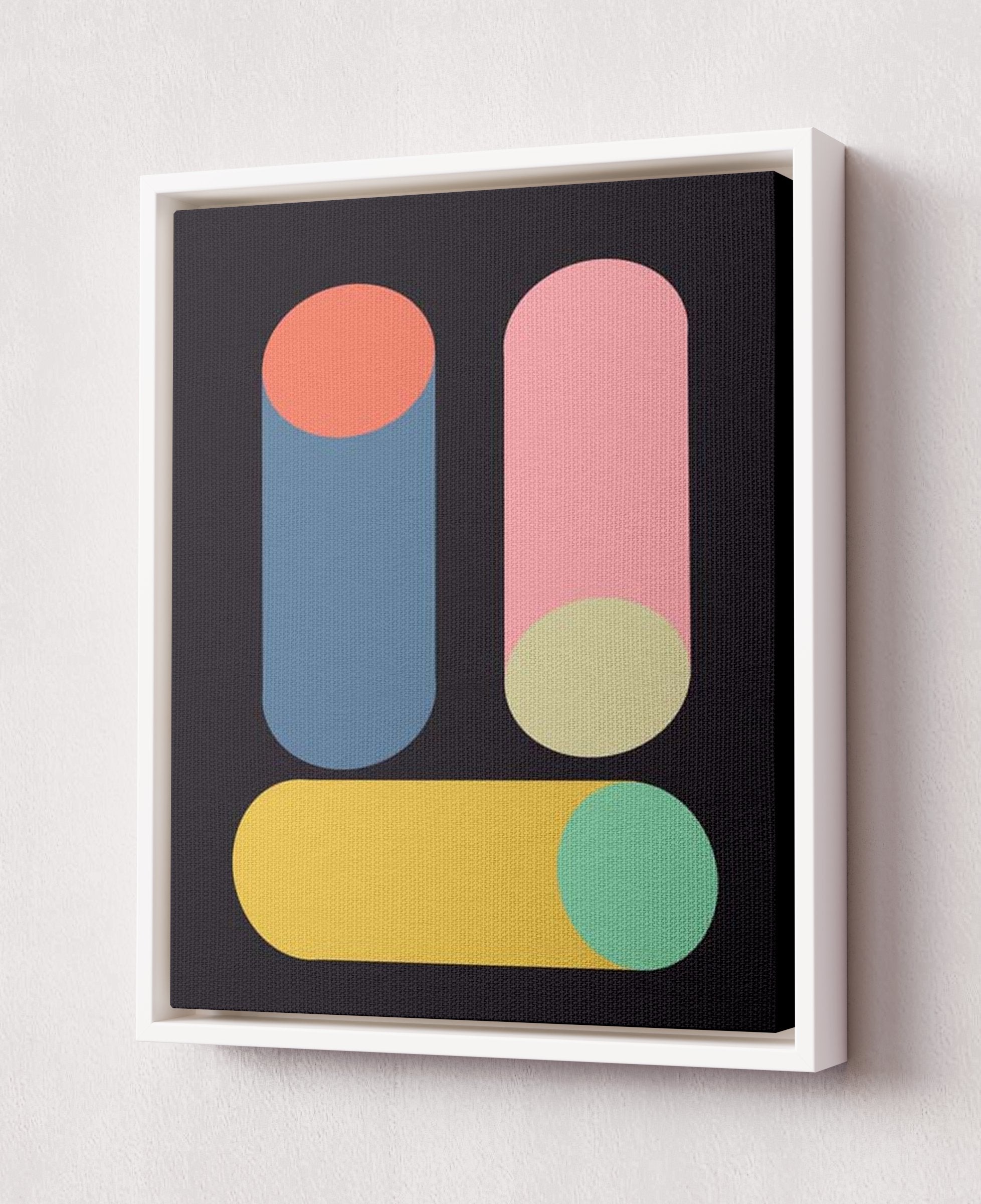 Un design minimaliste composé de trois formes cylindriques aux couleurs vives sur fond sombre. Ces formes, aux nuances de bleu, rose, jaune et vert, sont disposées verticalement et horizontalement.