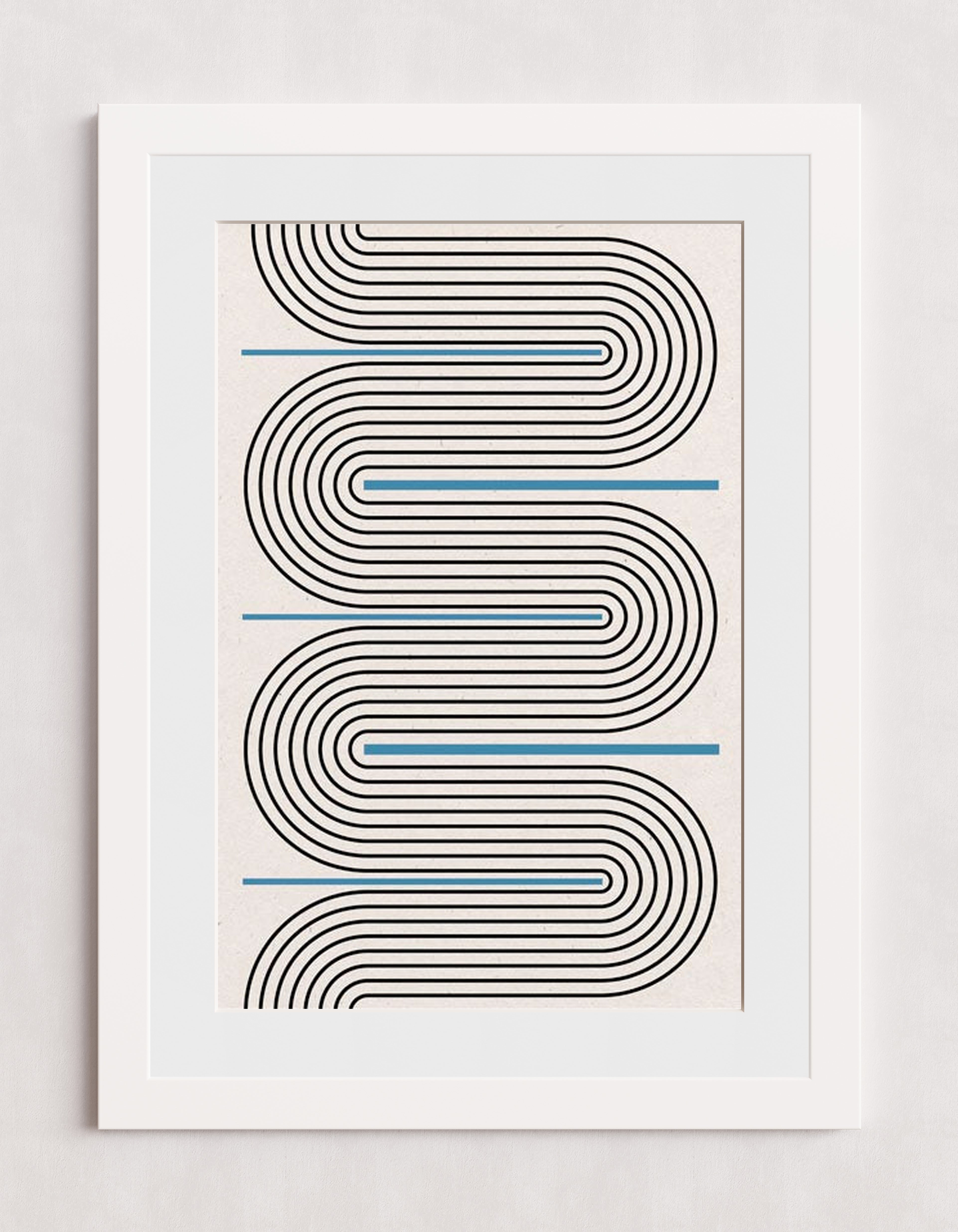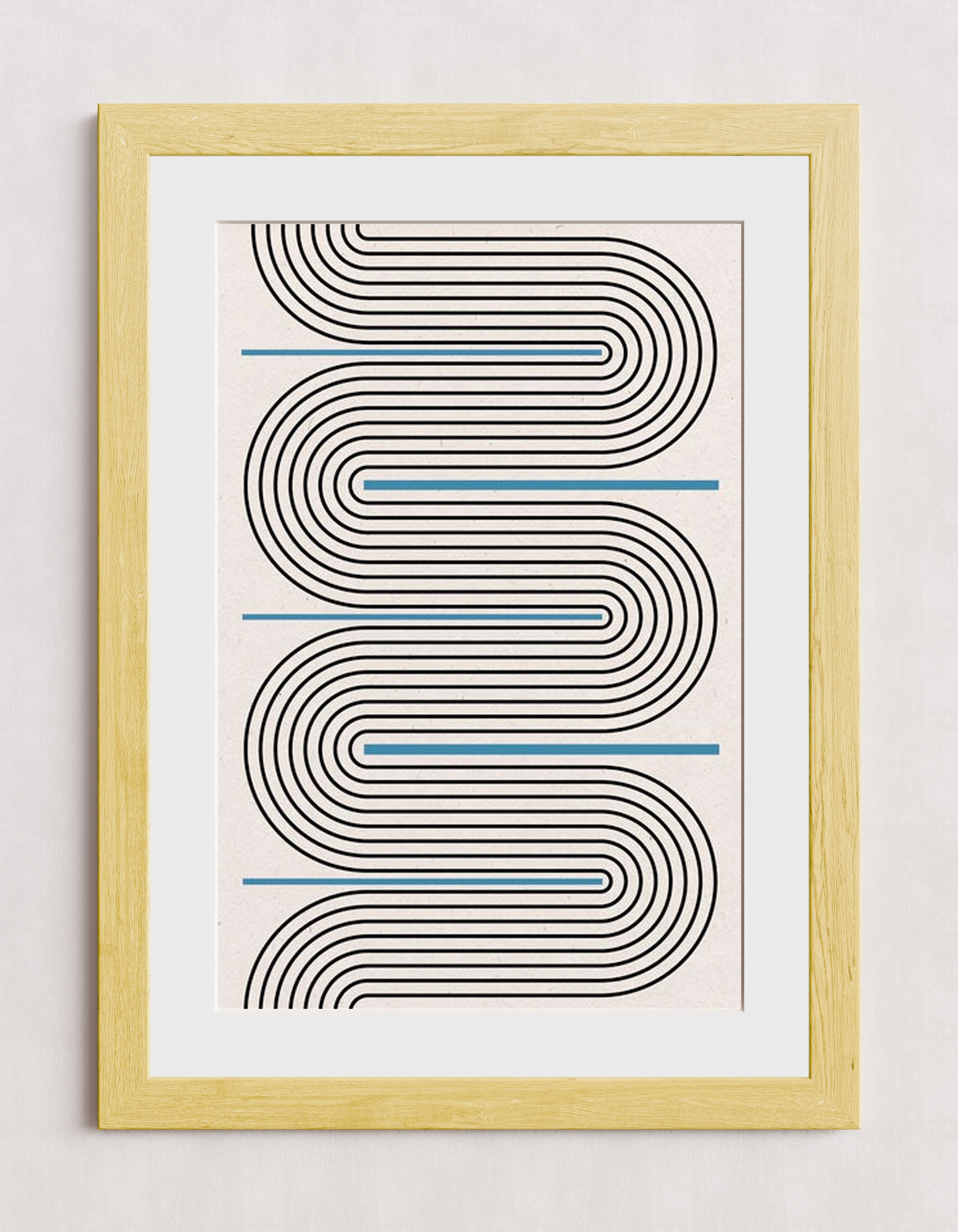 A minimalist abstract design featuring a series of black curved lines forming a continuous wave-like pattern. Thin blue horizontal lines are interspersed for contrast, creating a modern and clean aesthetic.
