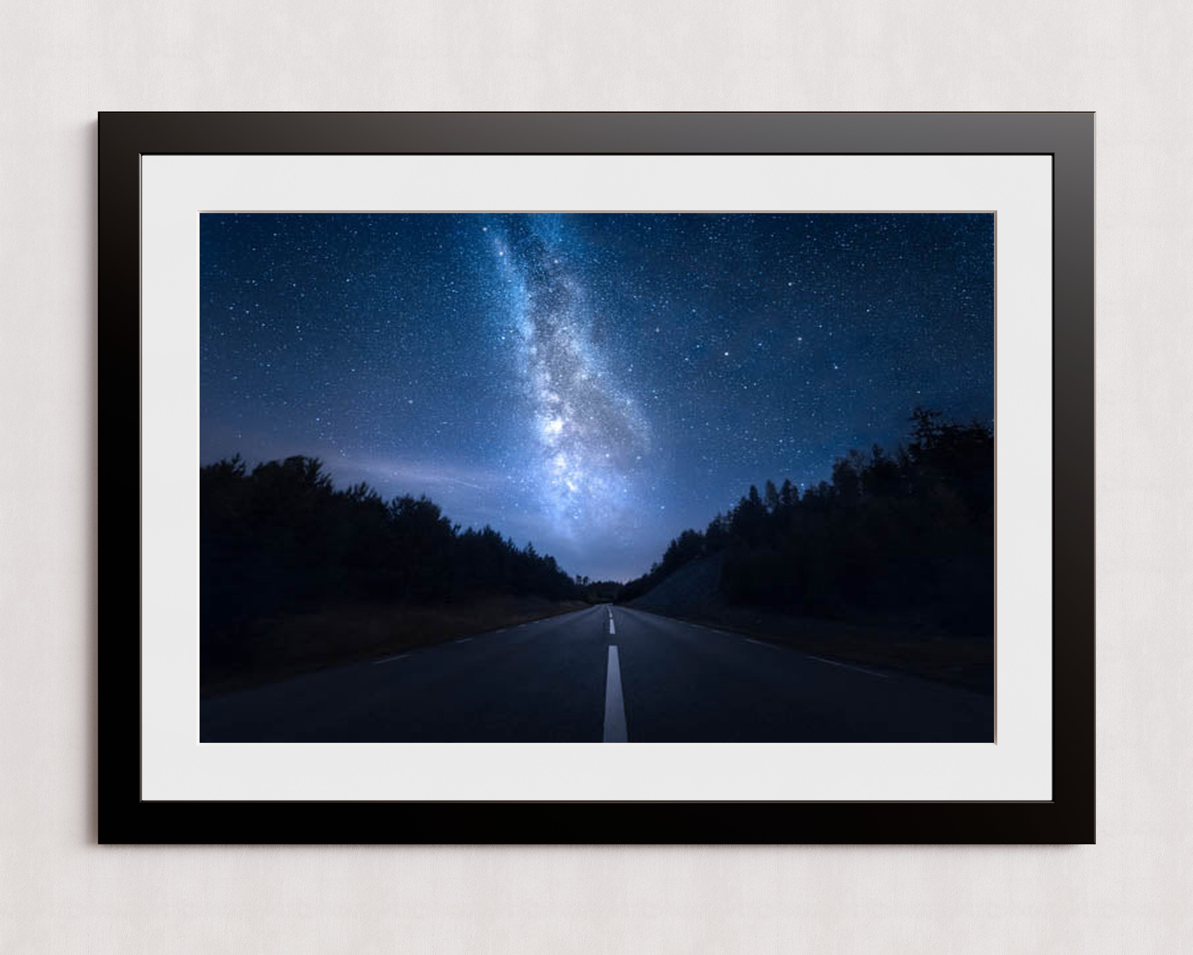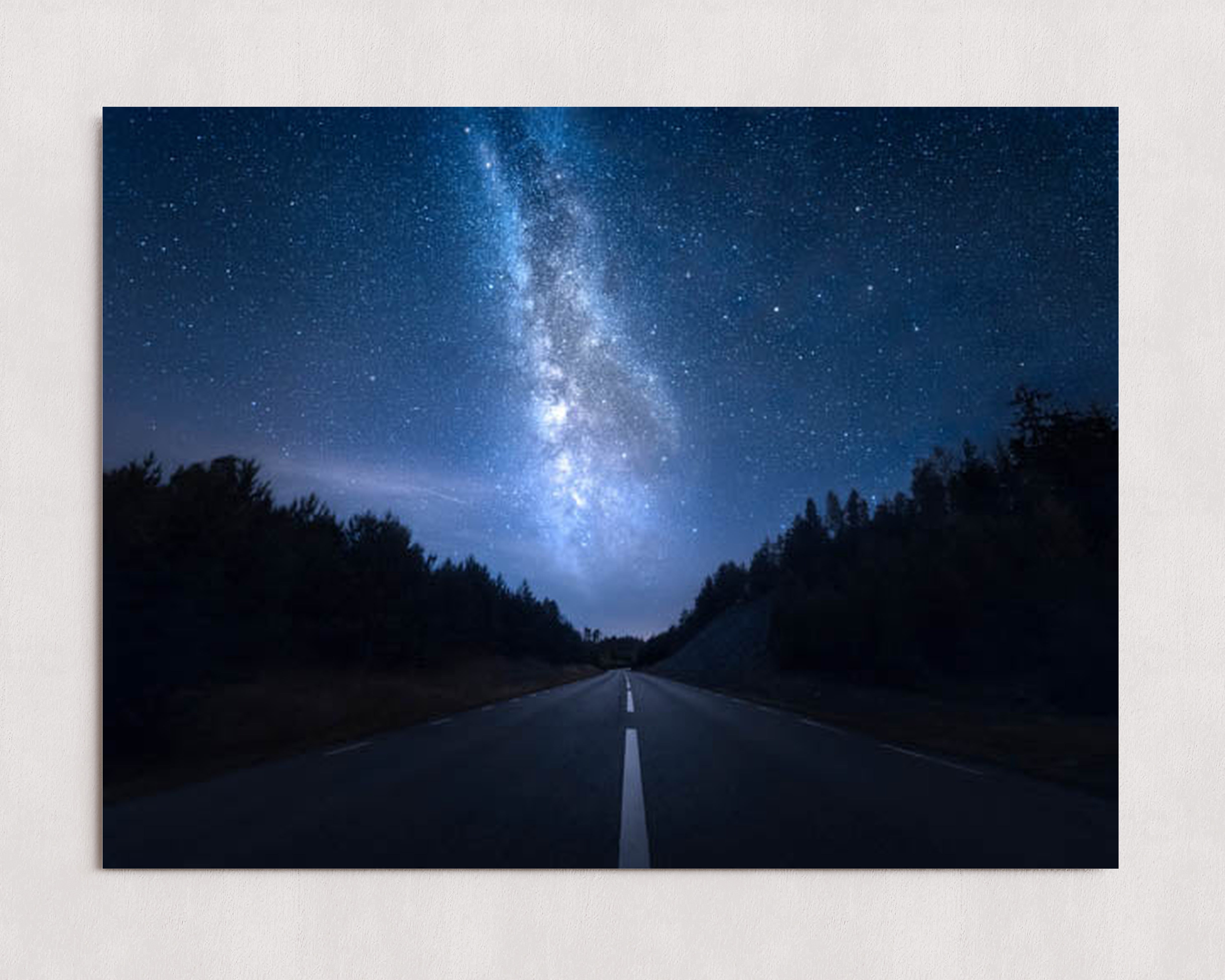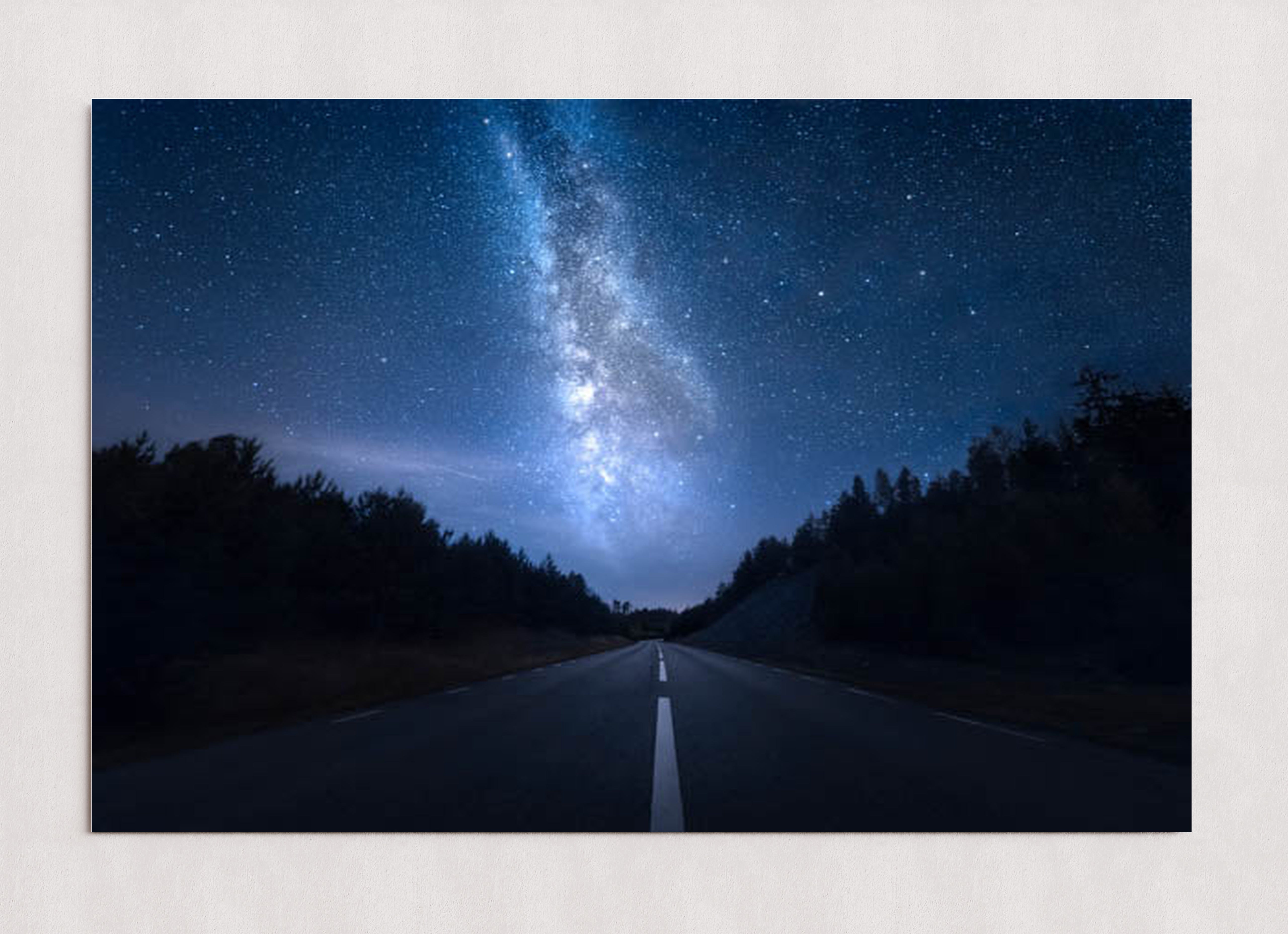 Une scène nocturne sereine où une route déserte s'étend à perte de vue sous la Voie lactée aux couleurs éclatantes. Le ciel, constellé d'innombrables étoiles, offre un spectacle céleste à couper le souffle.