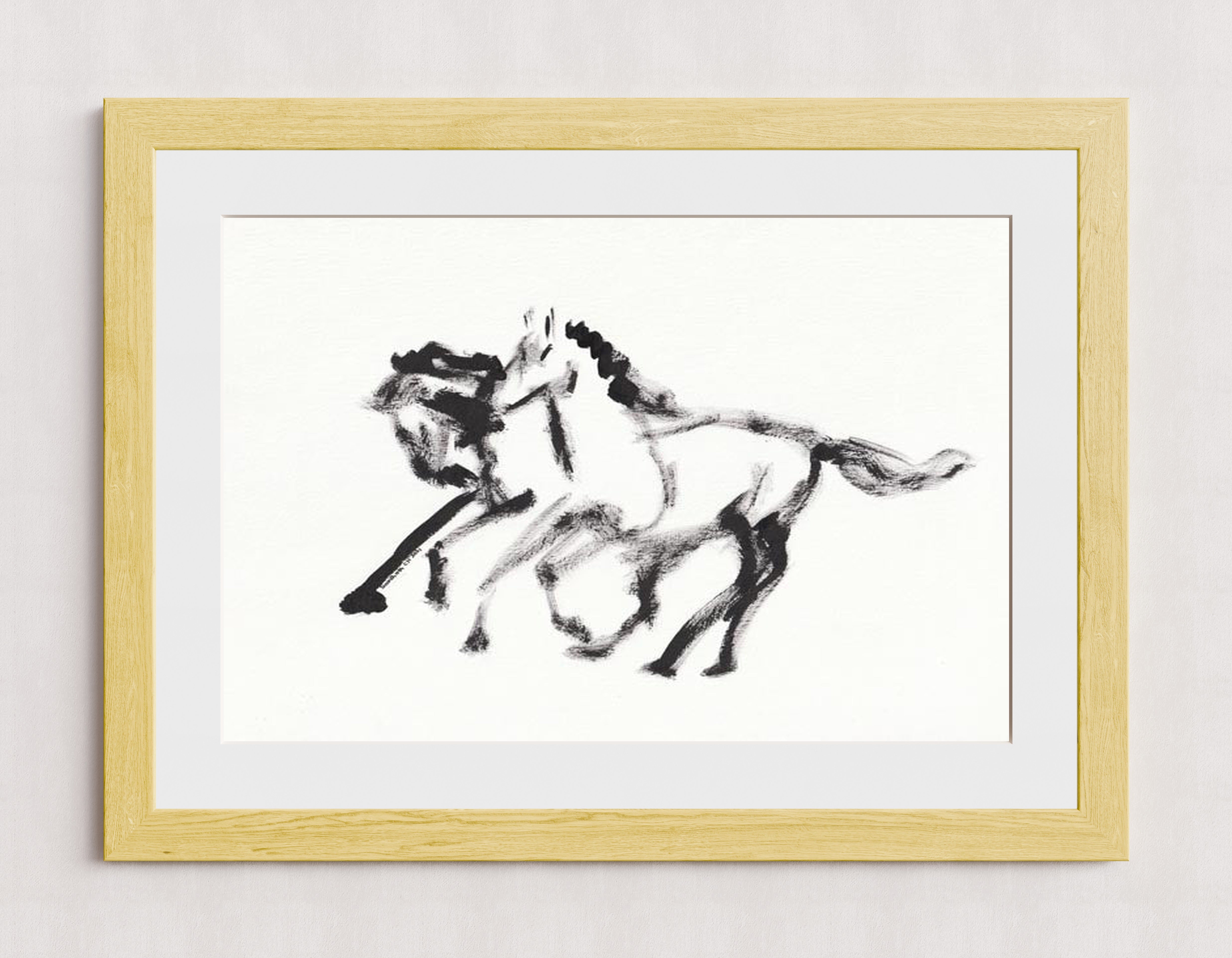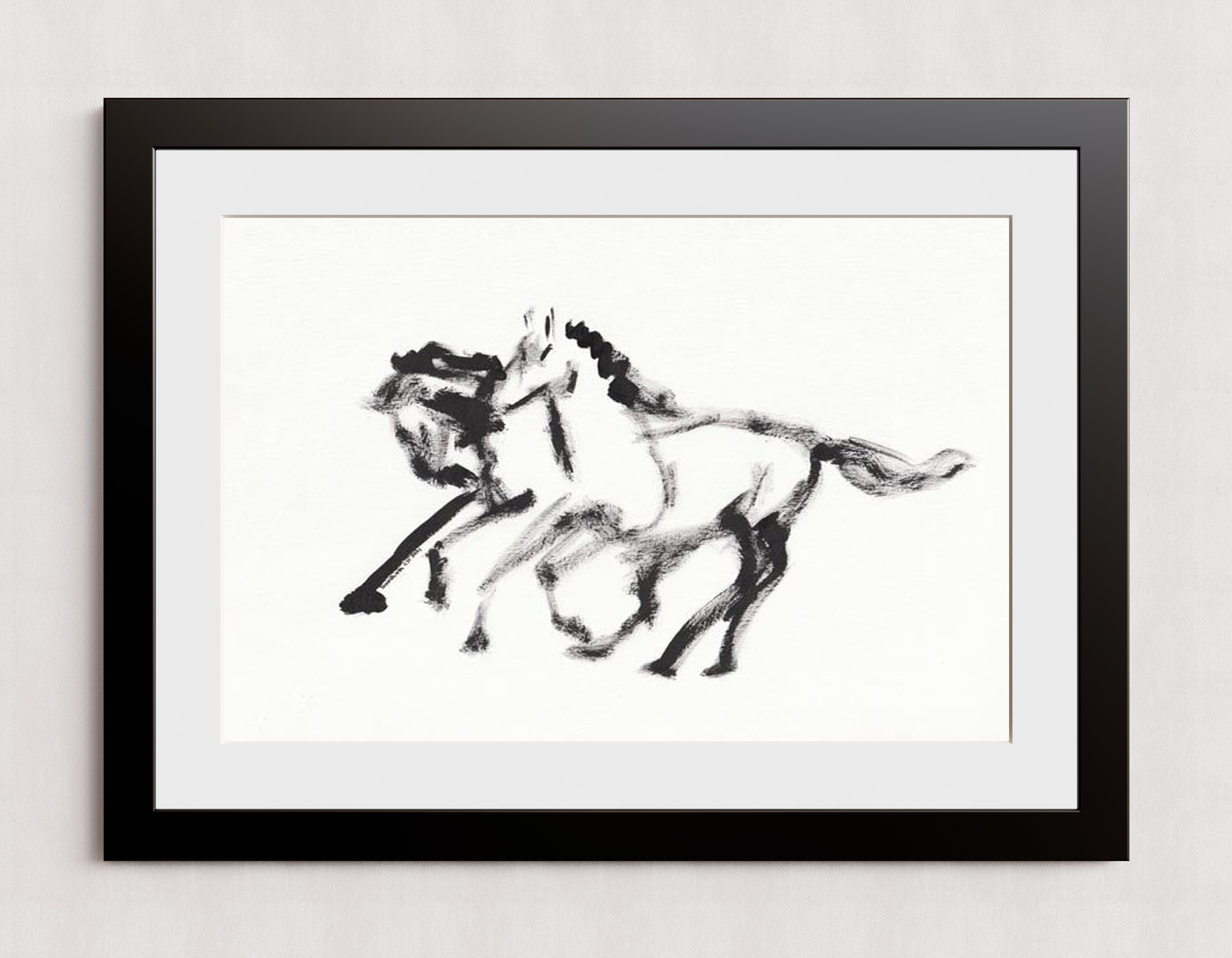 A dynamic abstract illustration of horses created with black ink strokes on a white background. The artwork captures movement and energy through expressive brushwork.