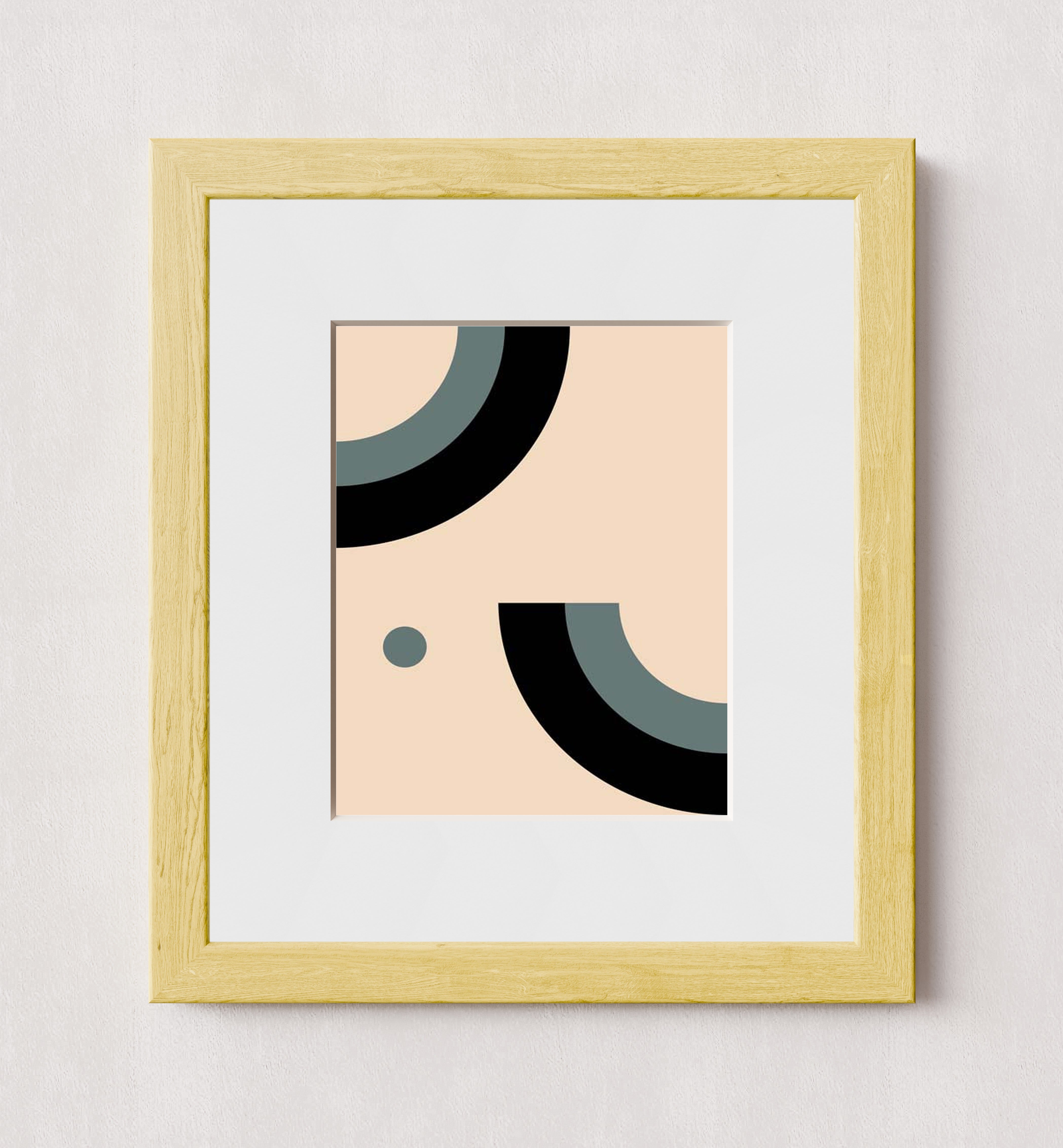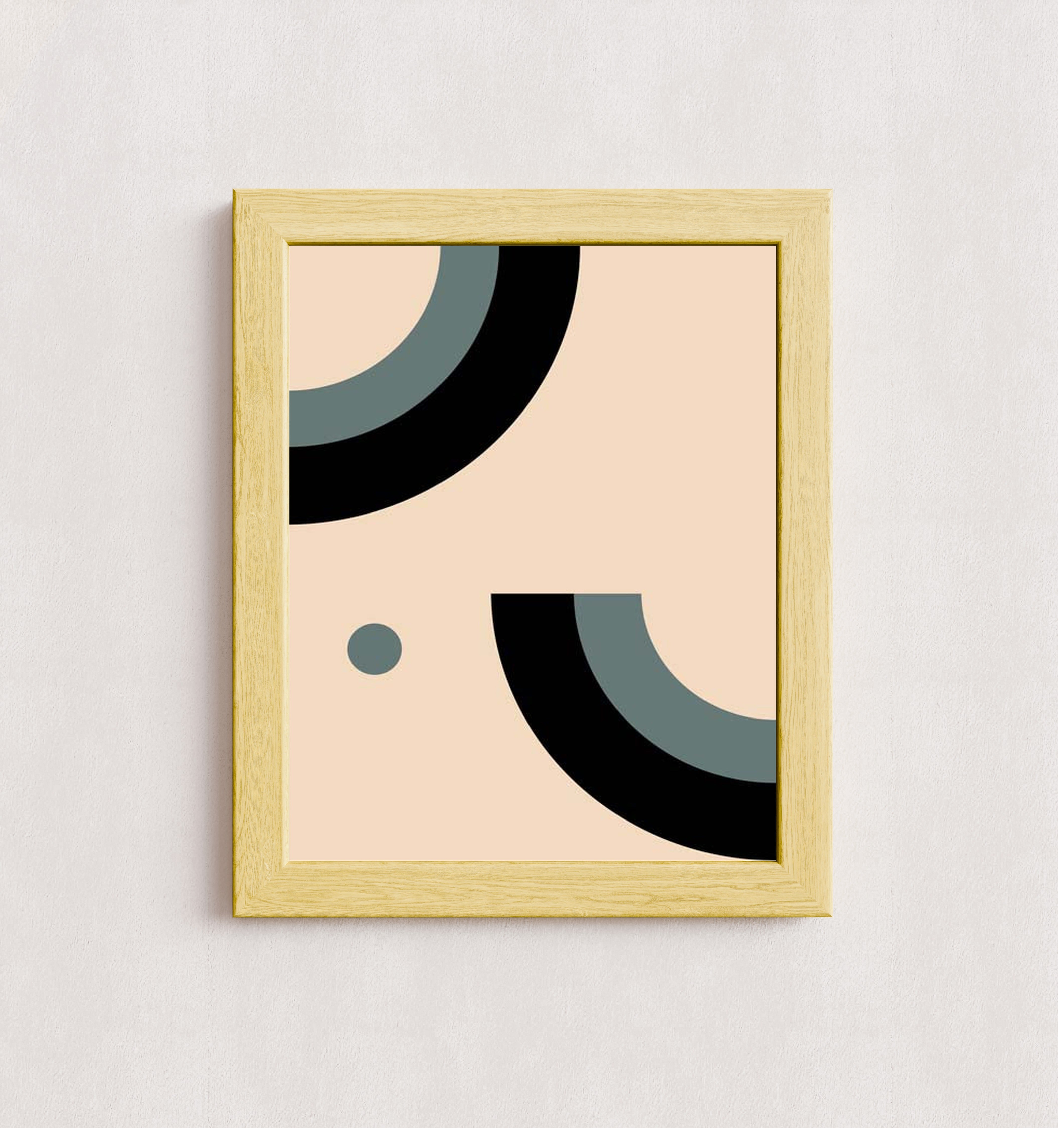 A minimalist abstract artwork featuring bold black and gray semi-circles and a dot on a beige background. The design emphasizes clean lines and geometric shapes, creating a modern and sophisticated aesthetic.