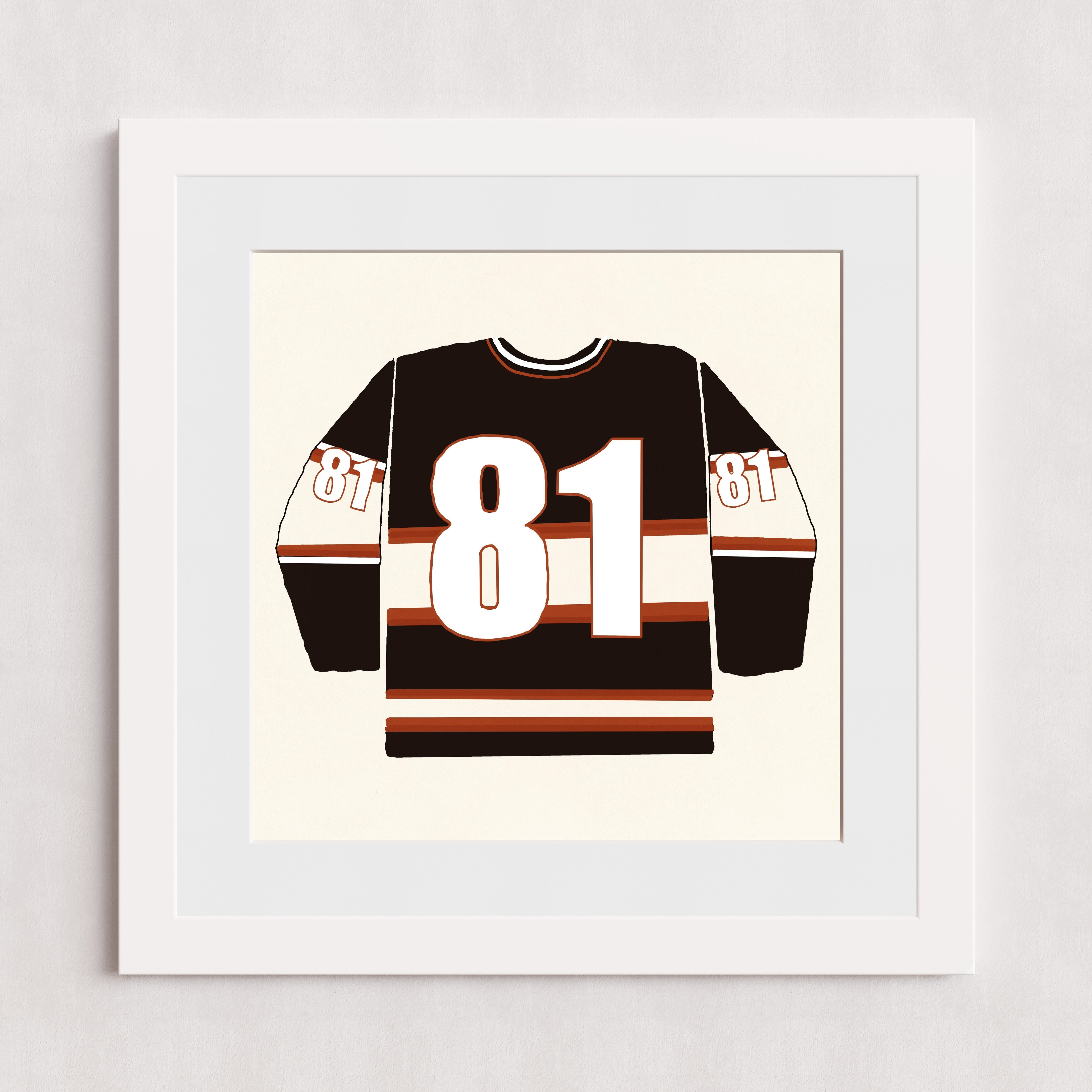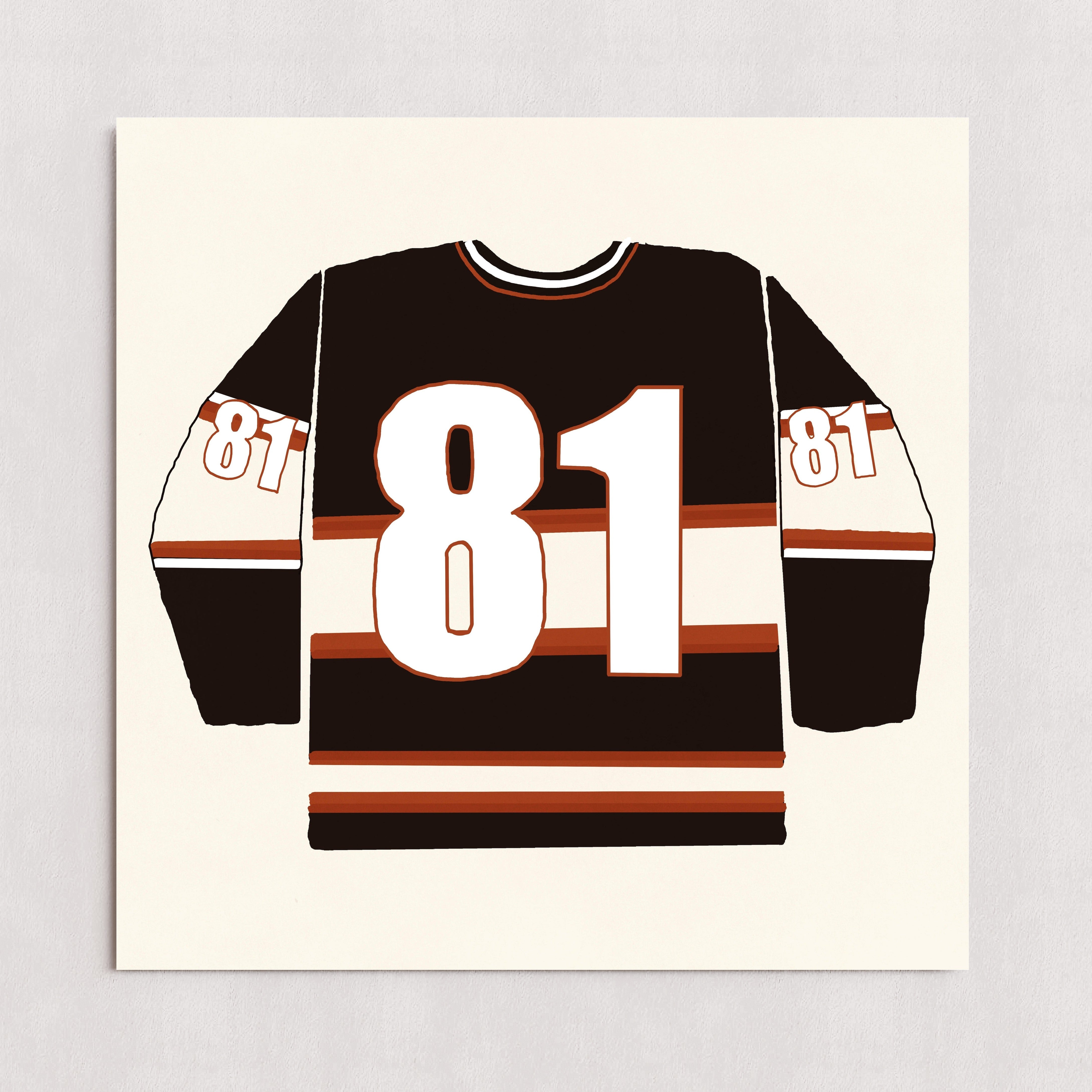 An illustration of a hockey jersey inspired by the hit show Heated Rivalry. It features a bold number 81 on the front and sleeves. The jersey is primarily black with white and brown horizontal stripes across the chest and arms.