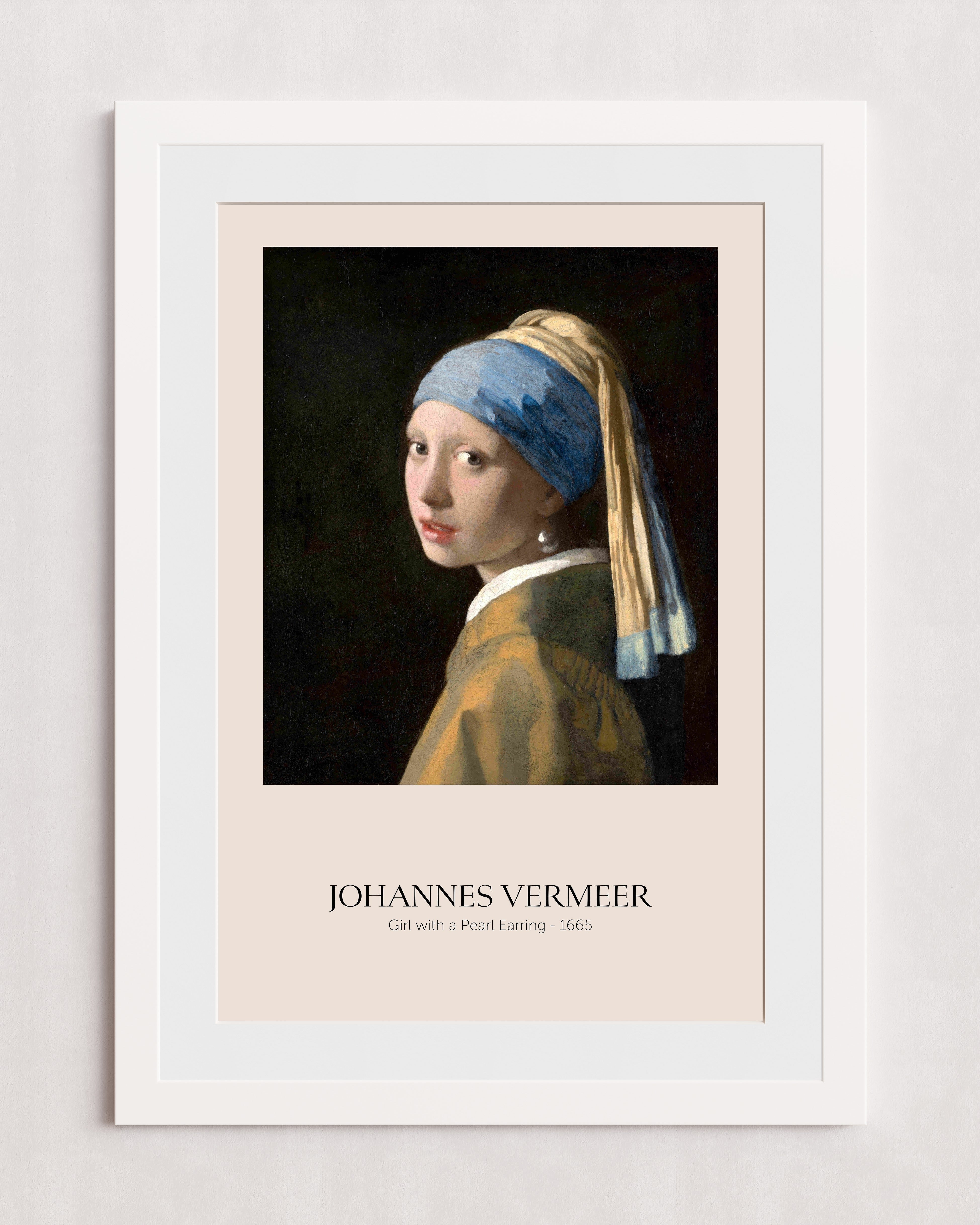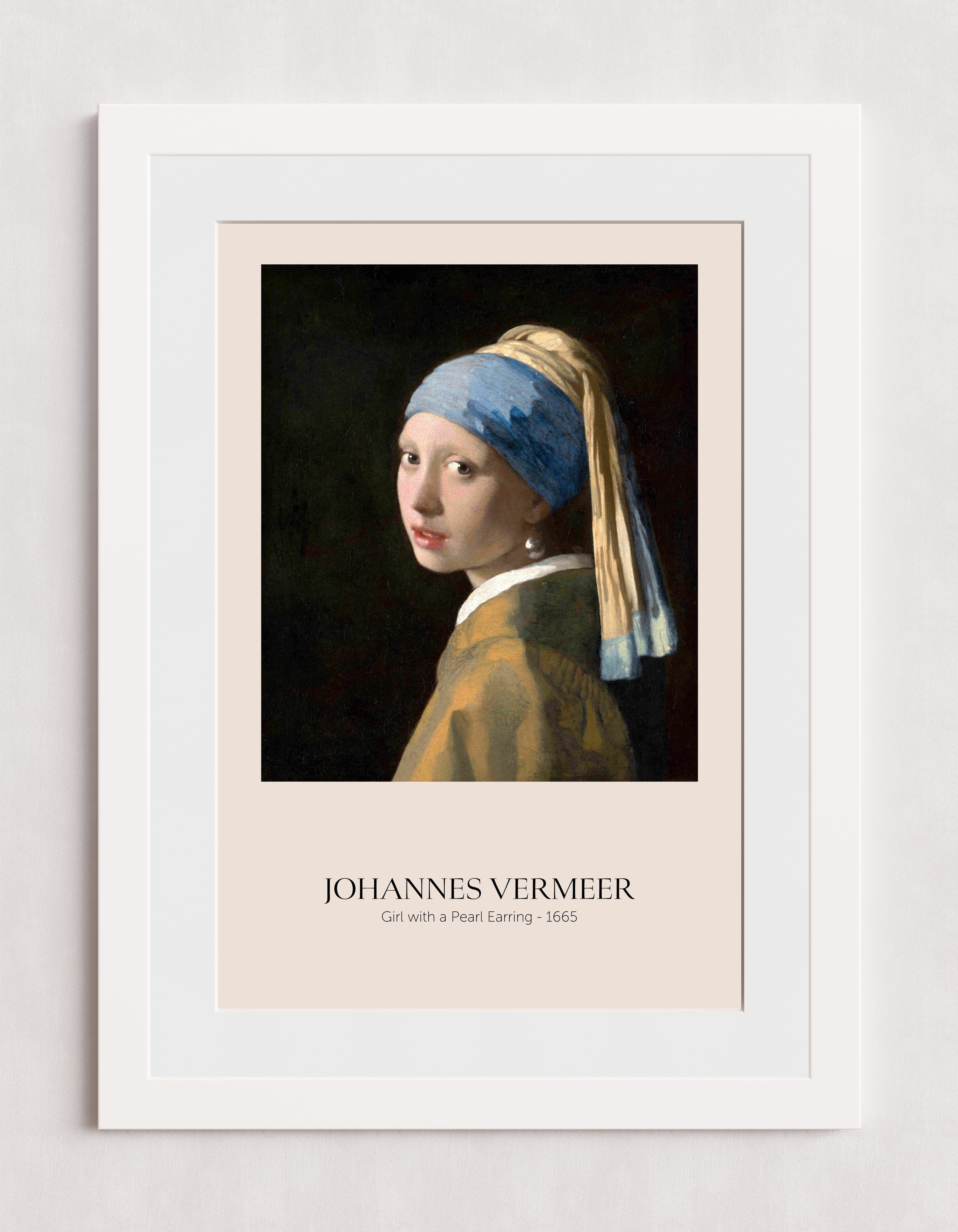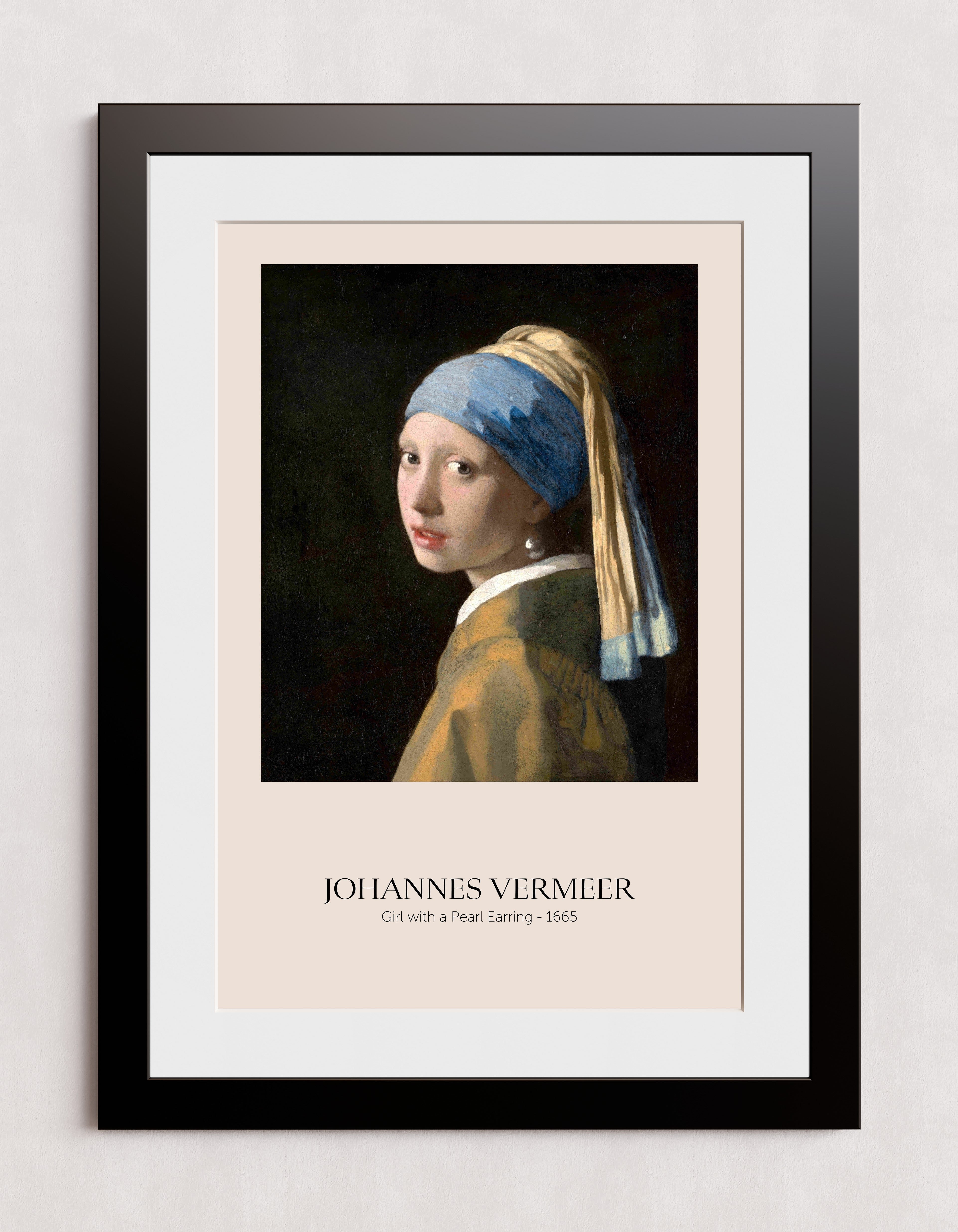 Une œuvre classique intitulée « La Jeune Fille à la perle » de Johannes Vermeer, réalisée en 1665. Le tableau représente une jeune femme coiffée d'un foulard bleu et or et portant une boucle d'oreille en perle. Le fond sombre met en valeur la tenue et les accessoires du sujet.