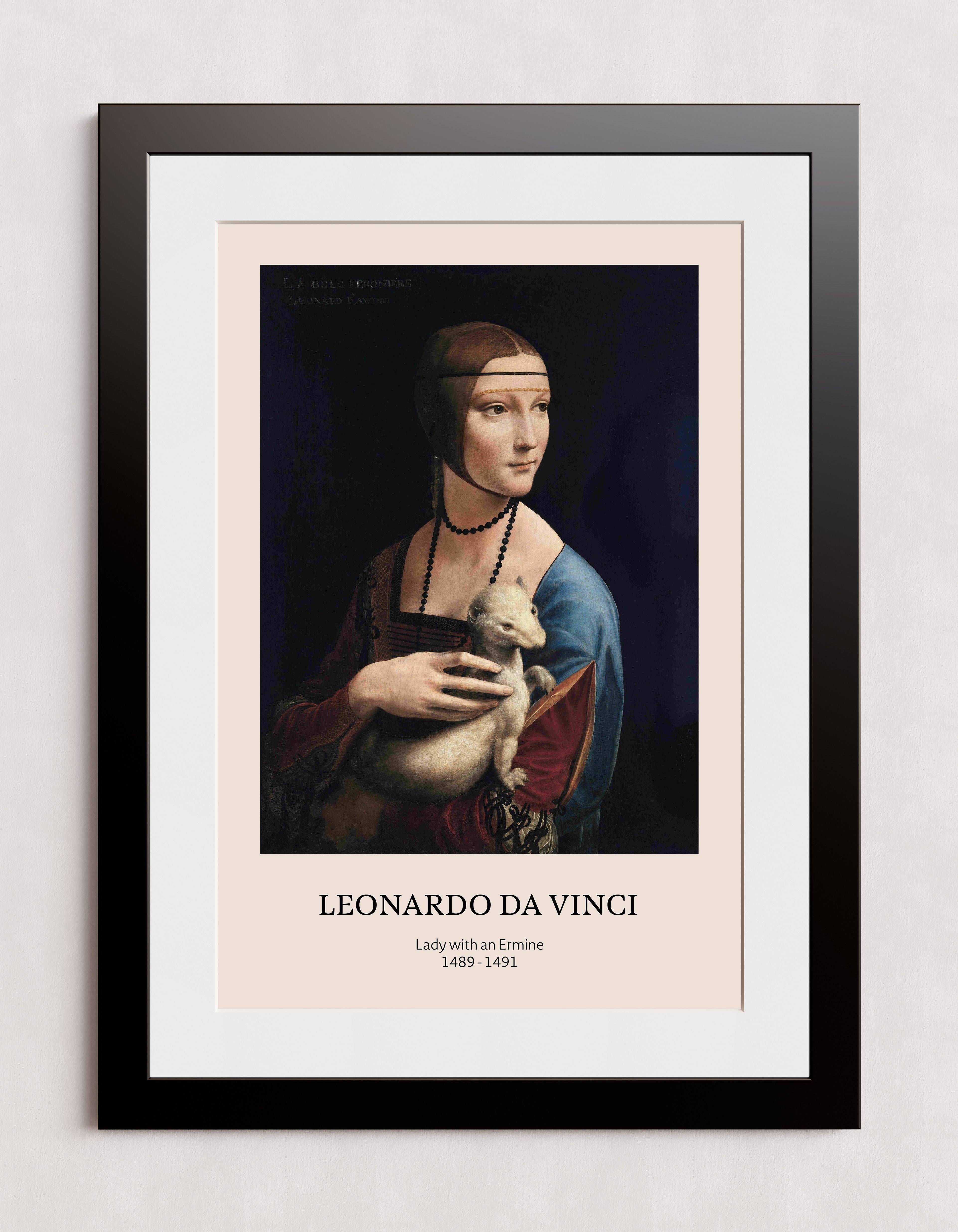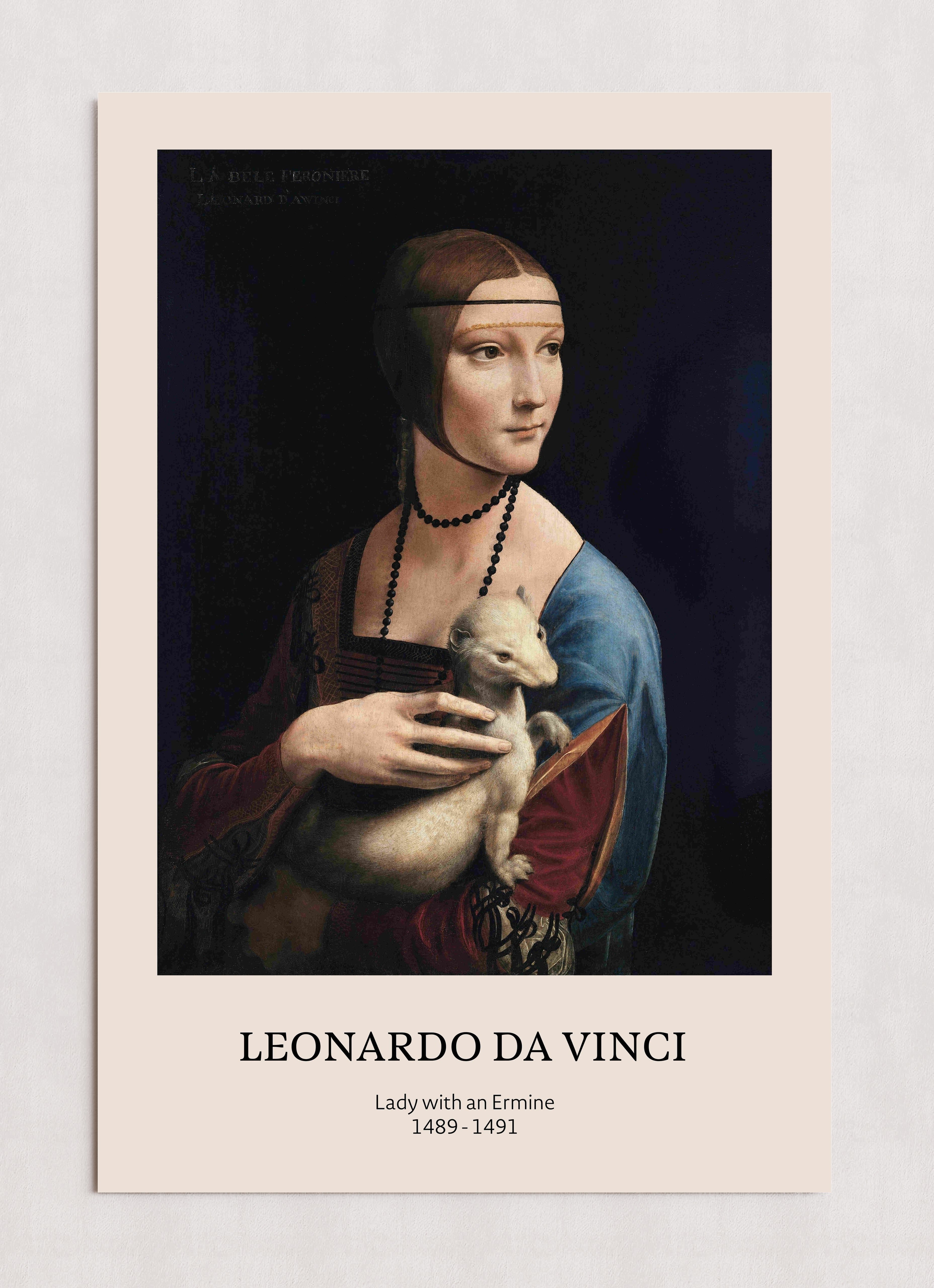 Un tableau classique de la Renaissance de Léonard de Vinci, intitulé « Dame à l'hermine » (1489-1491). L'œuvre représente une femme élégamment vêtue tenant une hermine, sur un fond sombre. Le texte sous l'image mentionne le nom de l'artiste, le titre et la date du tableau.
