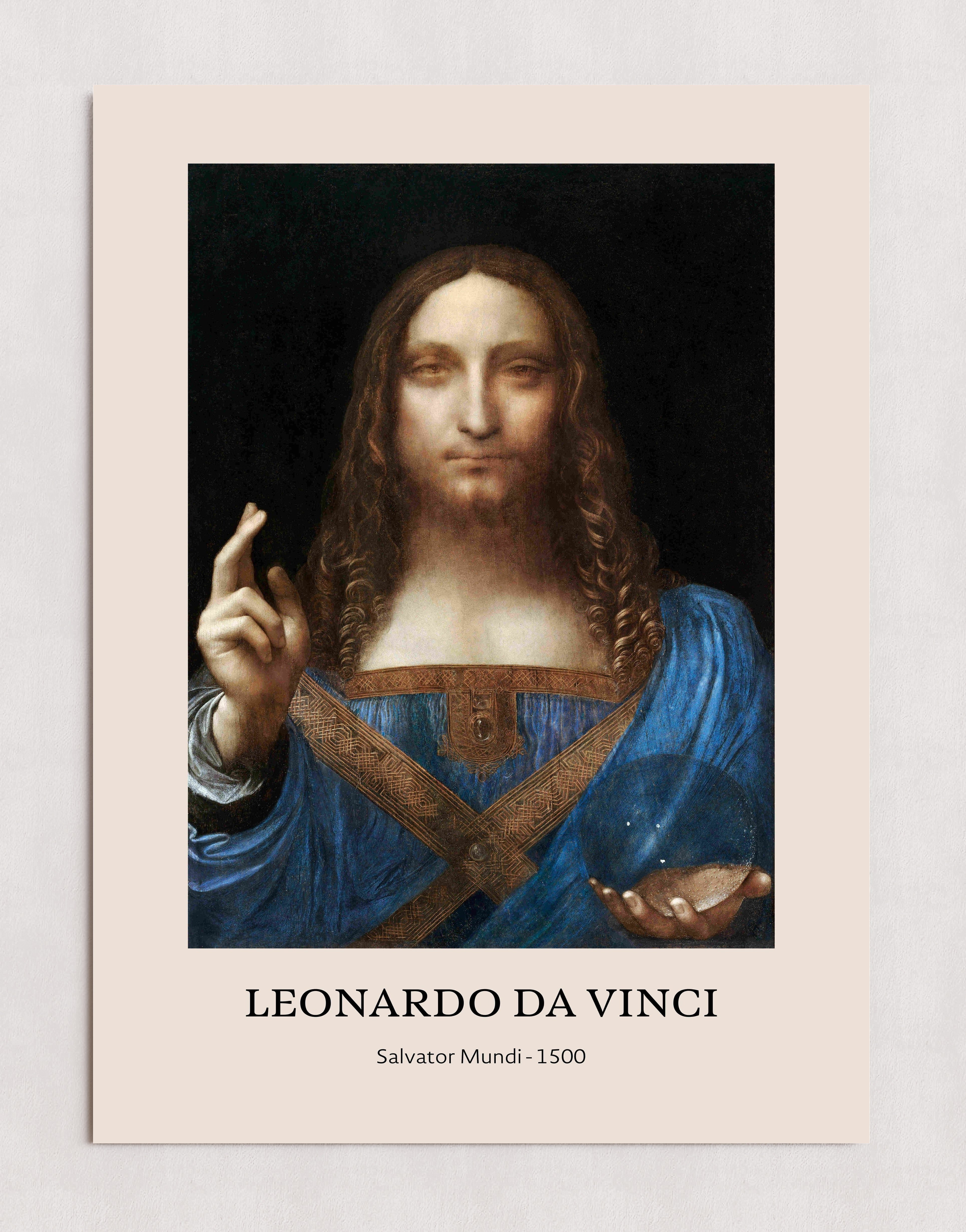 Un tableau historique intitulé « Salvator Mundi » de Léonard de Vinci, réalisé en 1500. L'œuvre présente des détails minutieux, notamment une robe bleue ornée de dorures et un globe de cristal tenu dans la main gauche. Le fond sombre met en valeur la silhouette et la tenue du sujet. Les inscriptions « LEONARDO DA VINCI » et « Salvator Mundi - 1500 » sont visibles sous l'image.