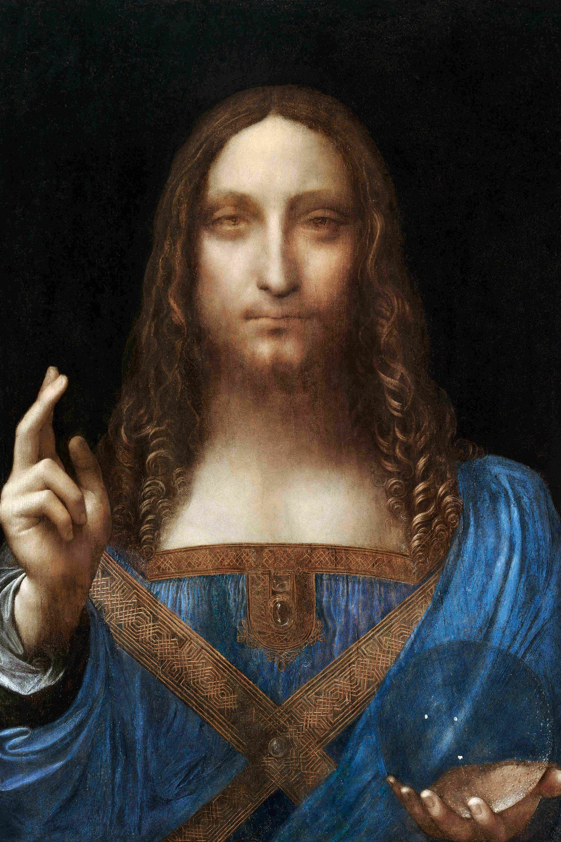 A historic painting titled 'Salvator Mundi' by Leonardo da Vinci, created in 1500. The artwork features intricate details, including a blue robe with gold embellishments and a crystal orb held in the left hand. The background is dark, emphasizing the subject's figure and attire.