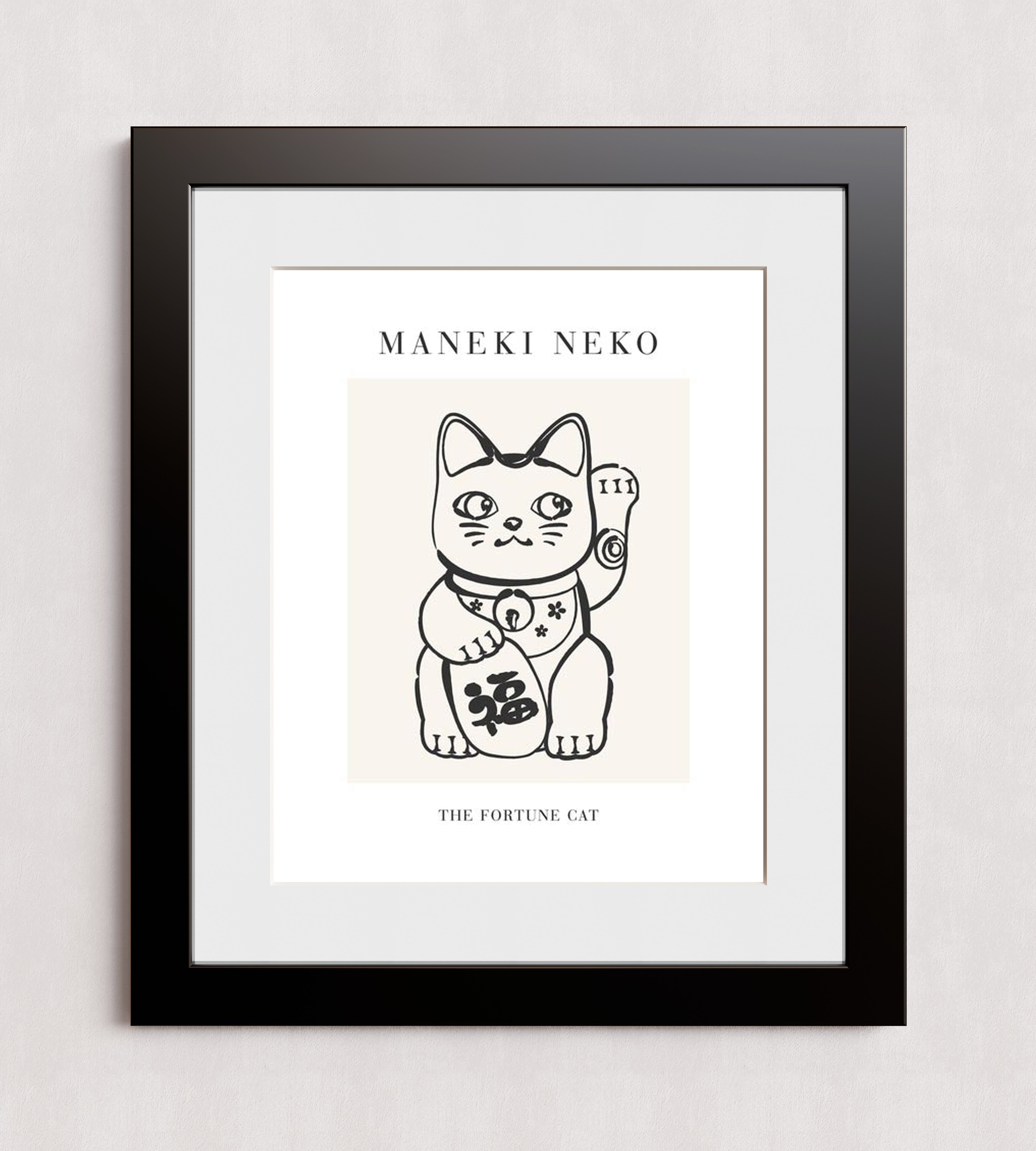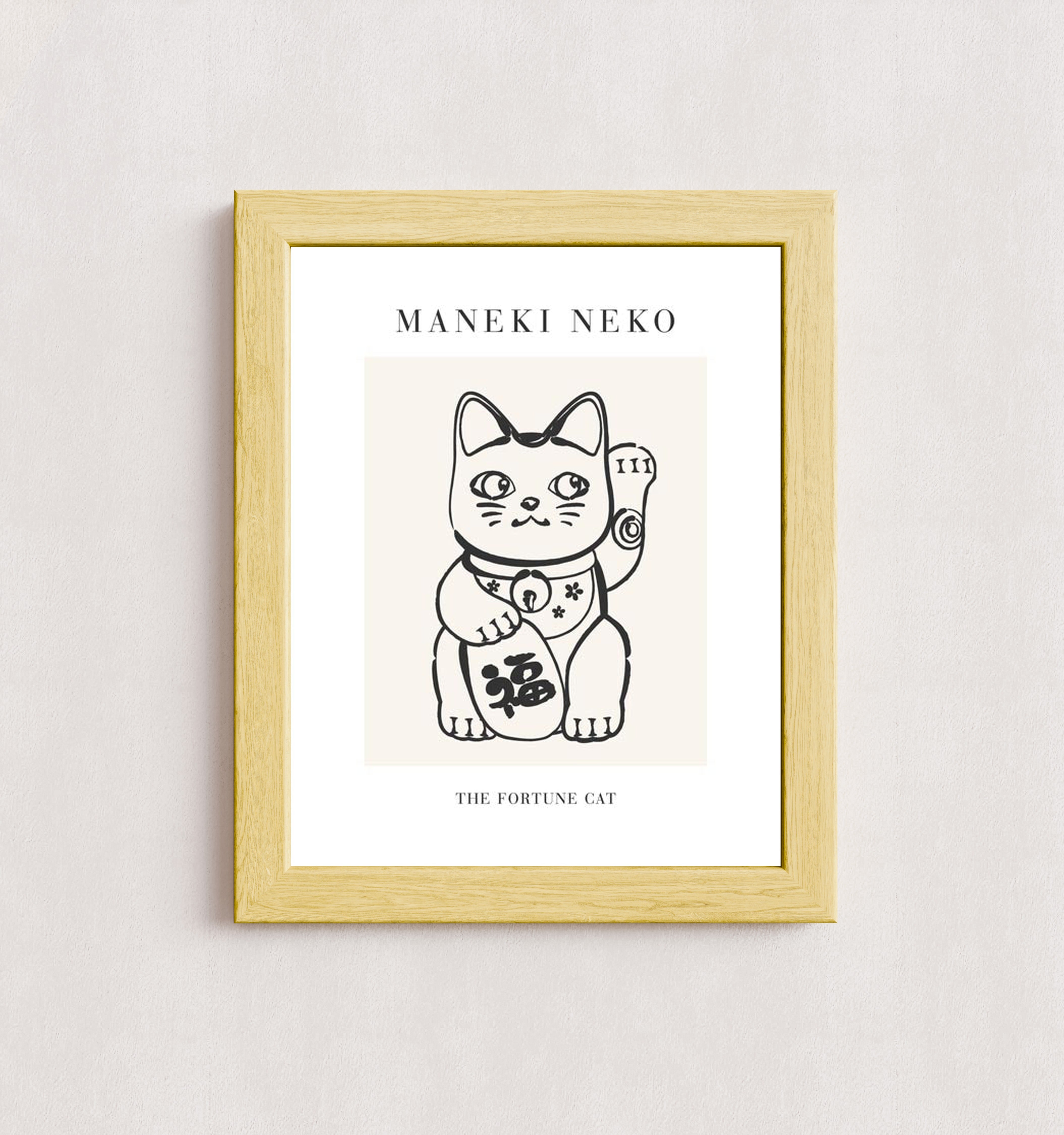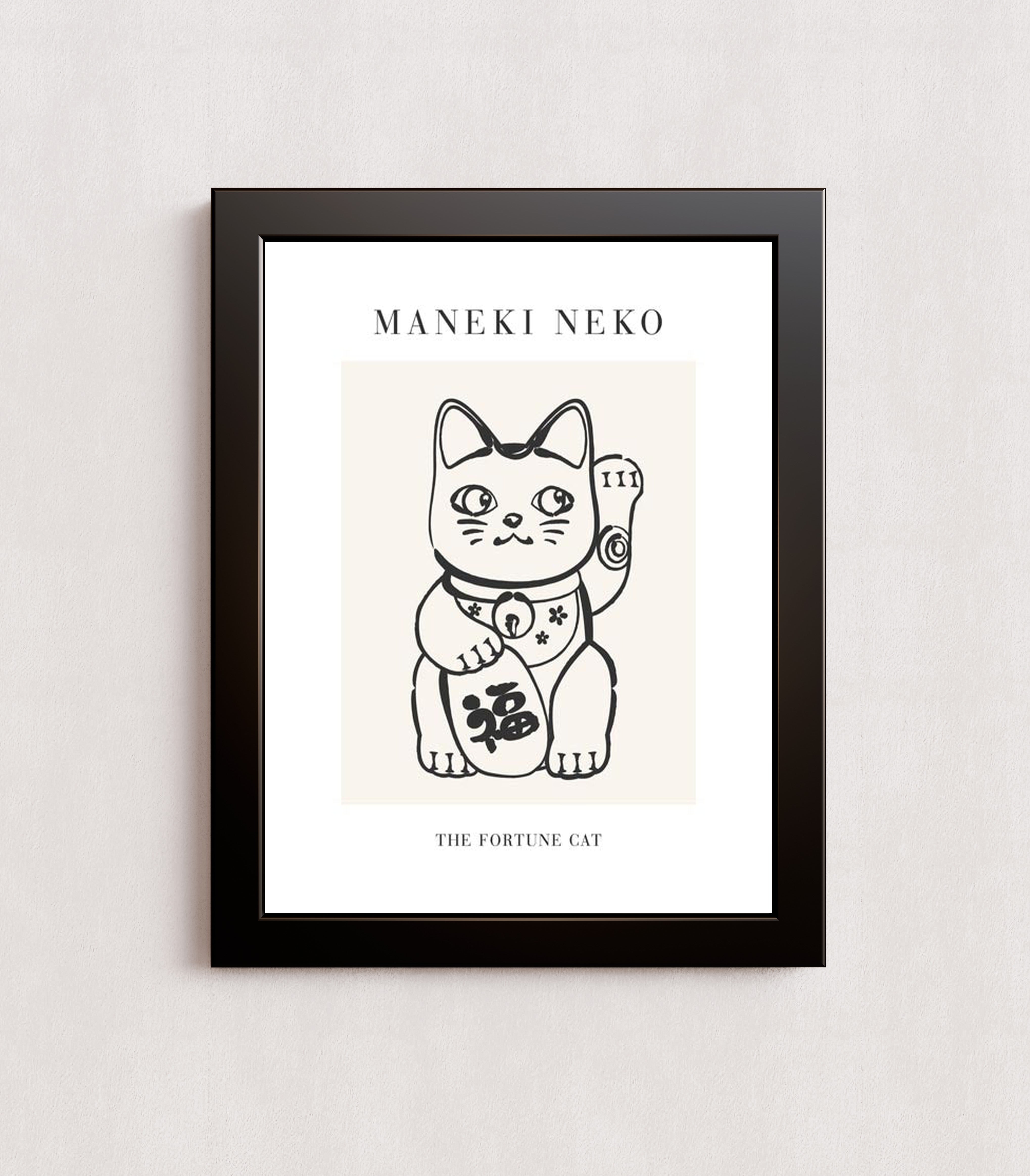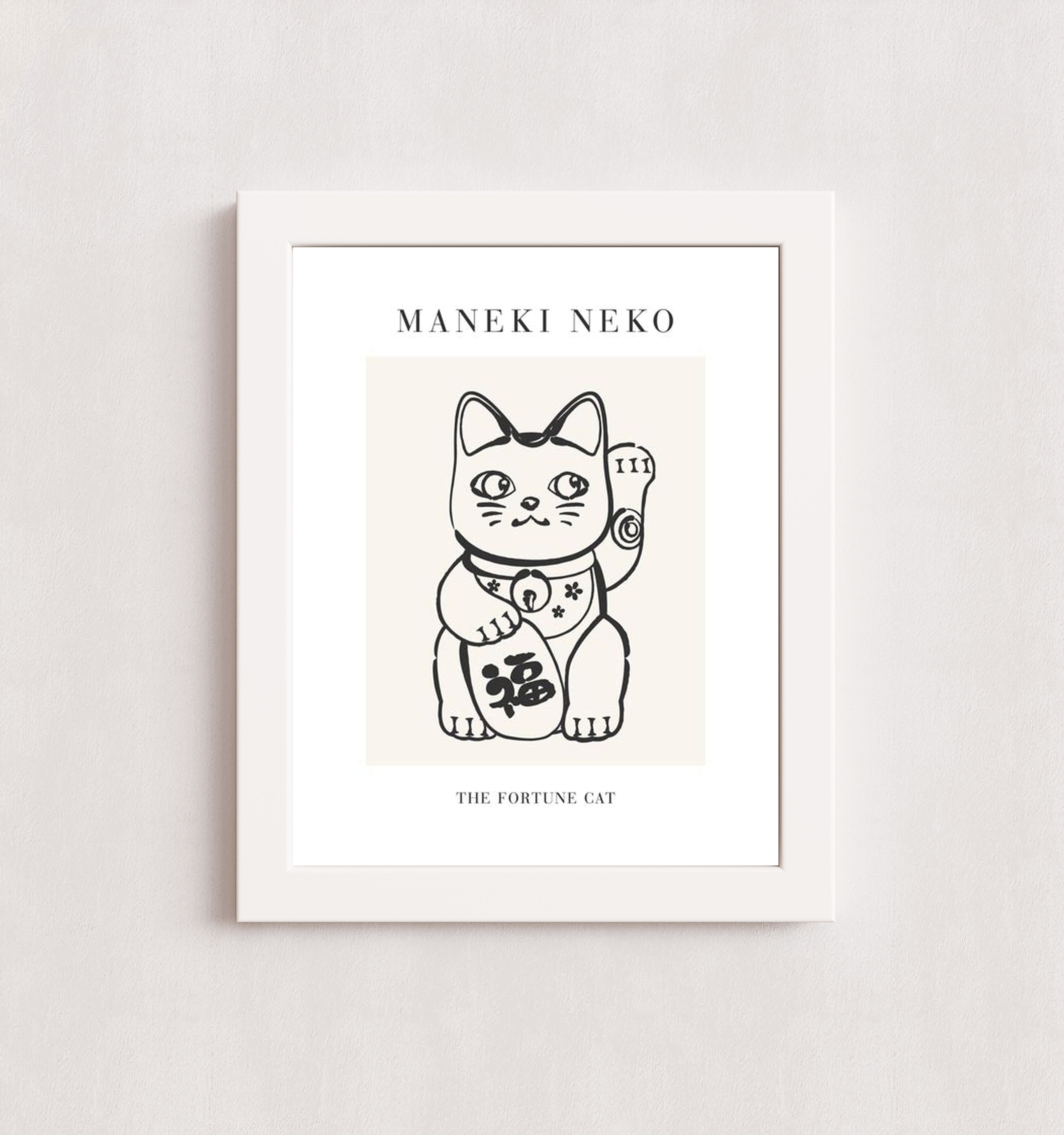 A black-and-white illustration of a Maneki Neko, also known as the Fortune Cat, with a raised paw and decorative details. The text 'MANEKI NEKO' is prominently displayed above the image, and 'THE FORTUNE CAT' is written below.