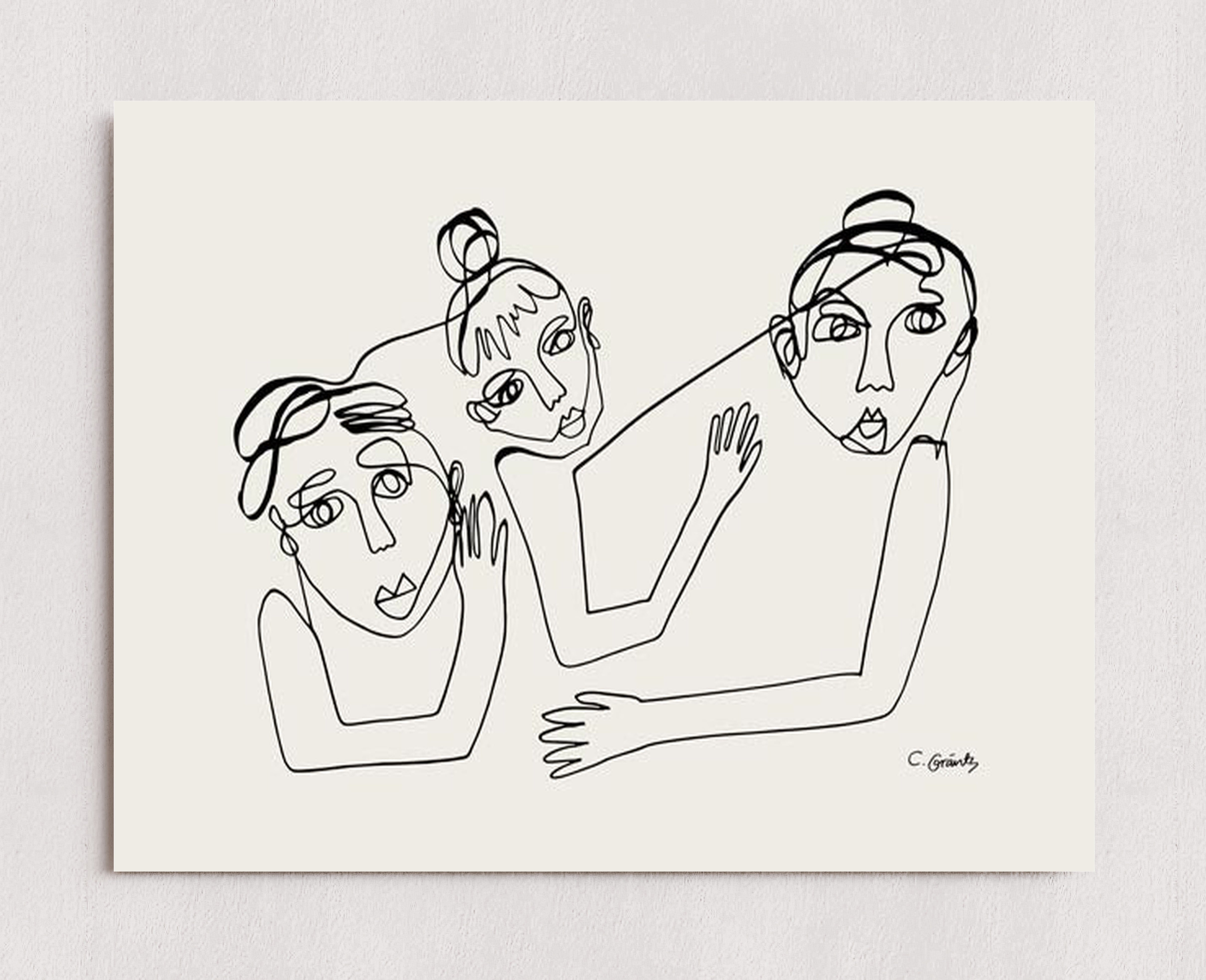 Minimalist line art illustration featuring three human figures in an abstract style. The artwork uses continuous black lines on a neutral beige background, creating a modern and artistic aesthetic.