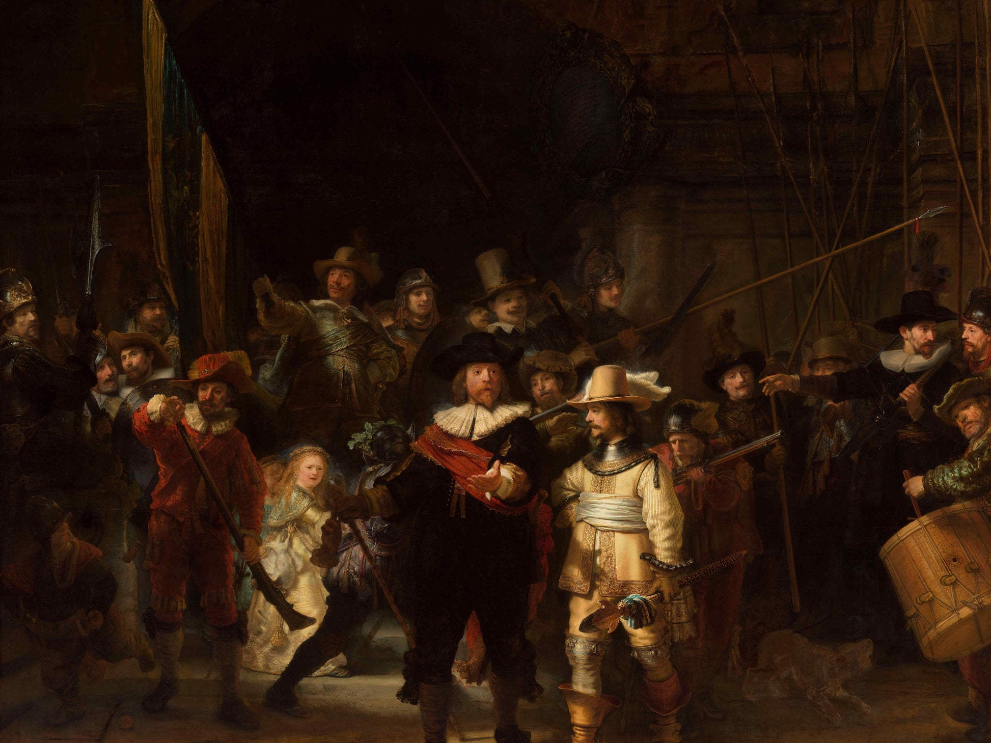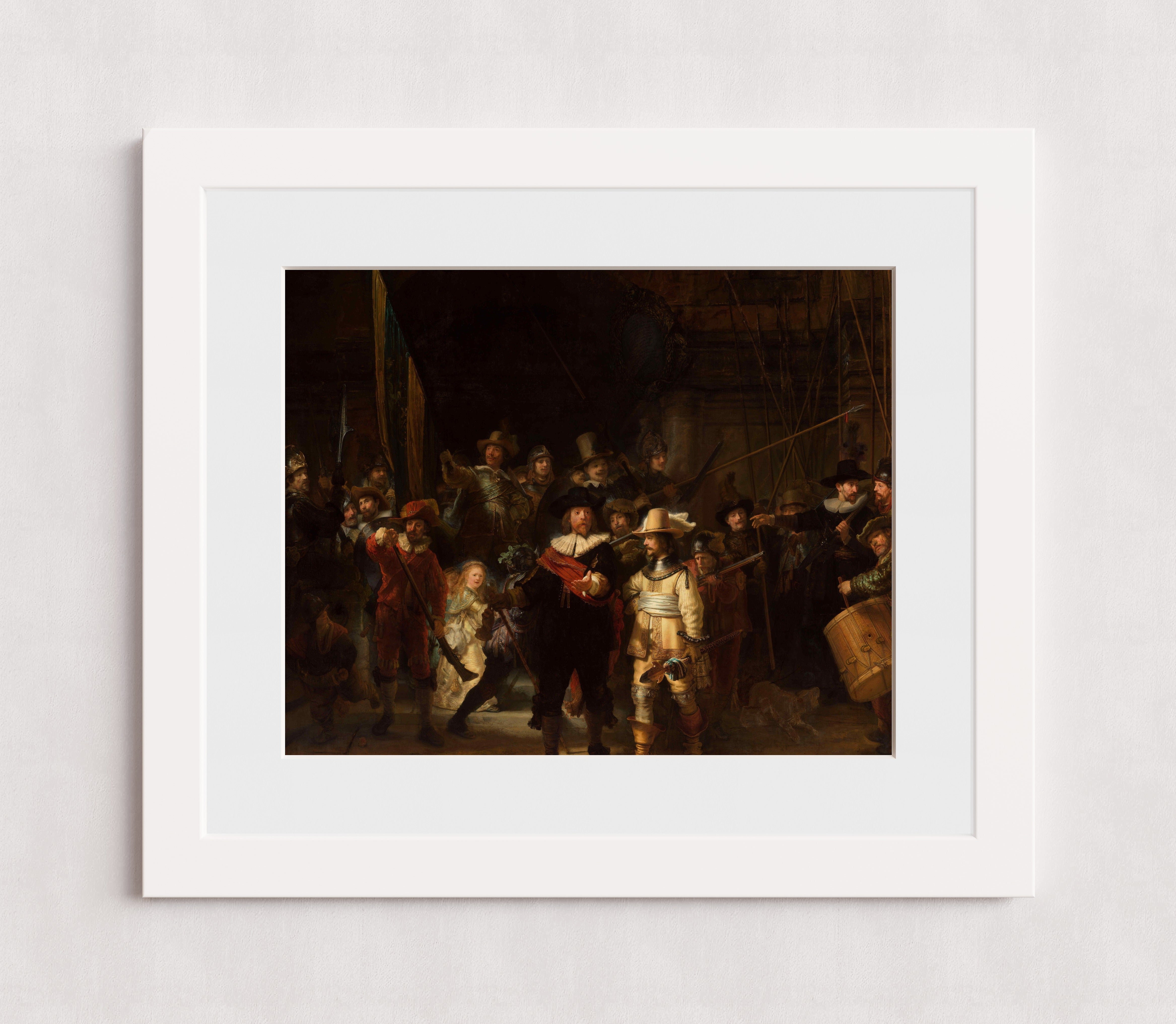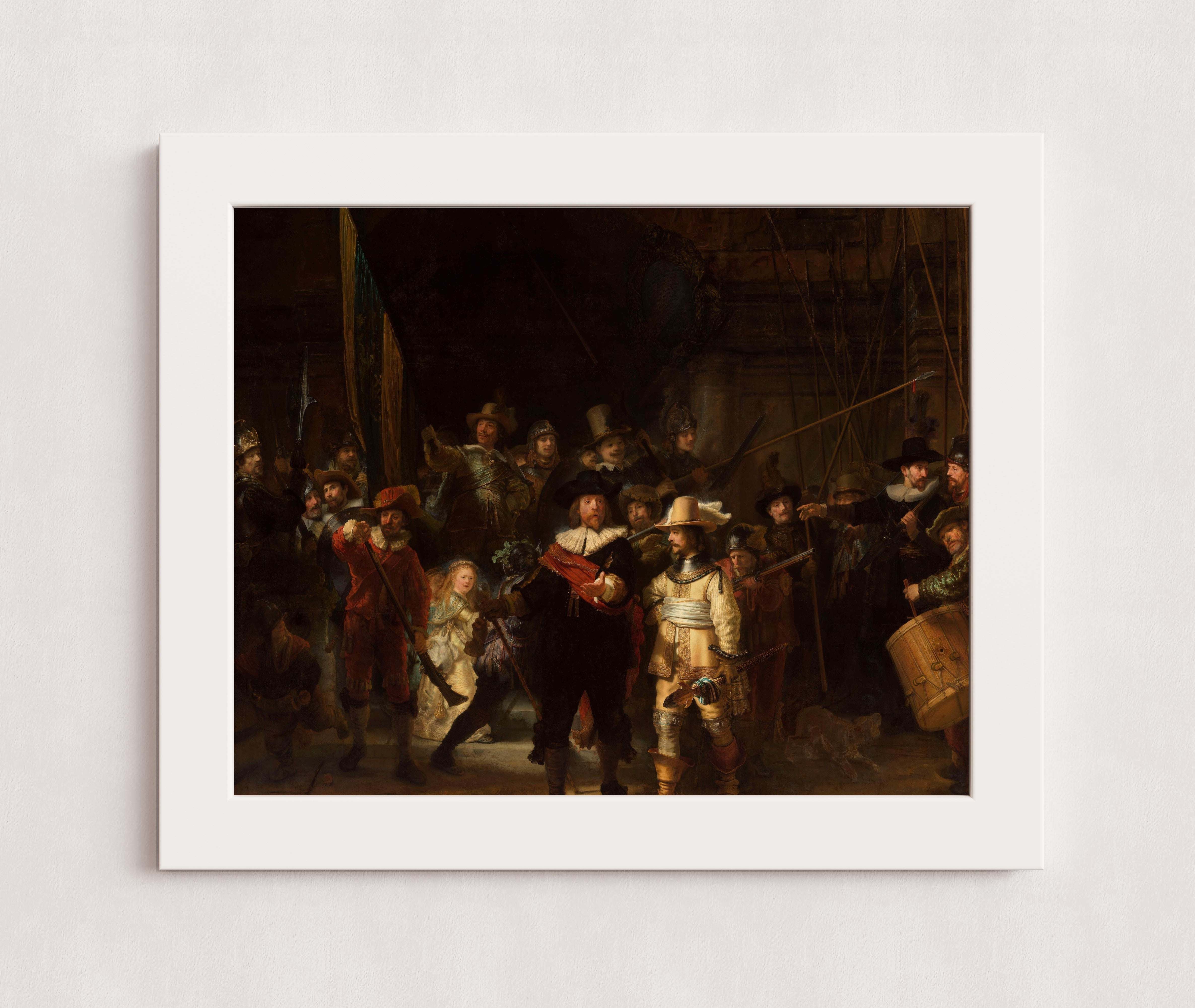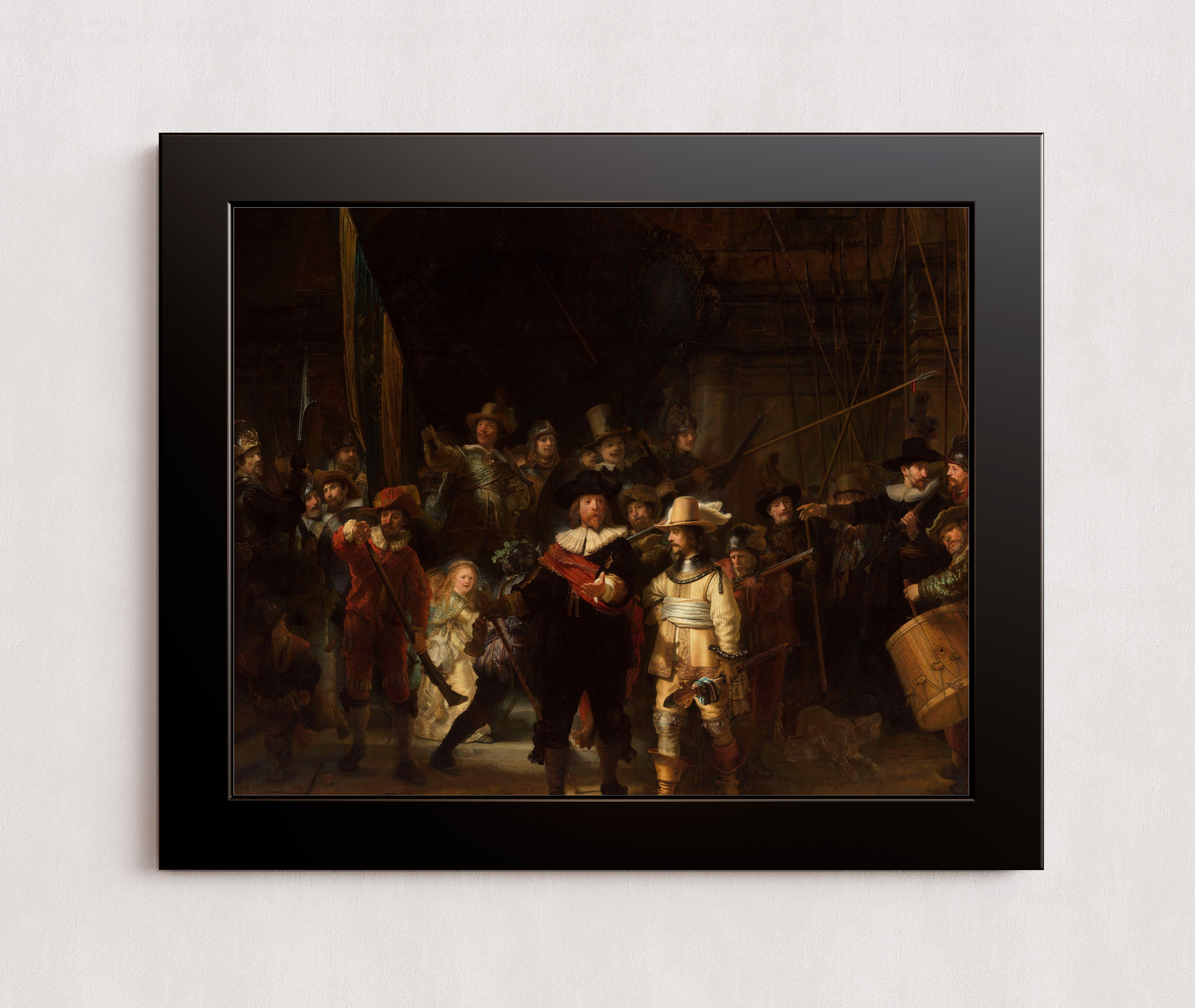 A reproduction of Rembrandt's famous painting, 'The Night Watch,' created in 1642. The artwork depicts a group of armed men in a dynamic and dramatic composition, set in a dimly lit environment.