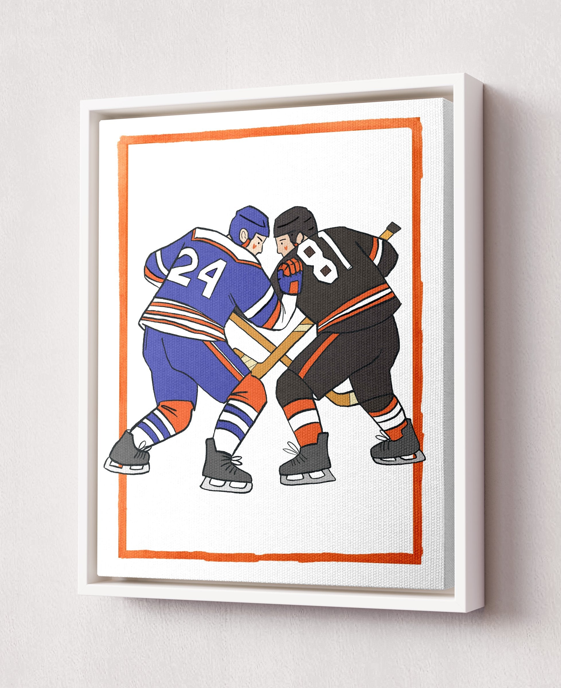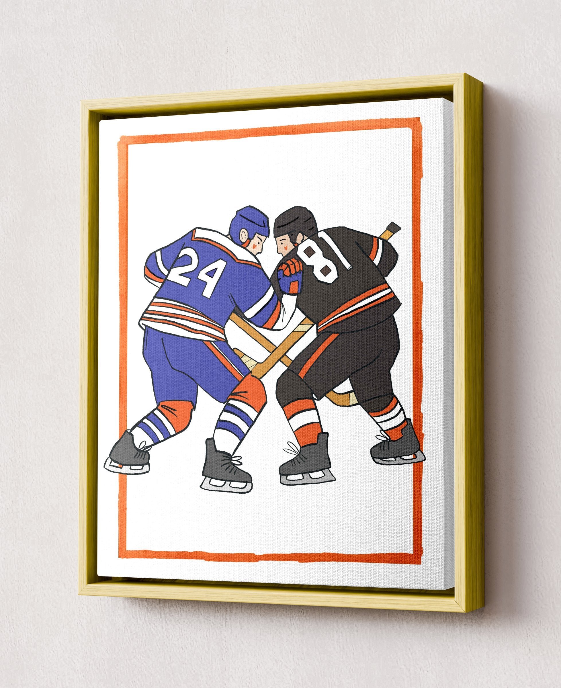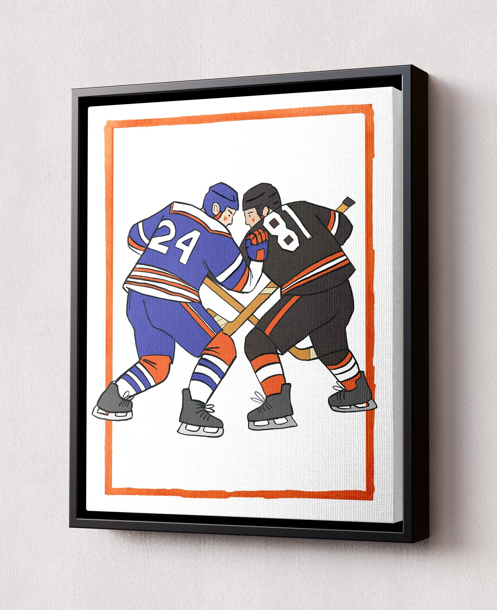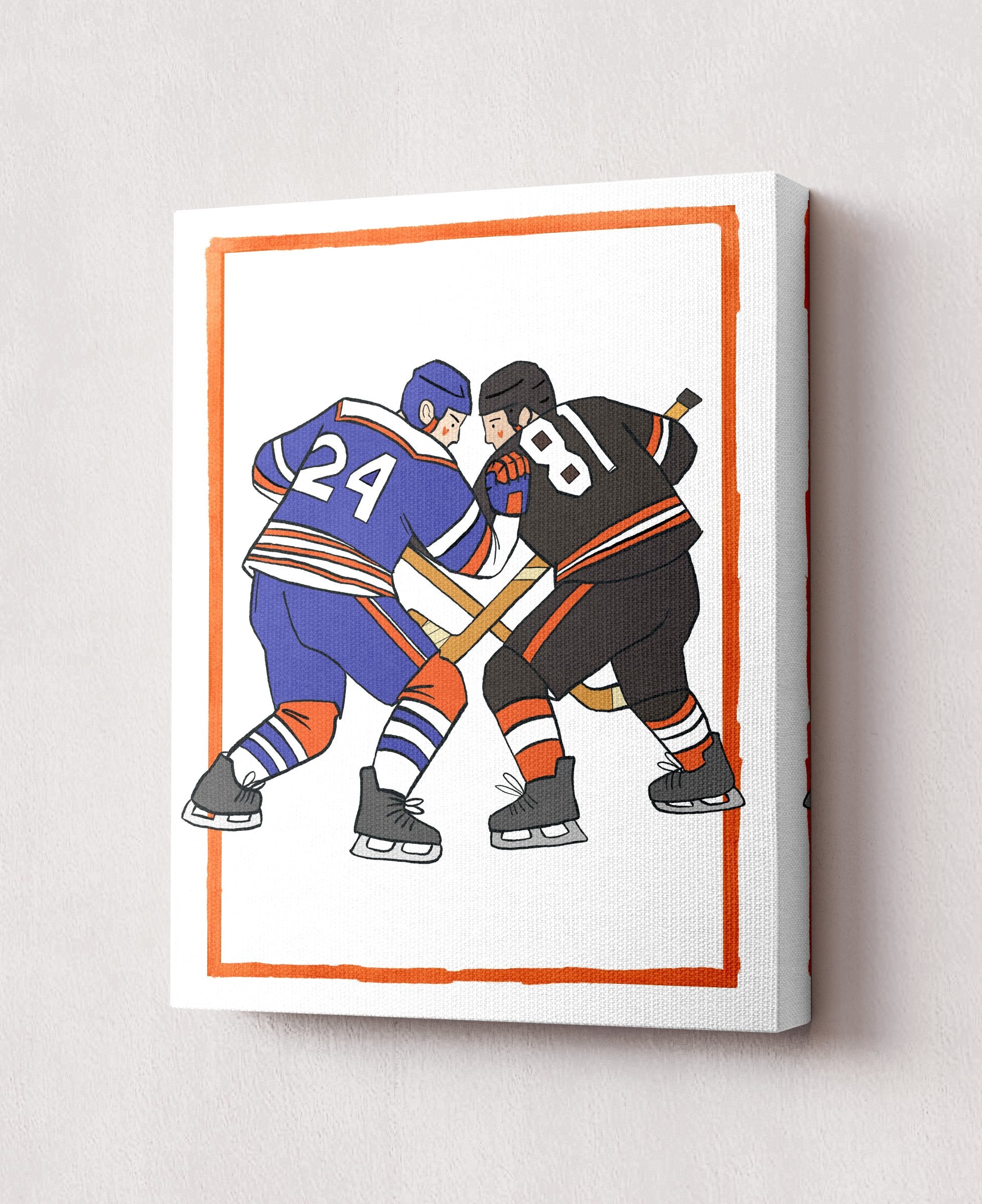 Inspired by the hit show Heated Rivalry, this image features two male hockey players engaged in a face-off. One is wearing a blue and white jersey with the number 24, and the other is in a black and orange jersey with the number 81.