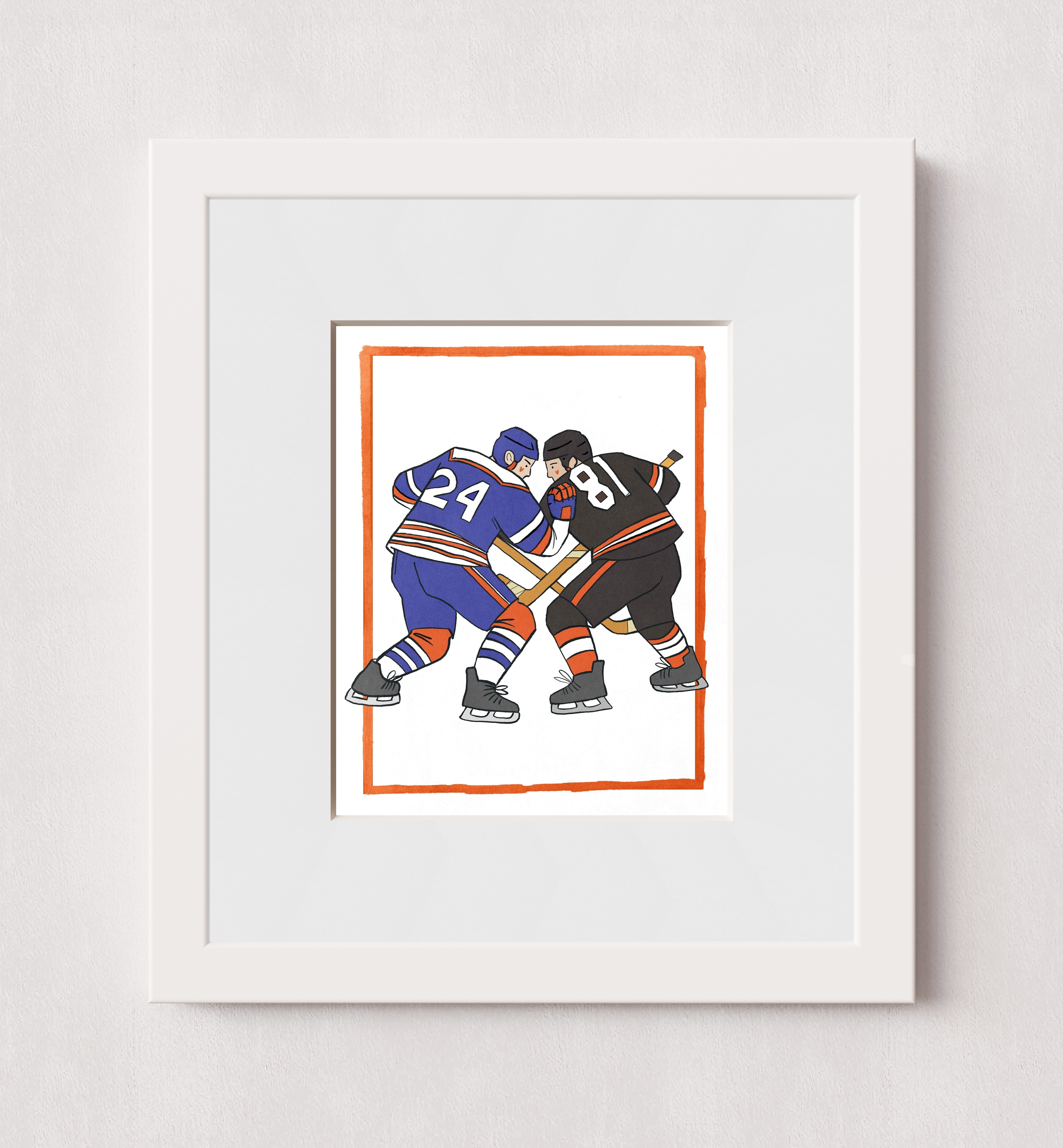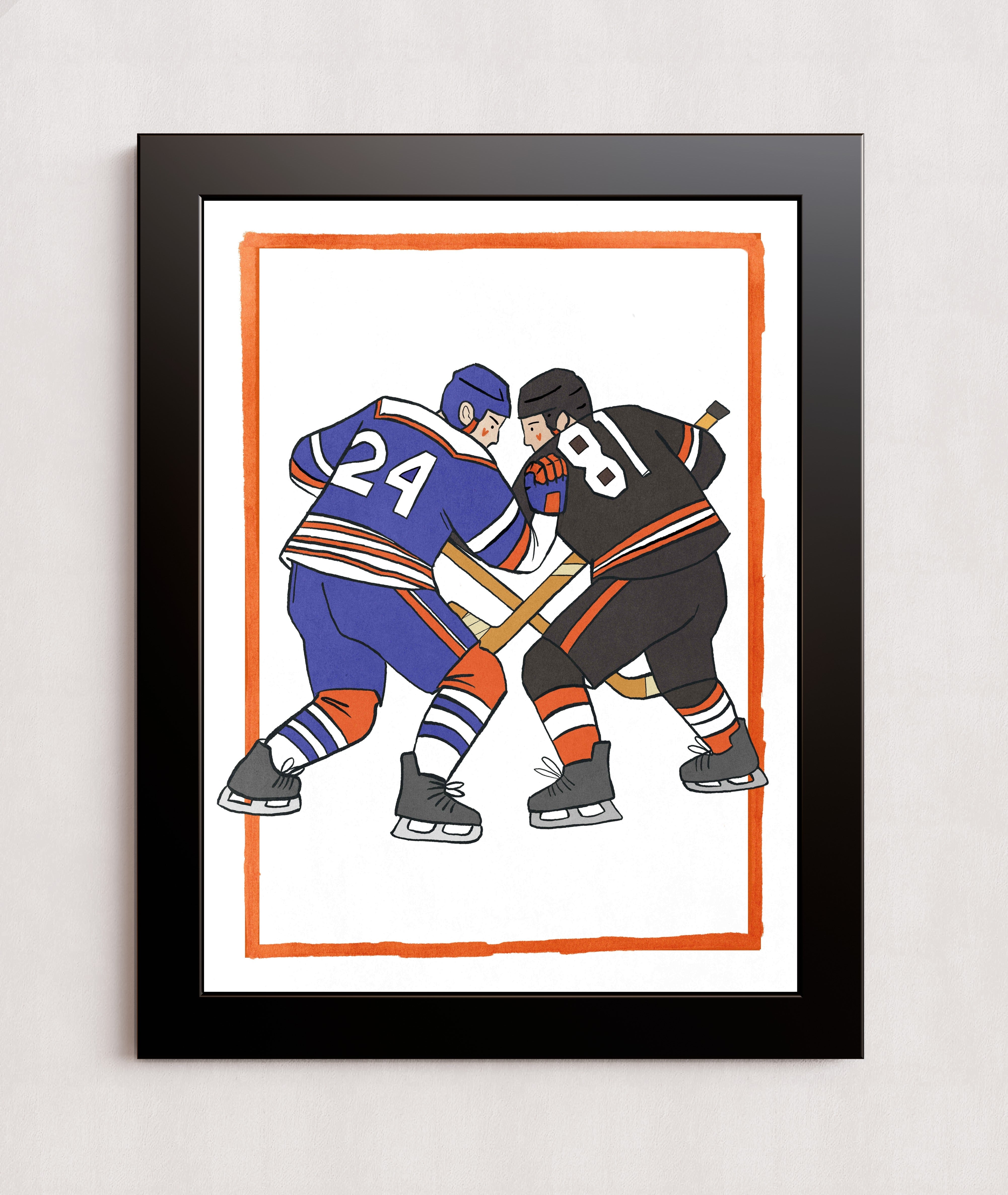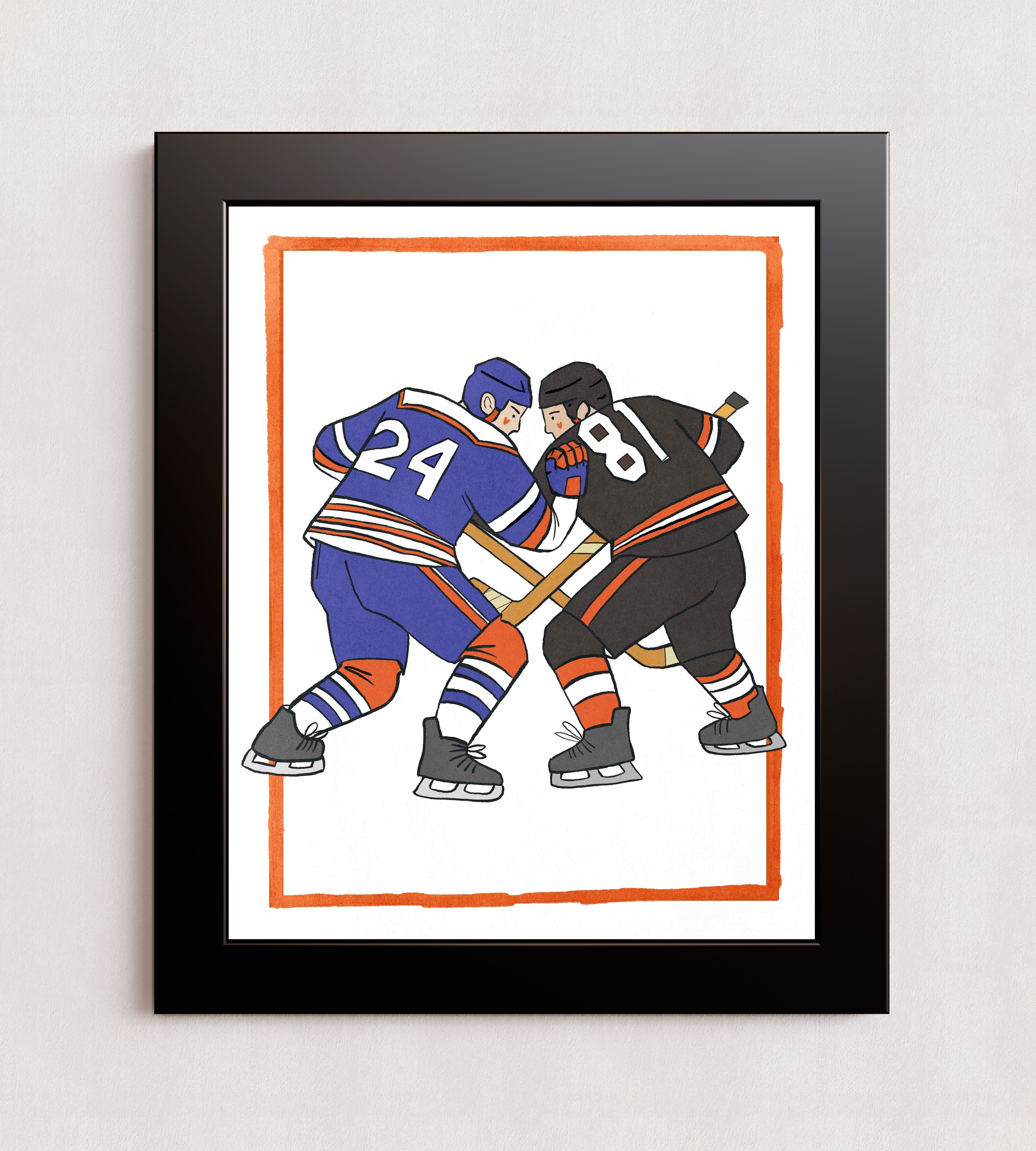 Inspired by the hit show Heated Rivalry, this image features two male hockey players engaged in a face-off. One is wearing a blue and white jersey with the number 24, and the other is in a black and orange jersey with the number 81.