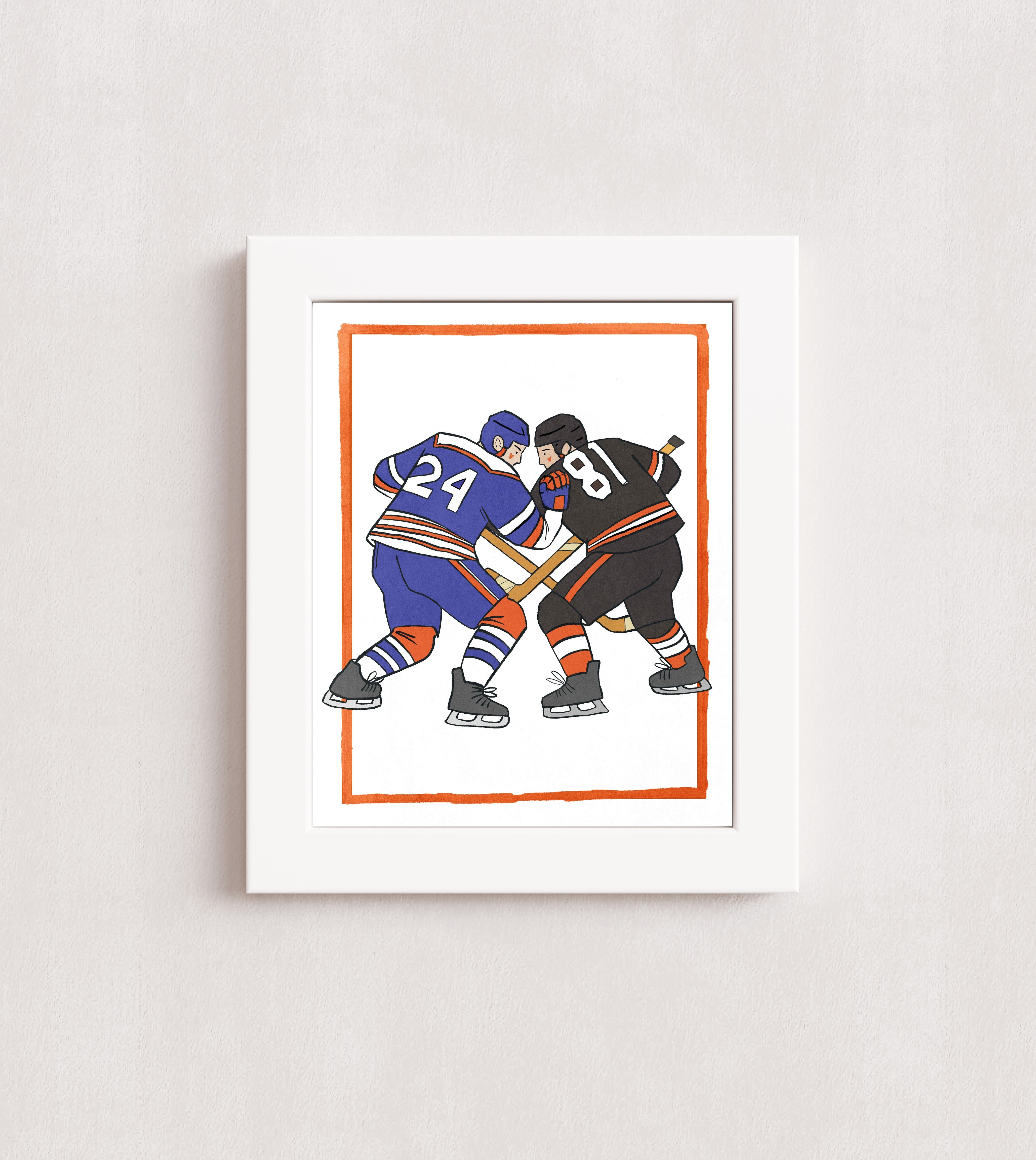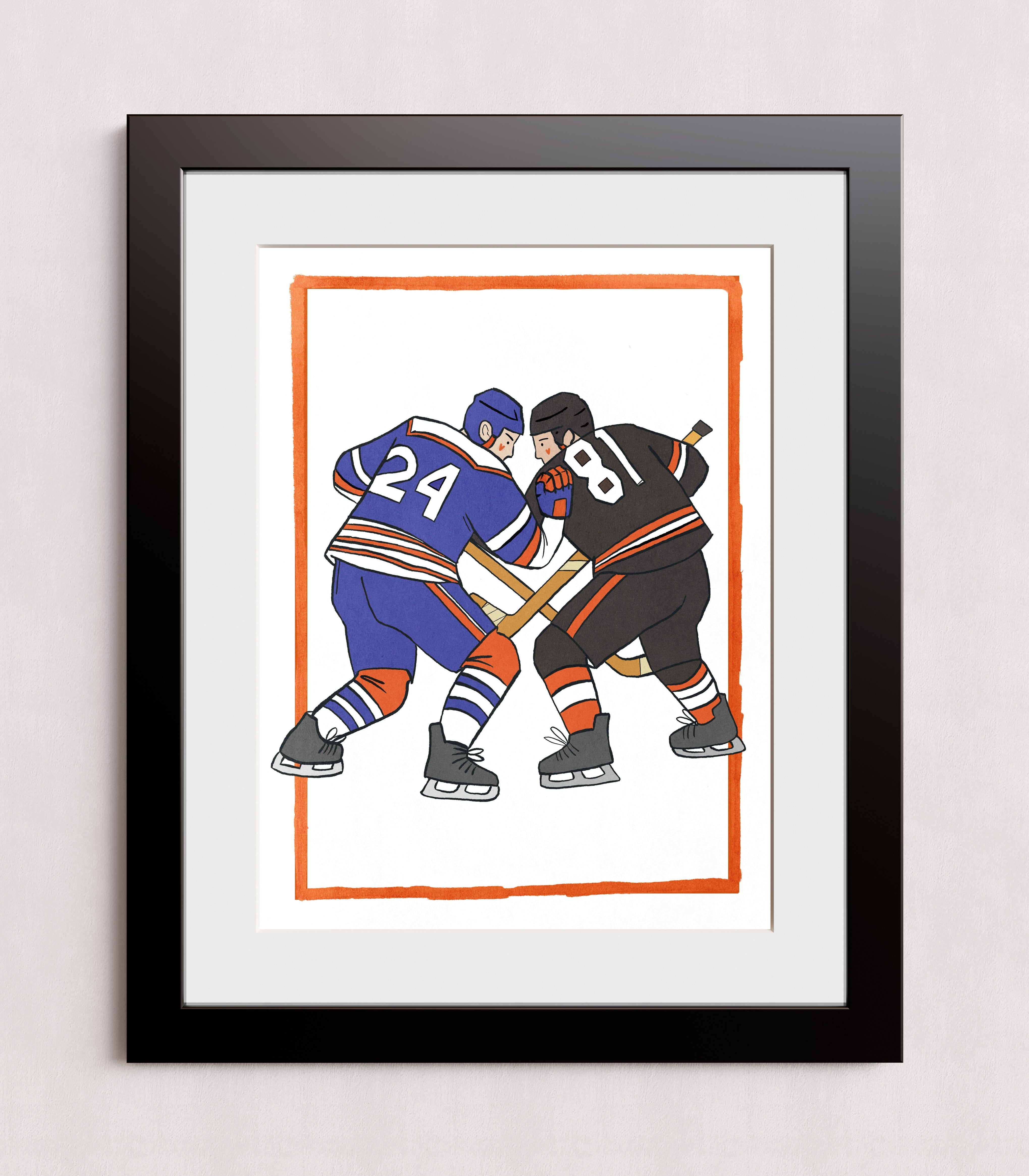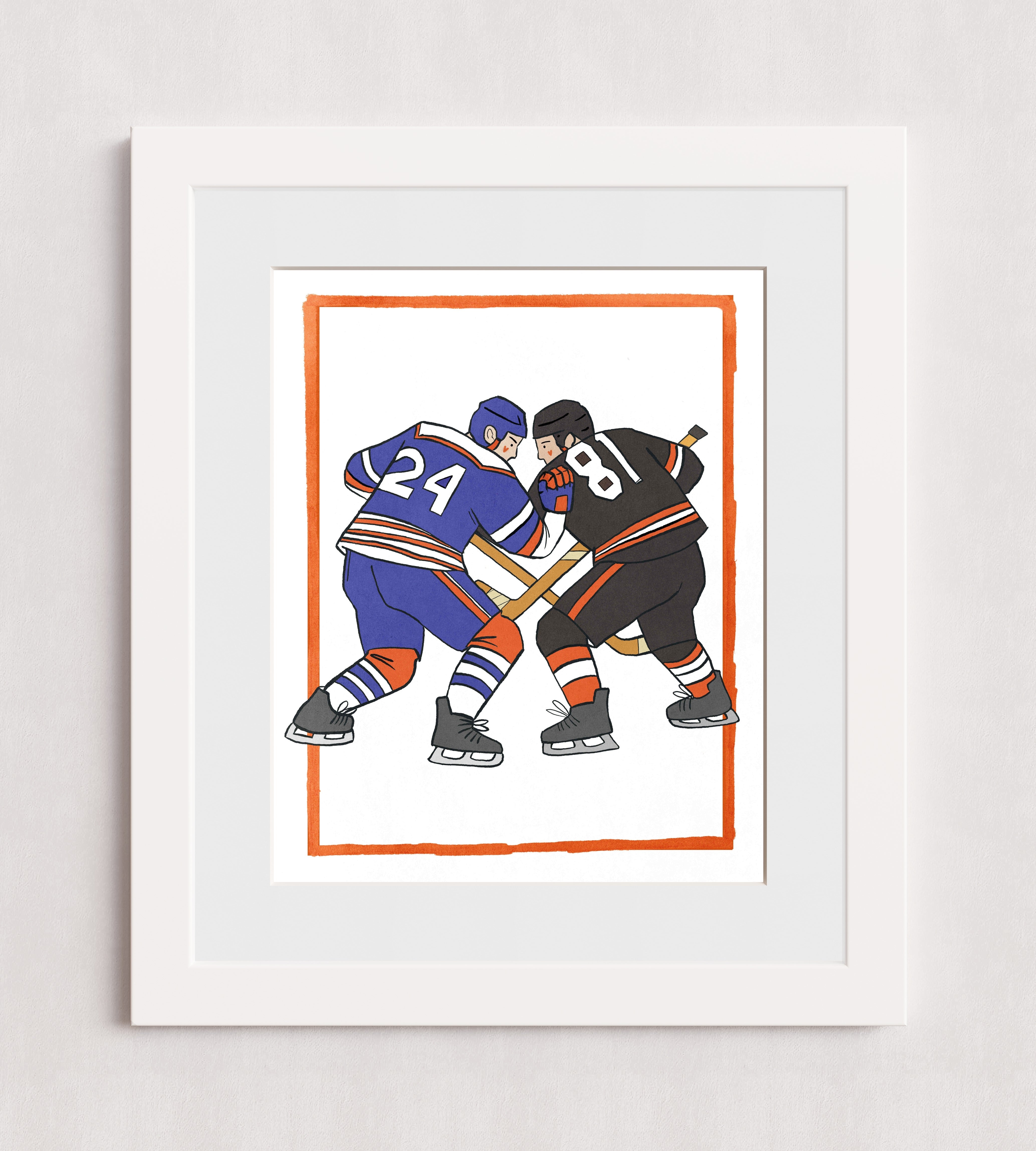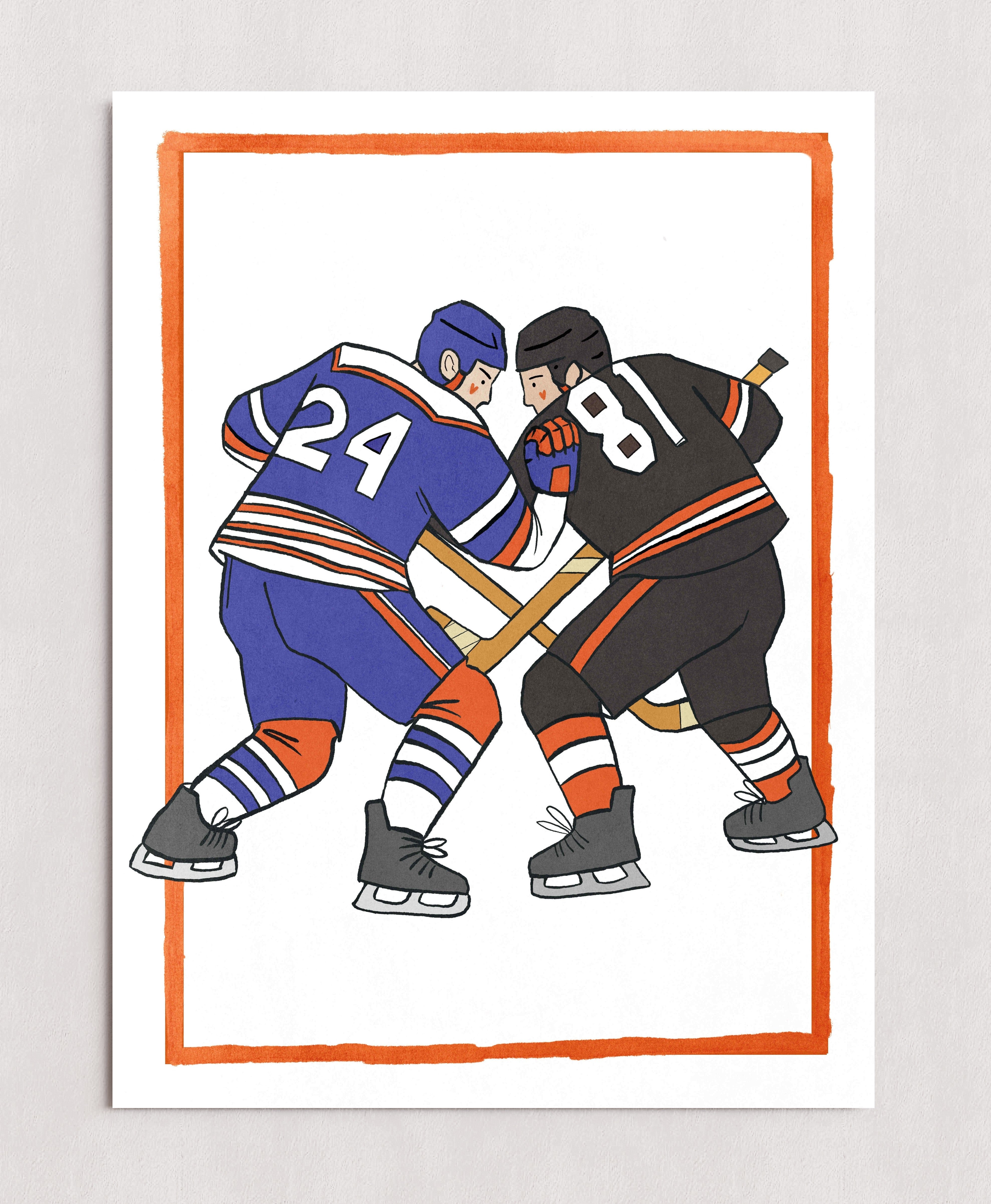 Inspired by the hit show Heated Rivalry, this image features two male hockey players engaged in a face-off. One is wearing a blue and white jersey with the number 24, and the other is in a black and orange jersey with the number 81.