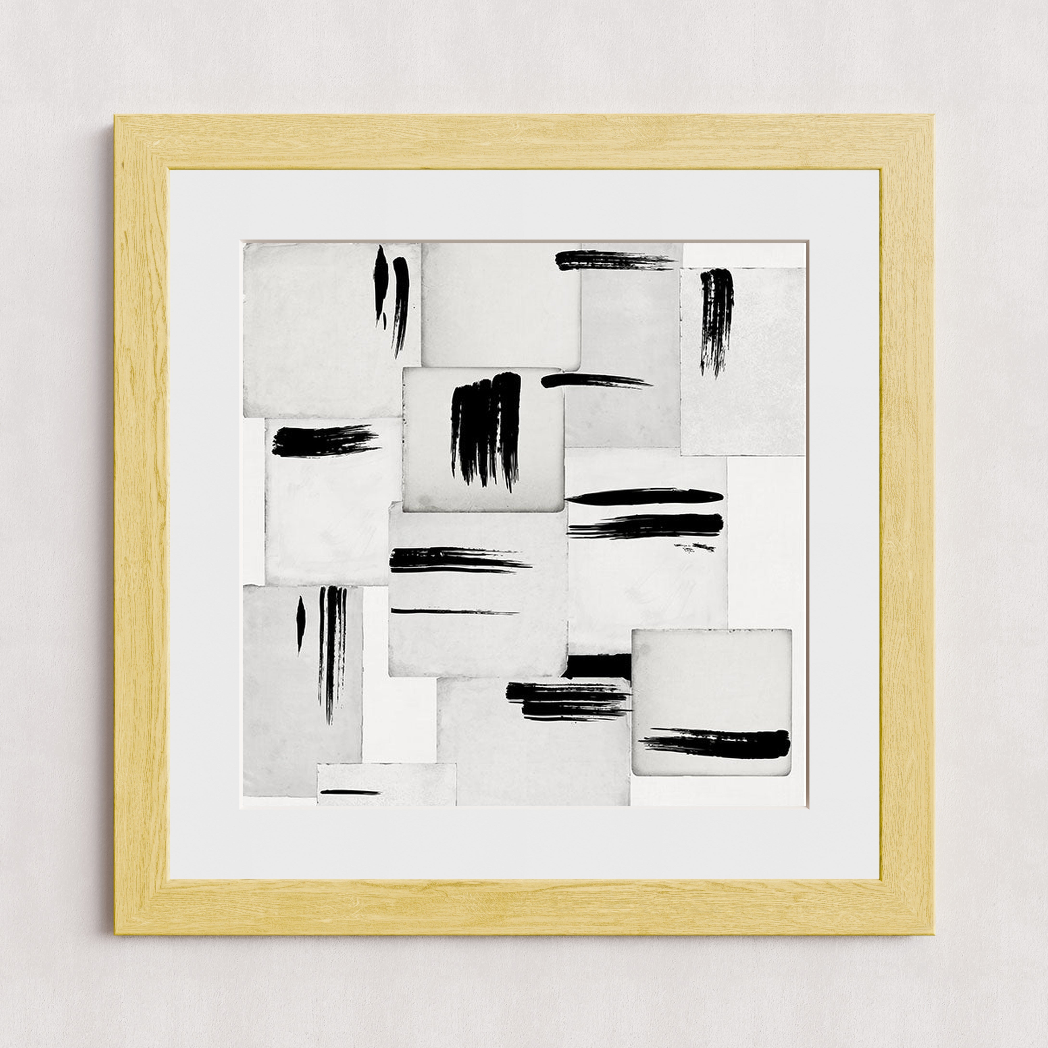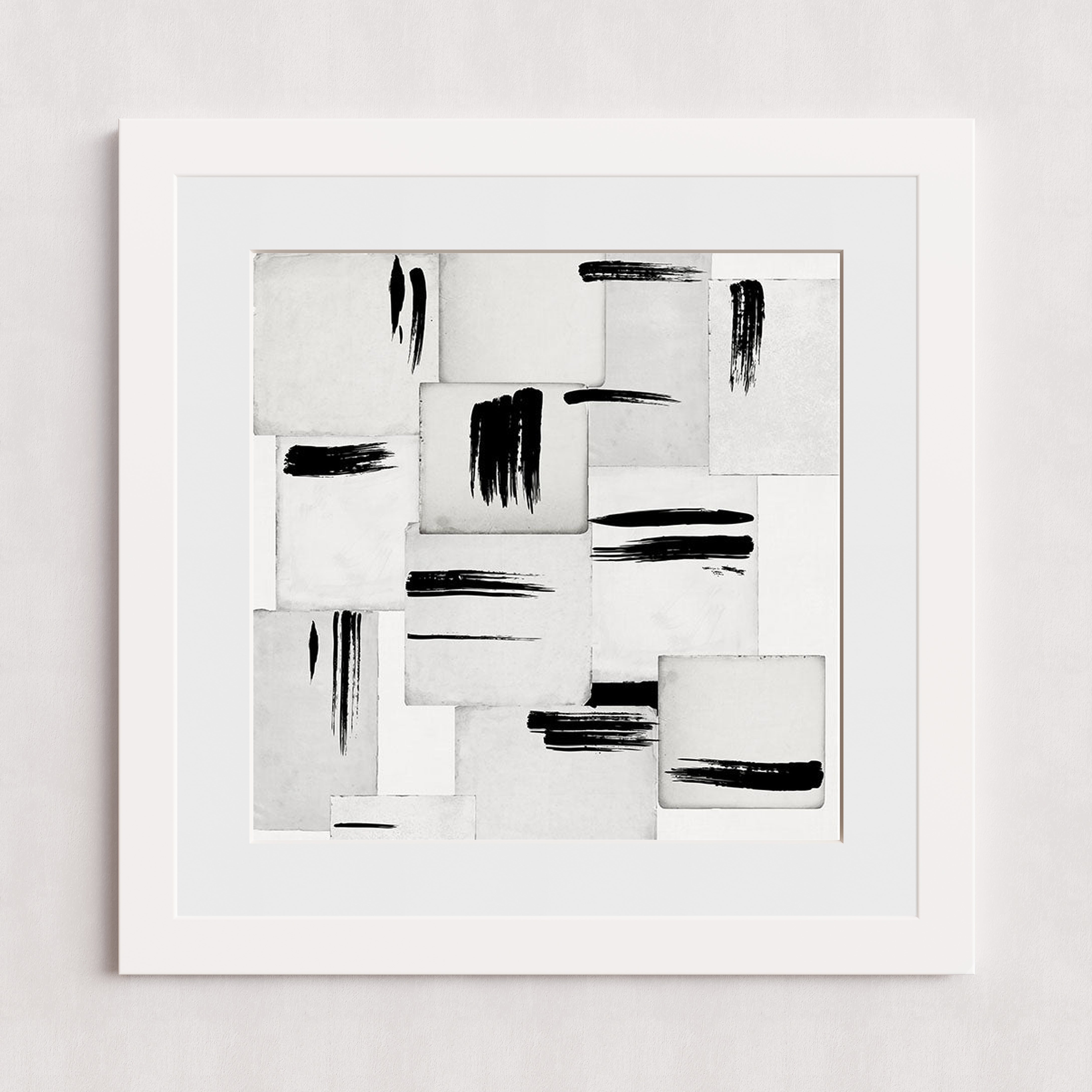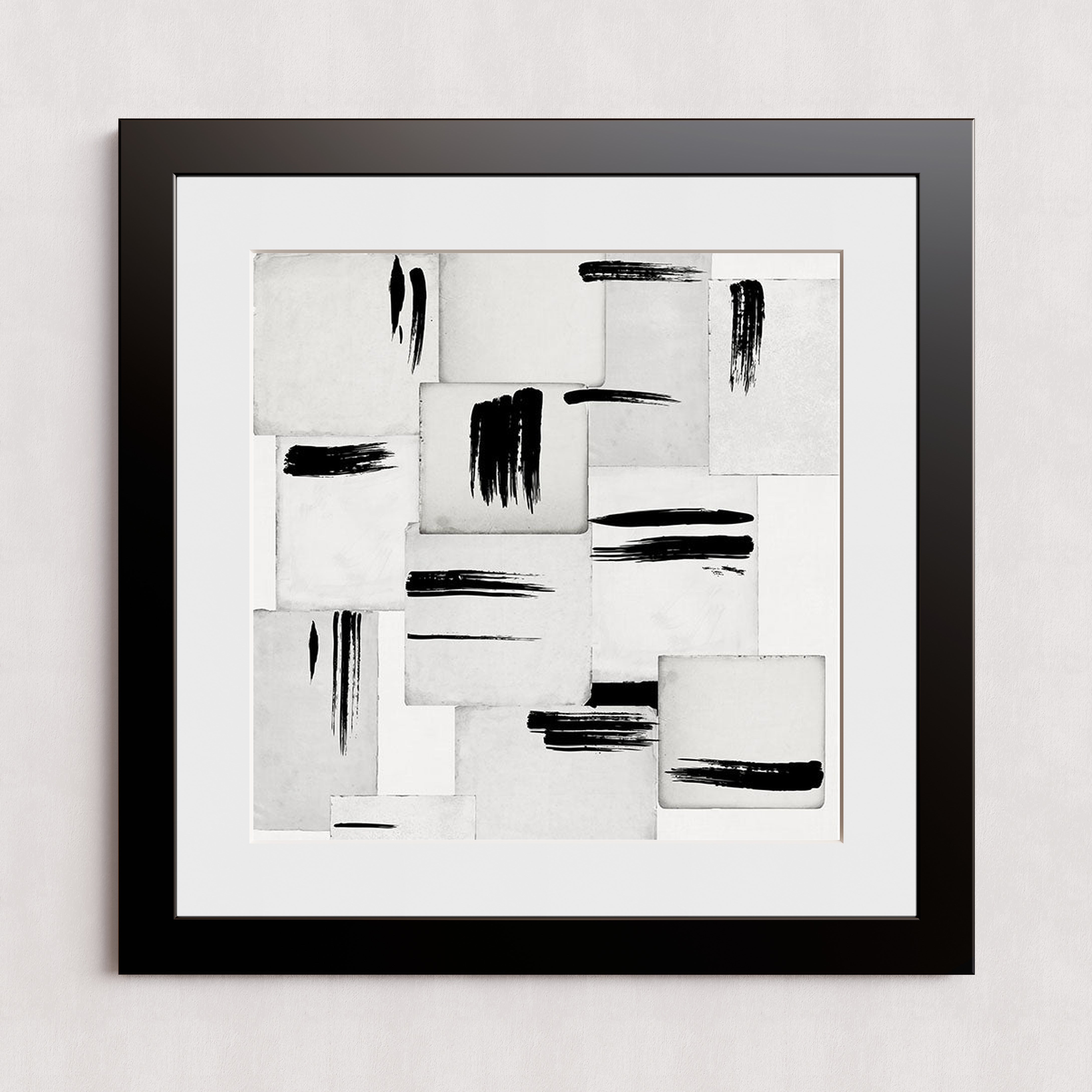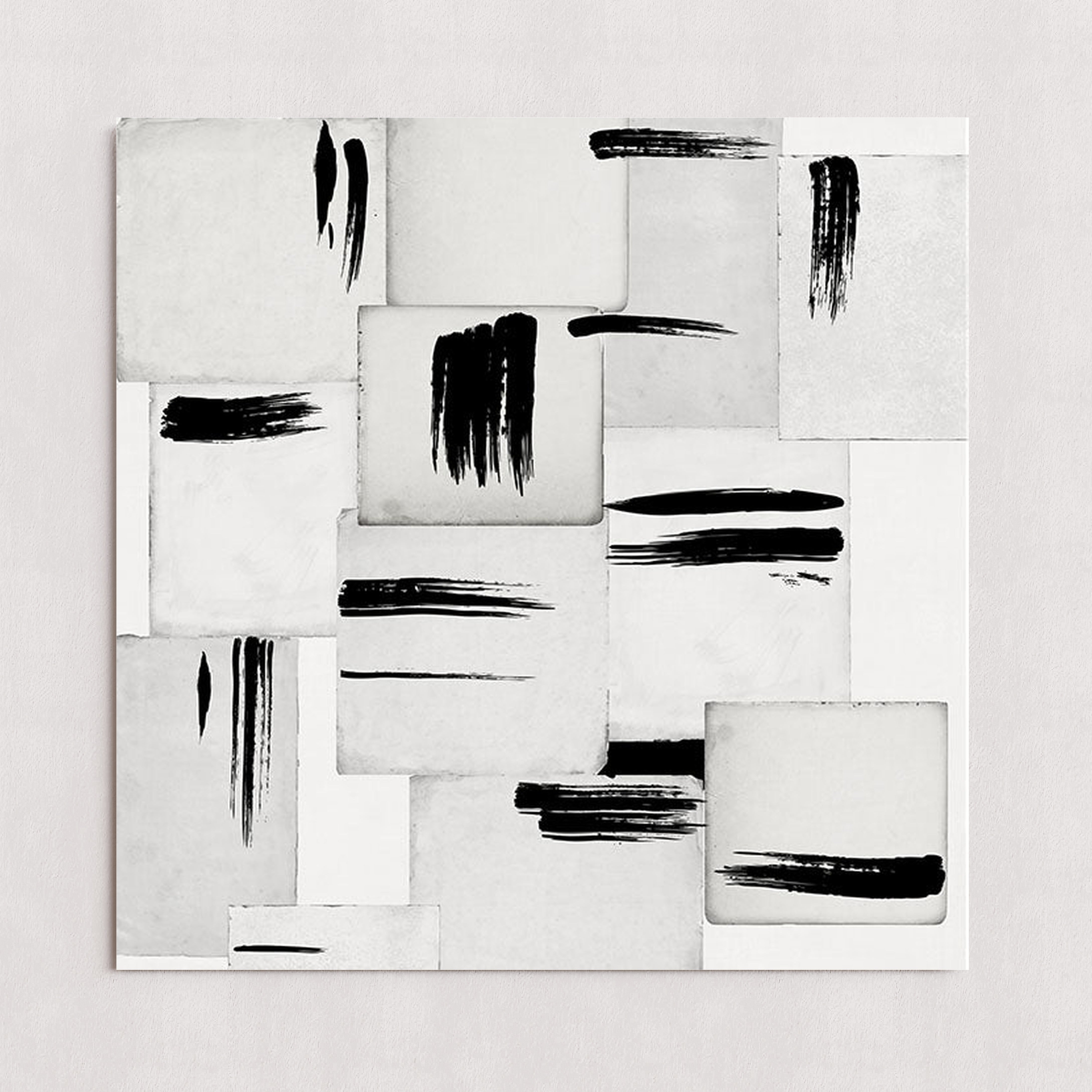 Une composition abstraite moderne présentant des coups de pinceau noirs sur une grille de carreaux carrés blancs et gris.