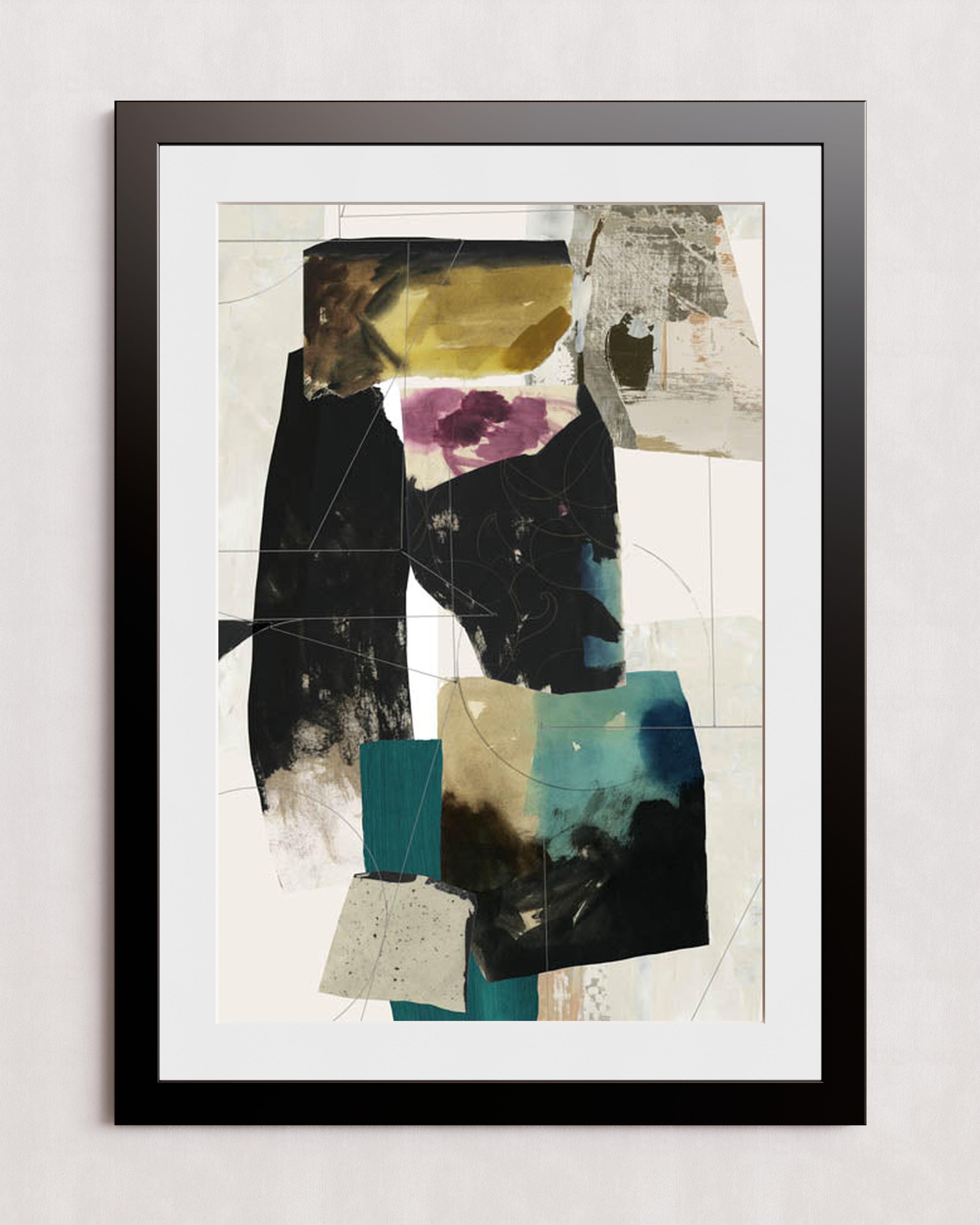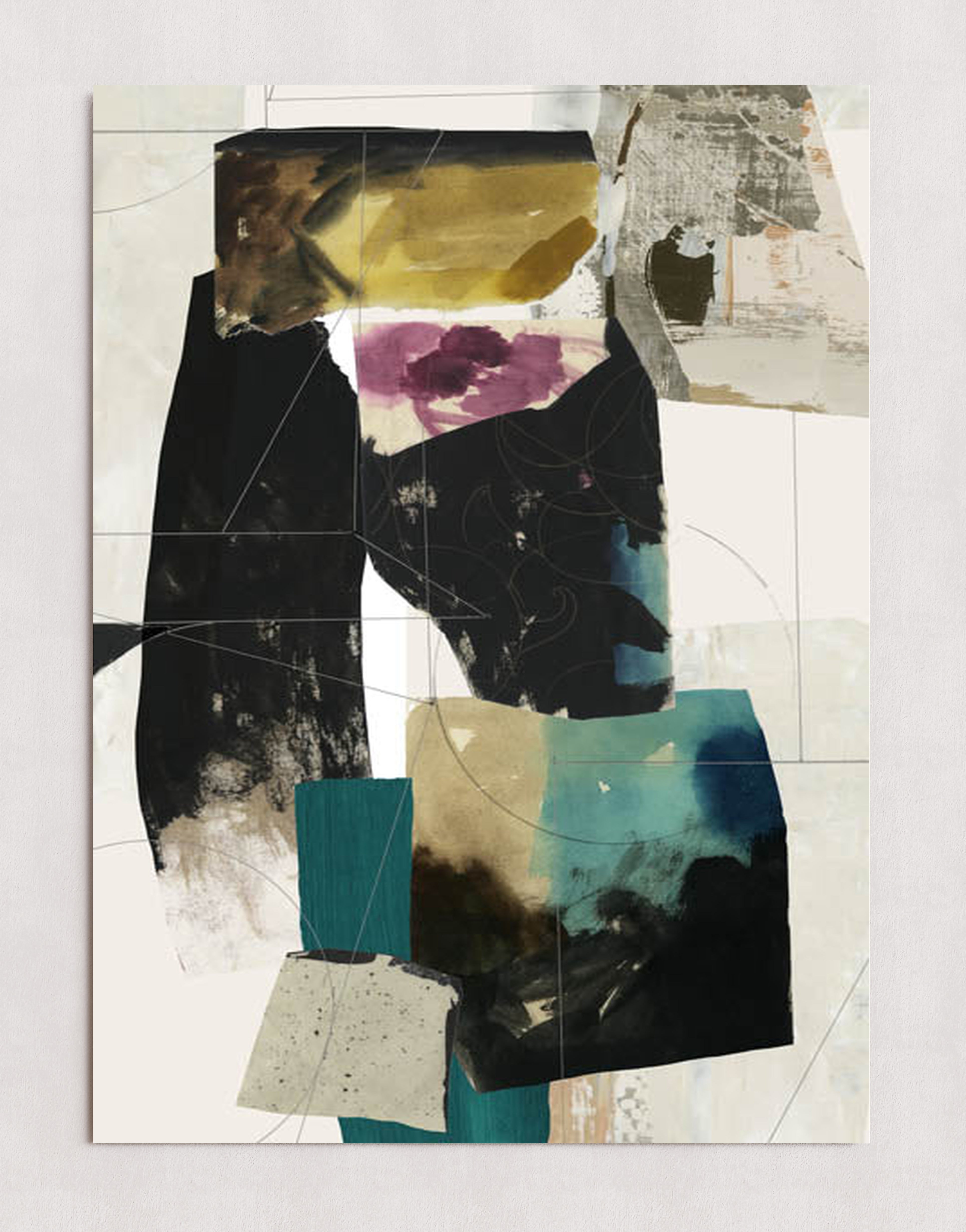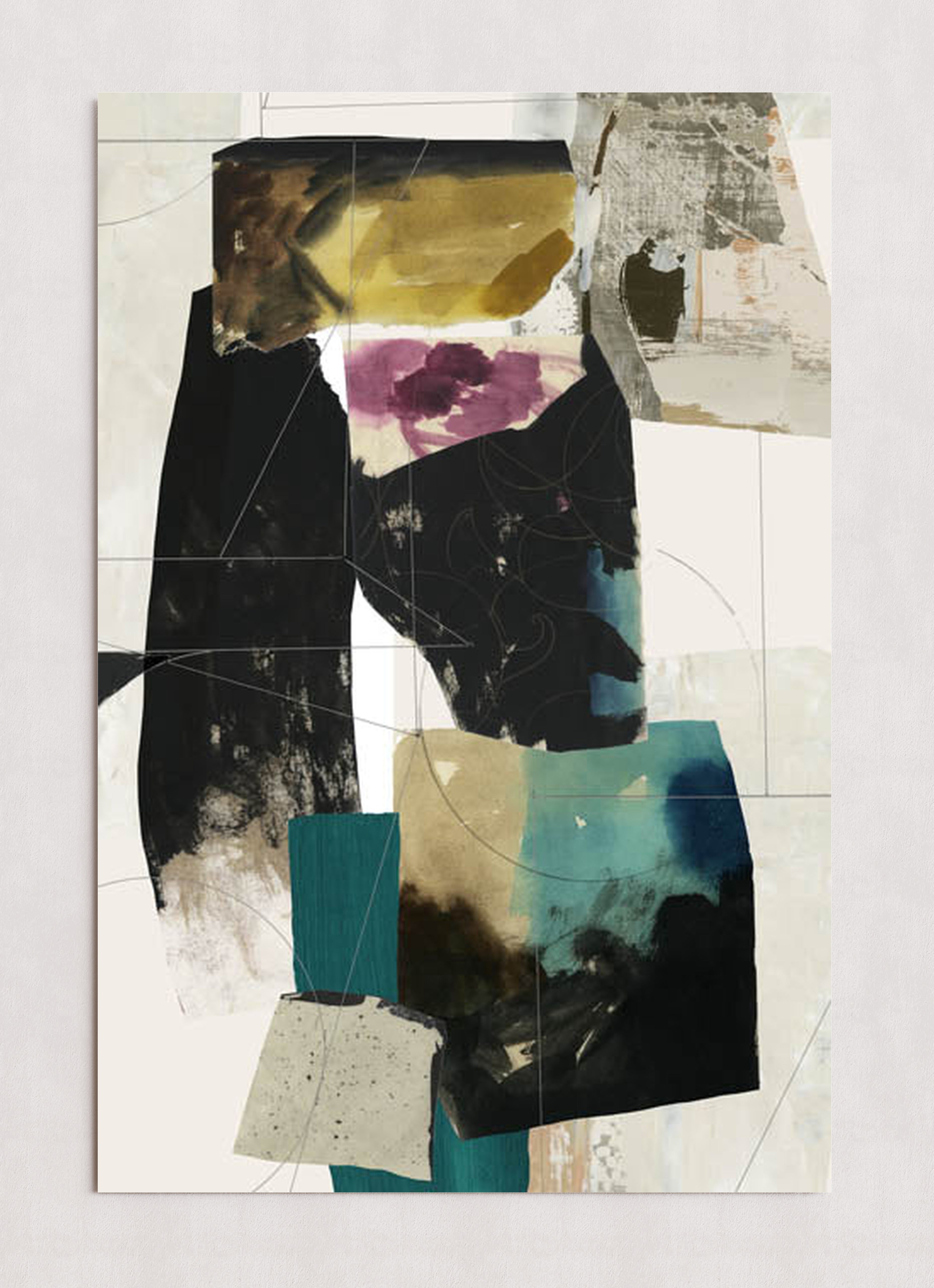 Une œuvre d'art abstraite moderne composée d'un collage de blocs de couleurs texturés dans des tons de noir, turquoise, jaune et violet. La composition mêle formes géométriques superposées et motifs organiques, créant un effet visuel dynamique.