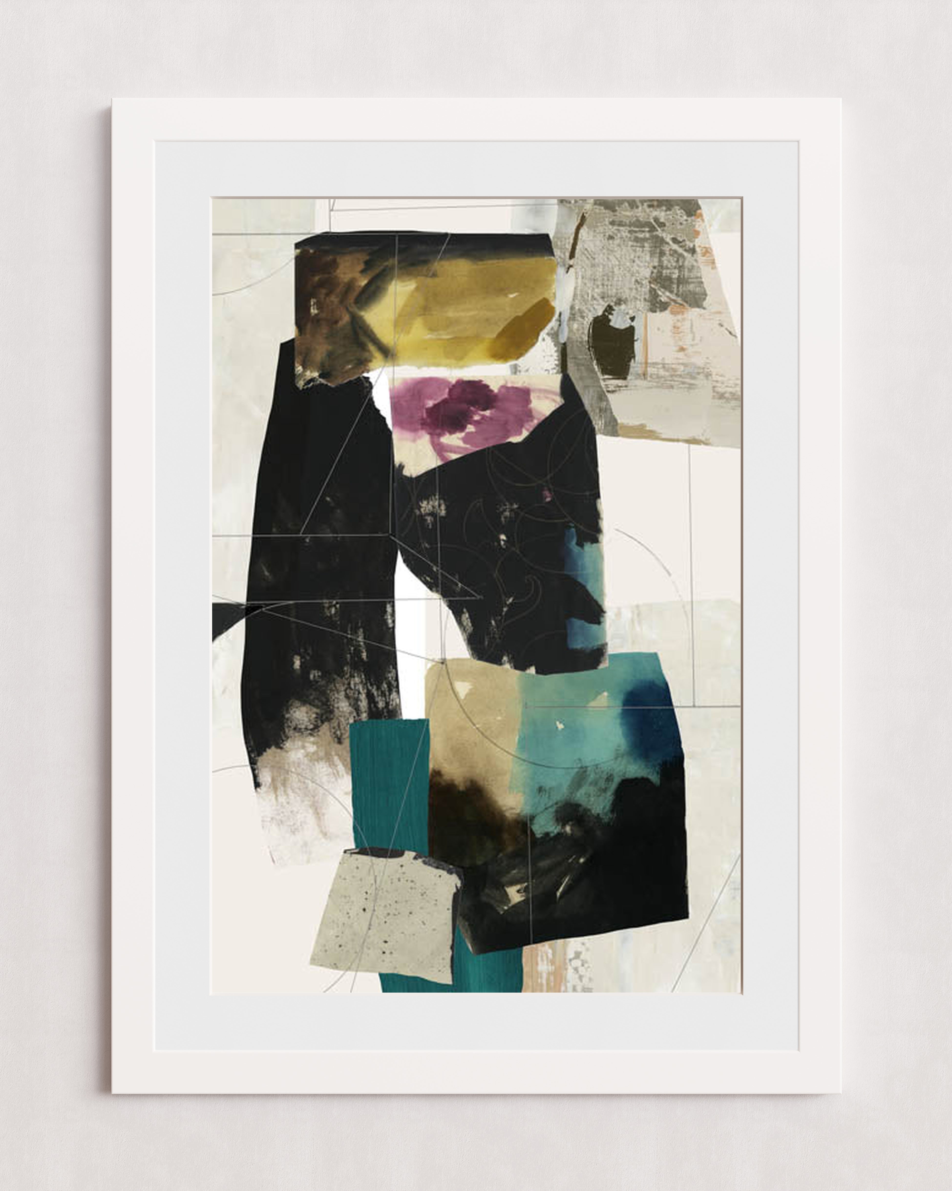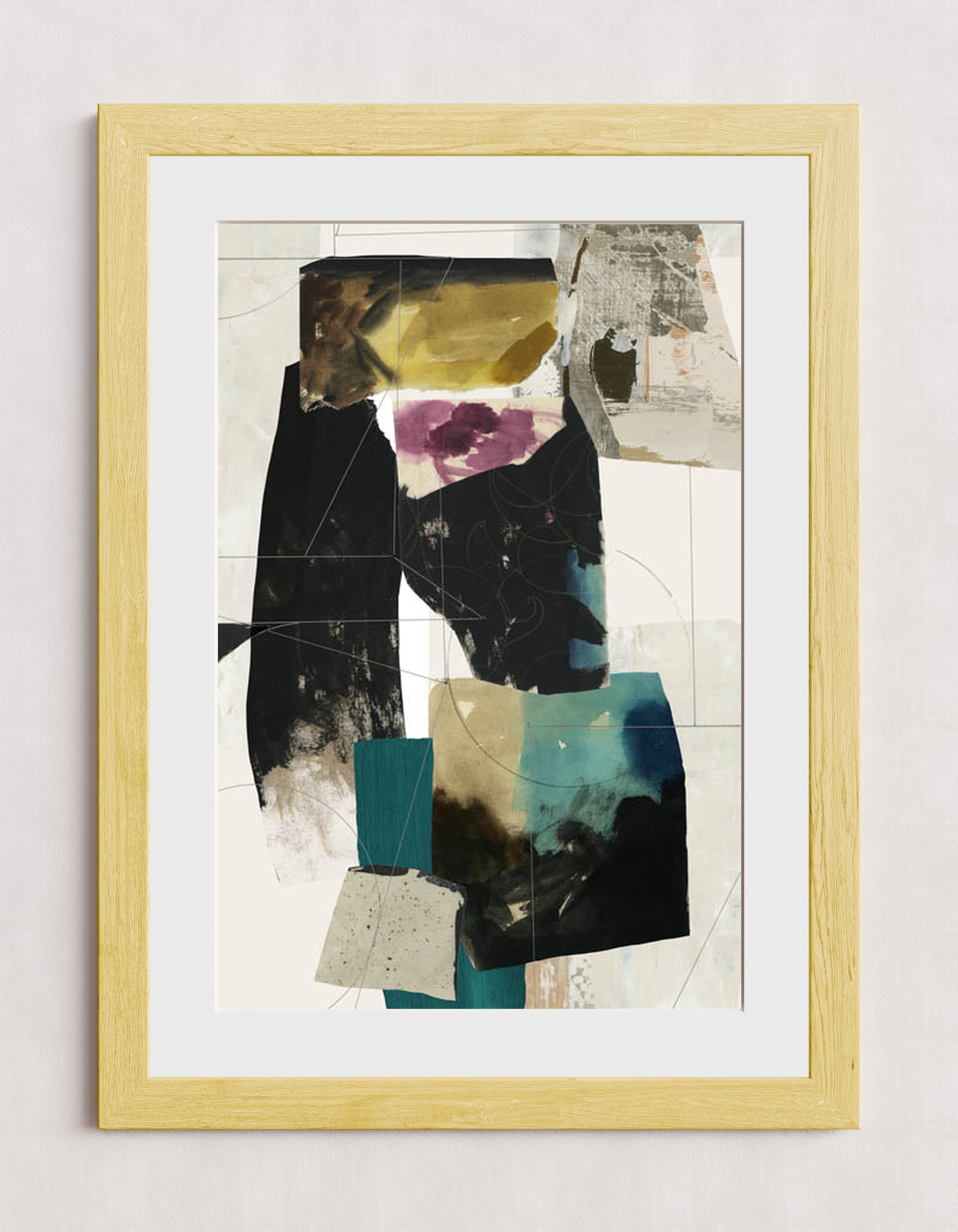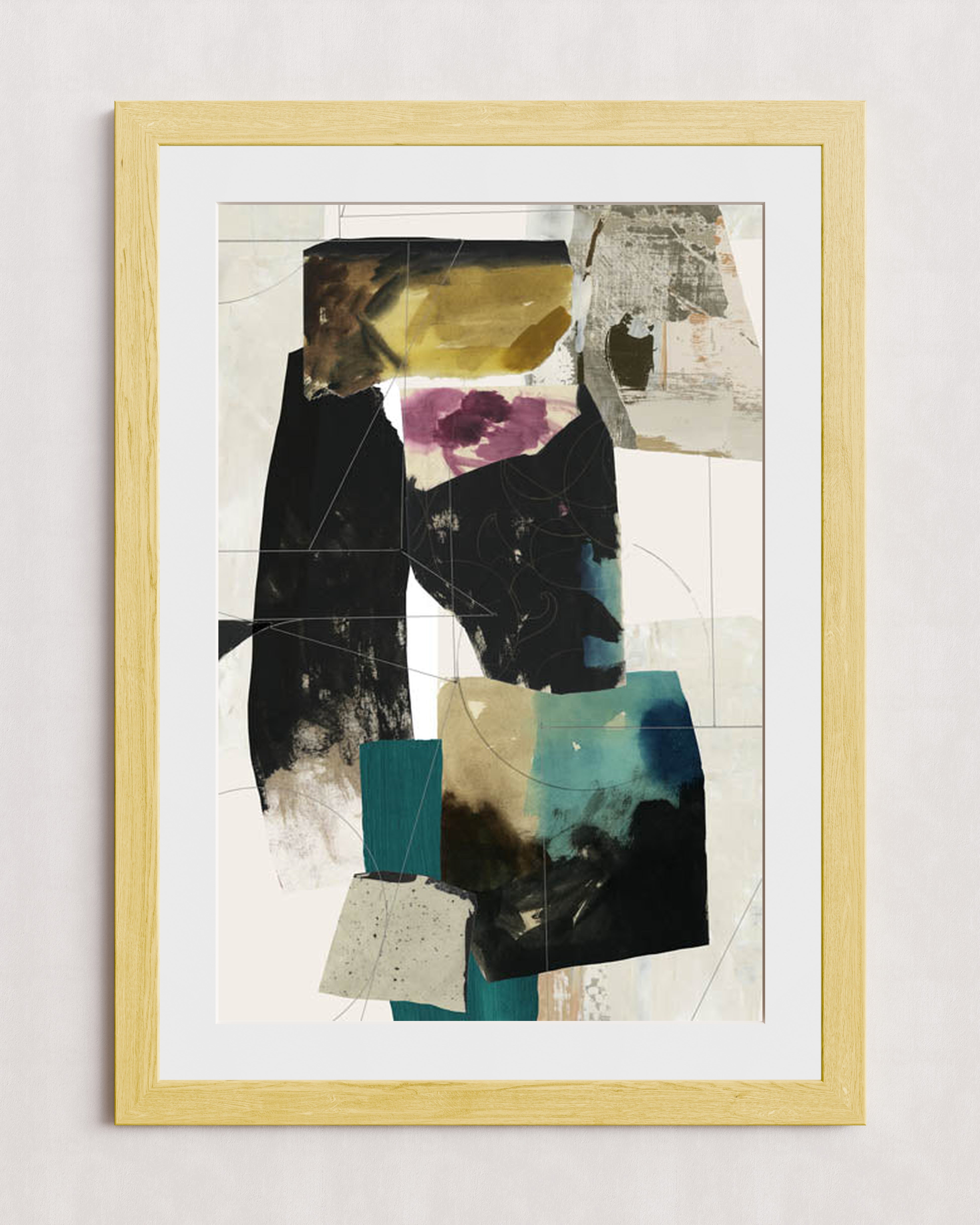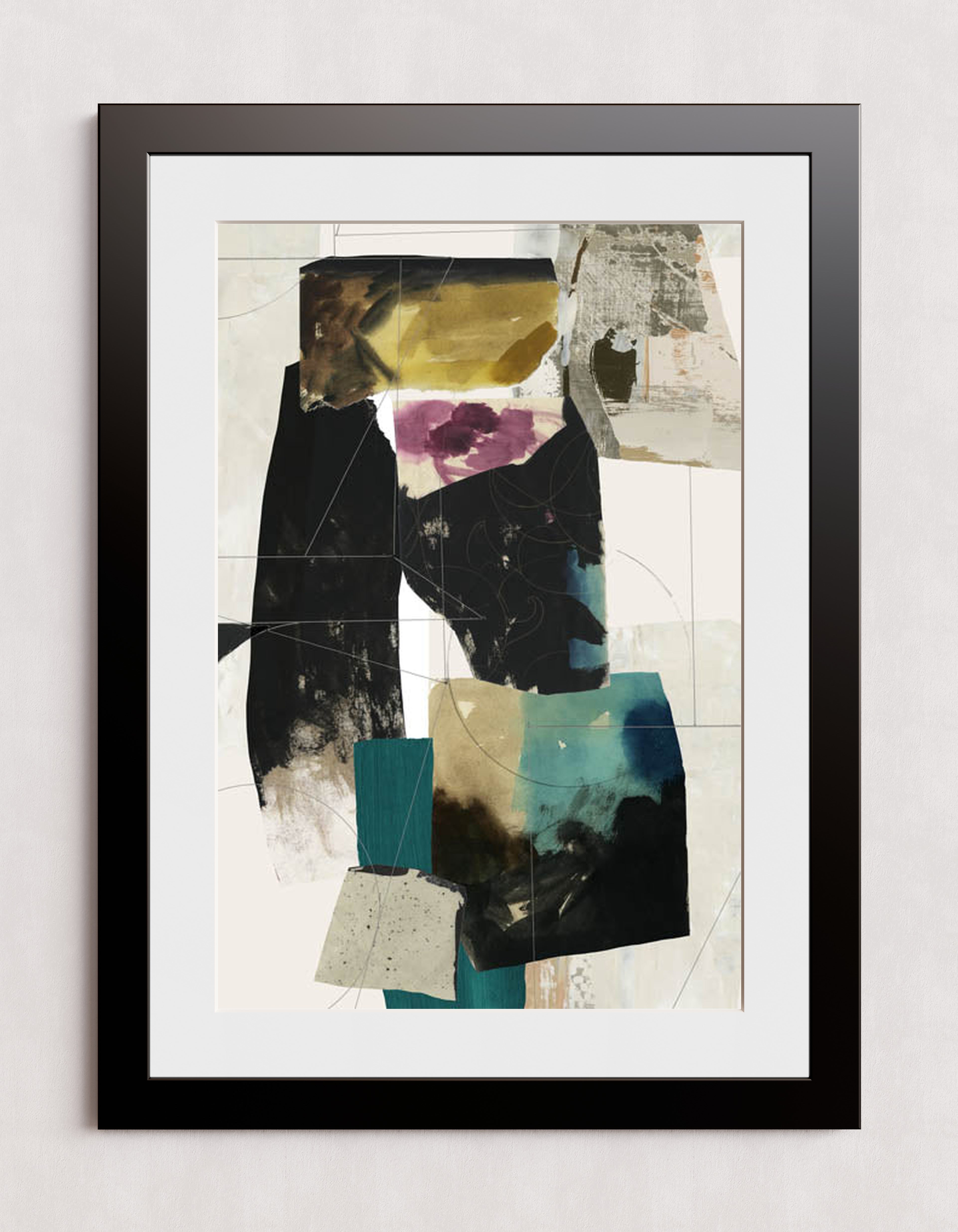 Une œuvre d'art abstraite moderne composée d'un collage de blocs de couleurs texturés dans des tons de noir, turquoise, jaune et violet. La composition mêle formes géométriques superposées et motifs organiques, créant un effet visuel dynamique.