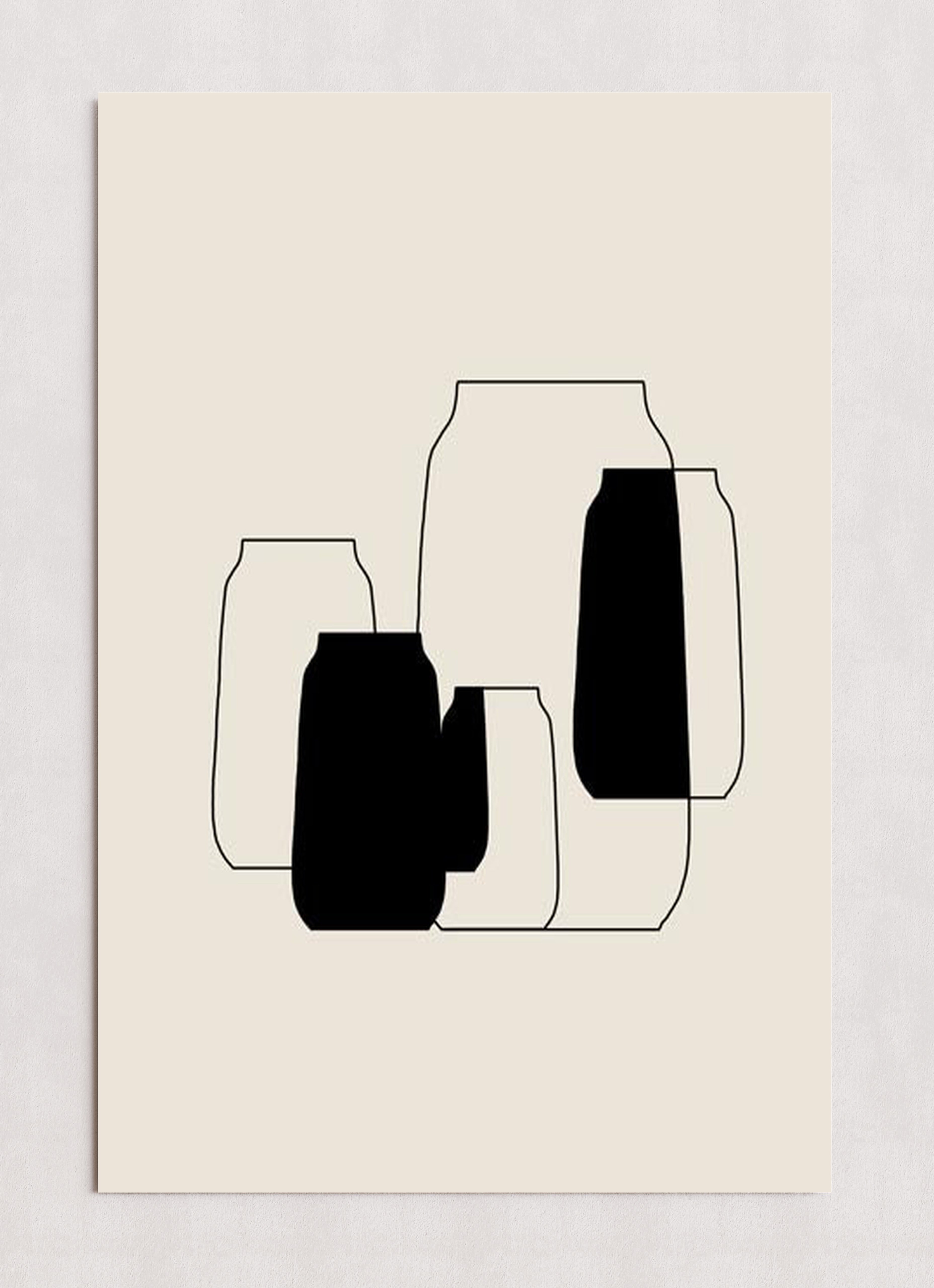 A minimalist artwork featuring black and white outlines of vases in varying sizes. The vases overlap to create a layered and abstract composition. The neutral beige background enhances the simplicity and modern aesthetic of the design.