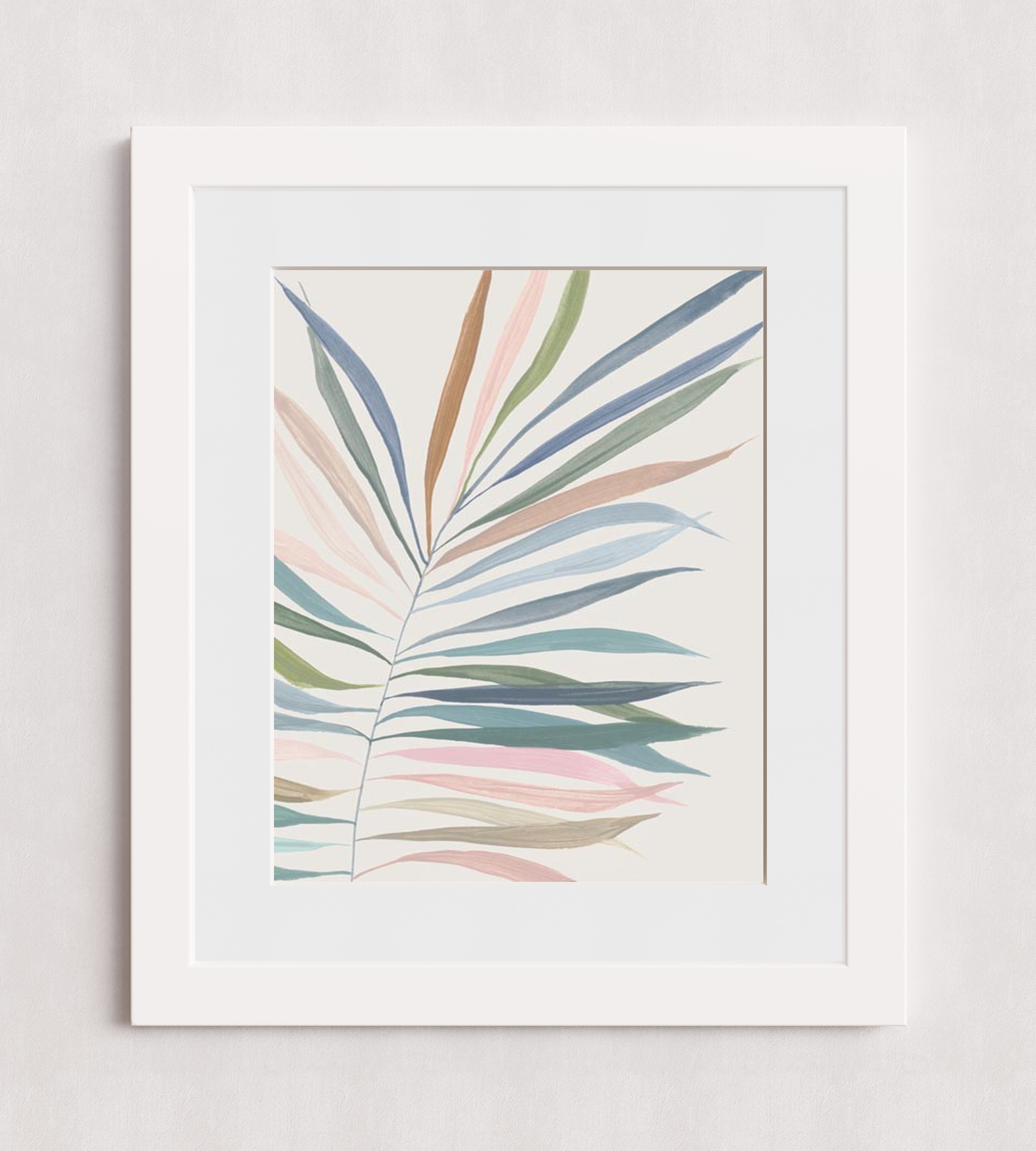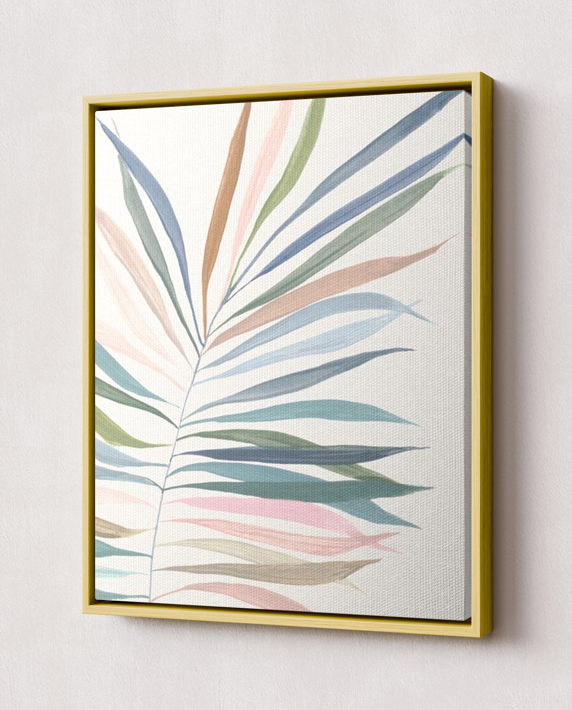 Cette peinture vibrante de feuilles de palmier présente une magnifique composition de bleus turquoise, d'oranges chauds, de beiges doux et de roses subtils. Les couleurs vives se fondent harmonieusement pour évoquer un paradis tropical, tandis que les feuilles de palmier imposantes créent une impression de profondeur et de mouvement.