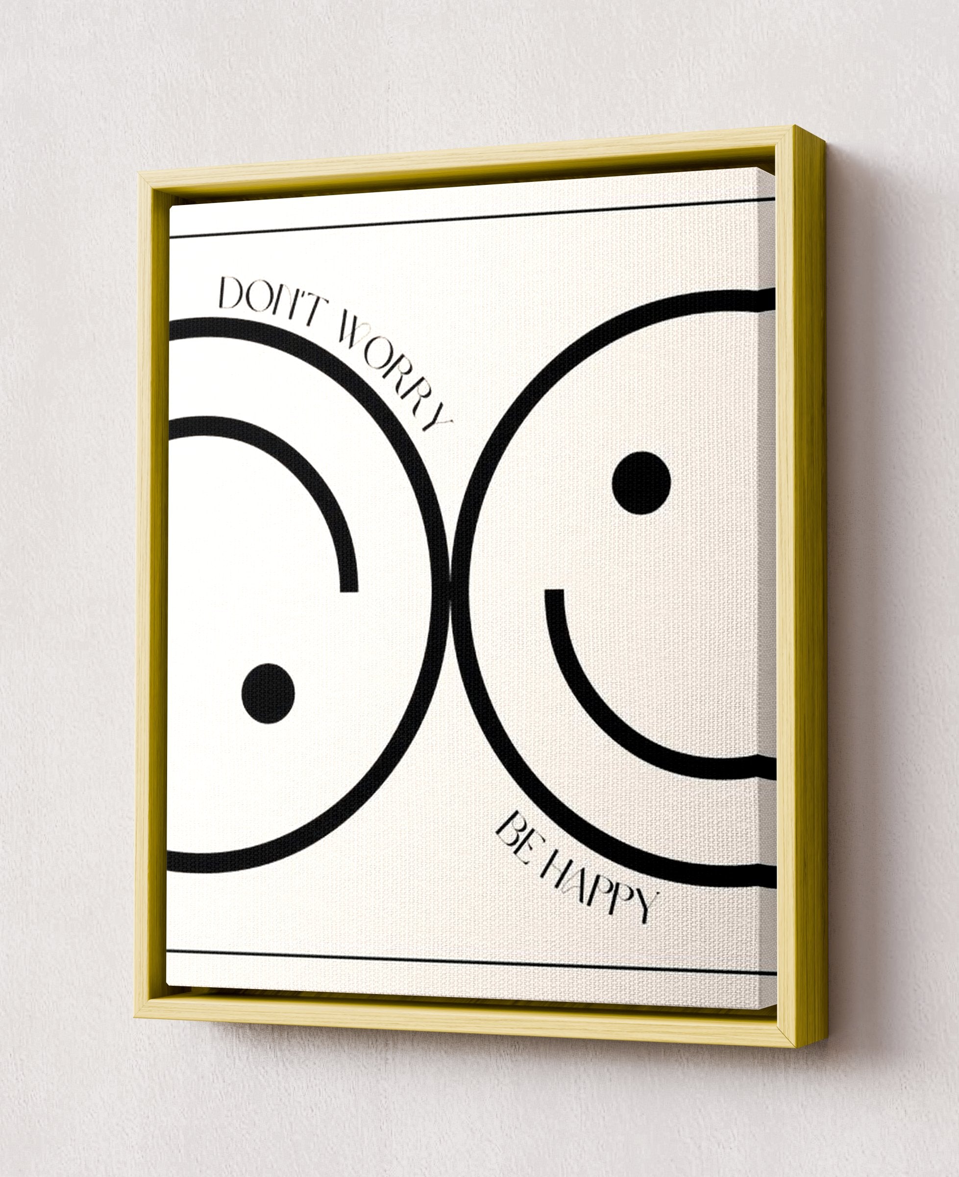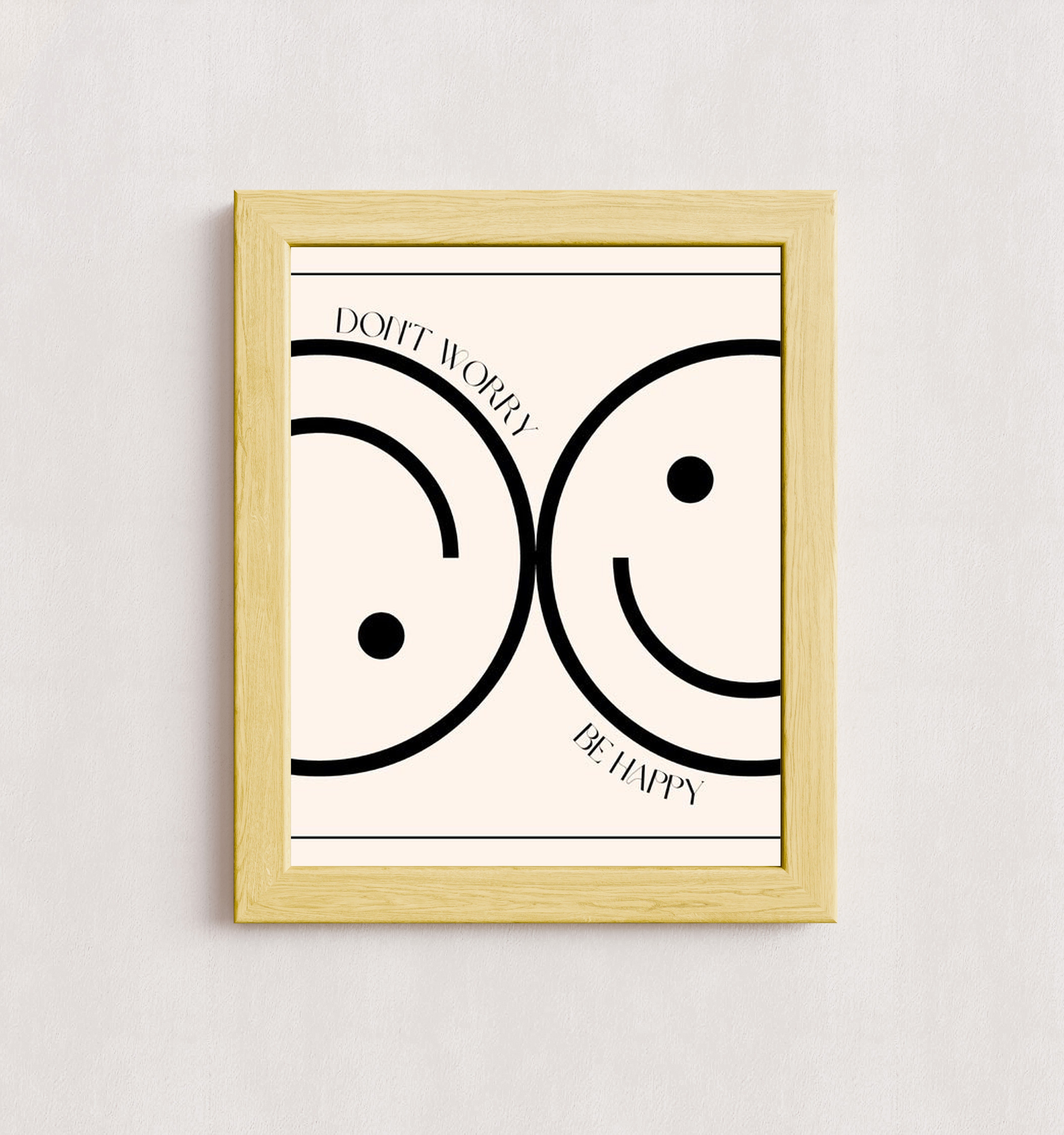 Un graphisme minimaliste représentant deux visages souriants entrelacés, avec les textes « Ne t'inquiète pas » et « Sois heureux » affichés en courbes. Le design utilise une palette monochrome avec des lignes noires sur fond beige, créant une esthétique épurée et moderne.