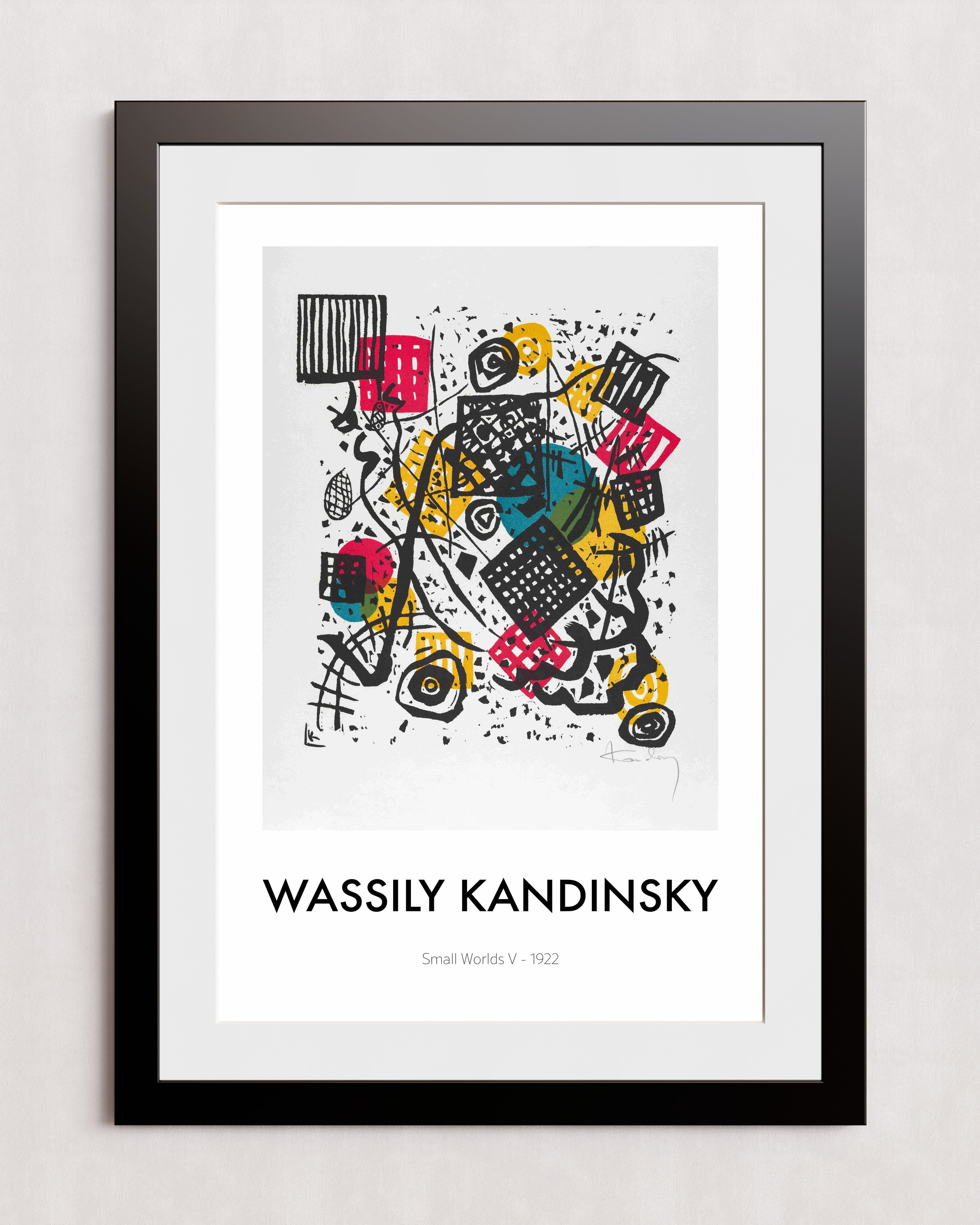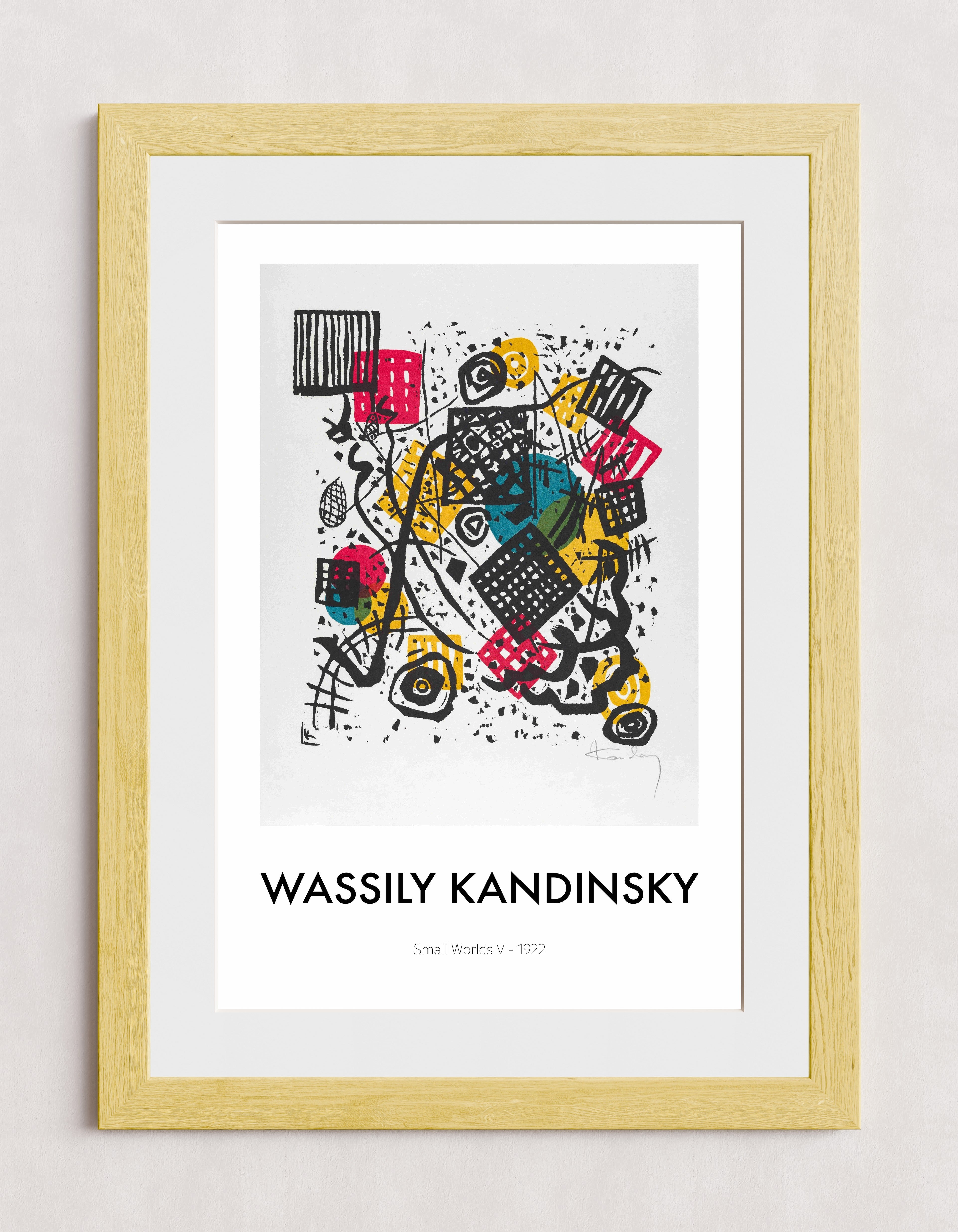 Œuvre abstraite de Wassily Kandinsky intitulée « Petits mondes V », datant de 1922. La composition présente des formes géométriques, des lignes audacieuses et des couleurs vibrantes, notamment le jaune, le rouge et le turquoise. La signature de l'artiste est visible en bas à droite, tandis que le titre et l'année sont inscrits sous l'œuvre.