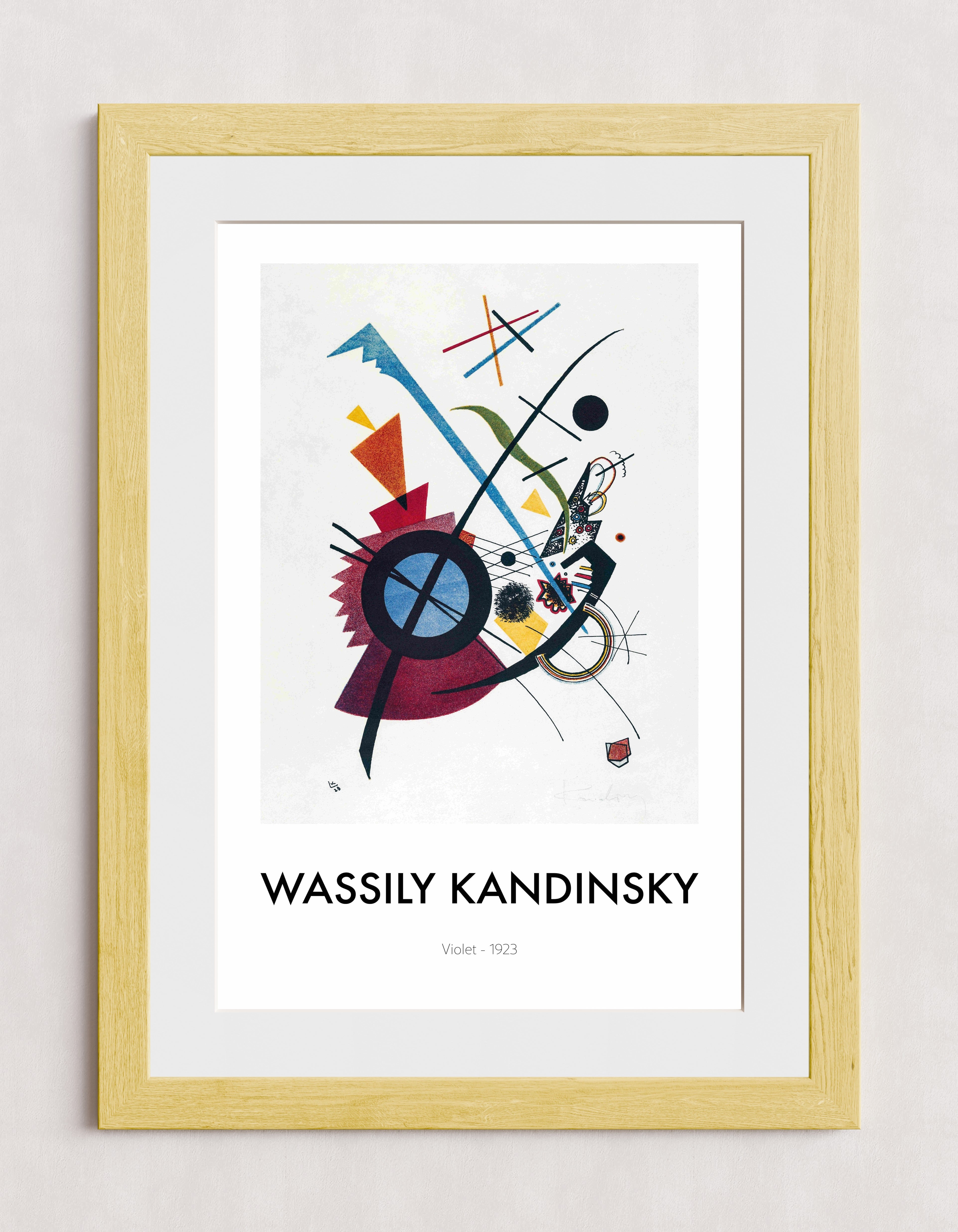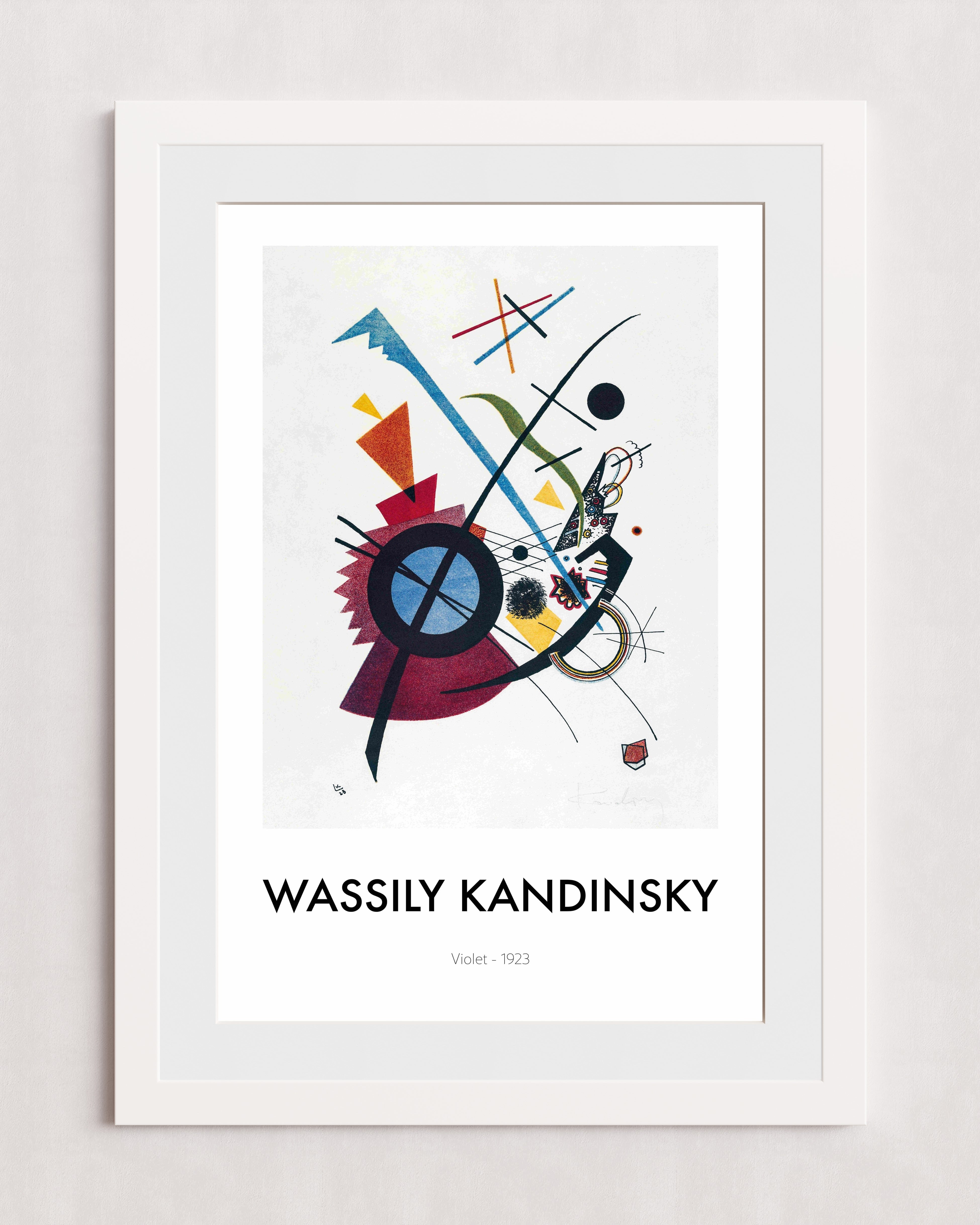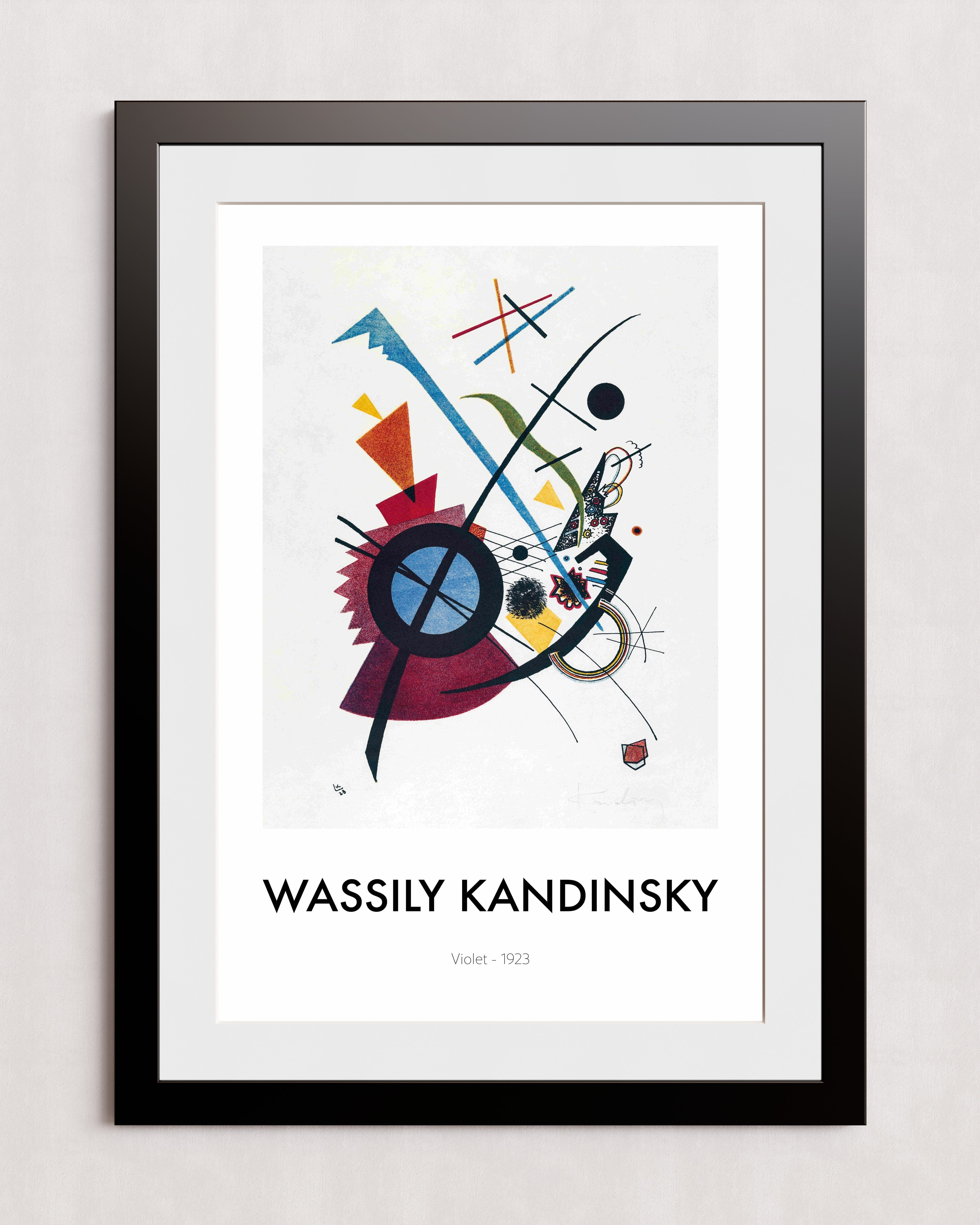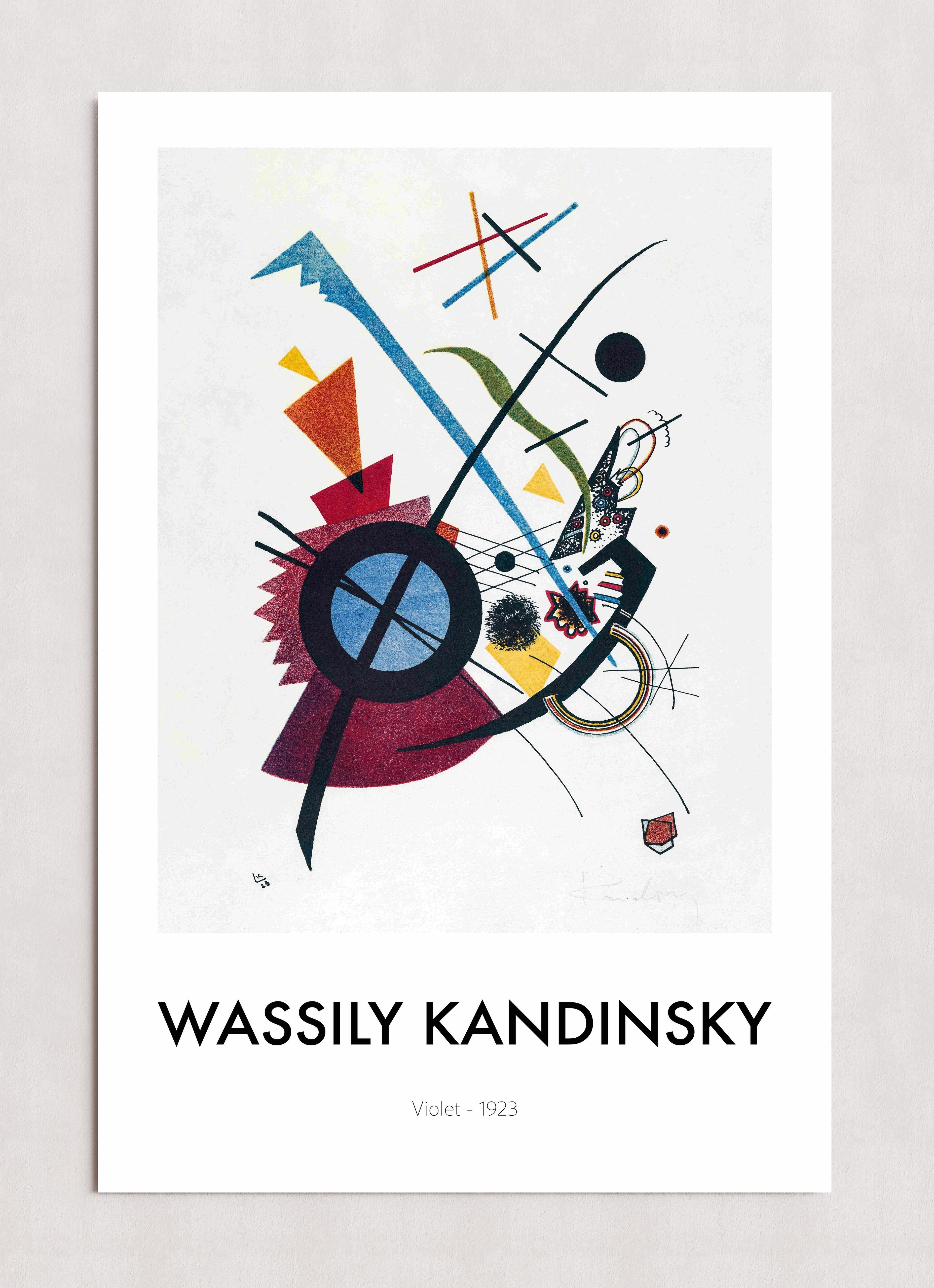 Une œuvre abstraite de Wassily Kandinsky intitulée « Violet », datant de 1923. La composition présente des formes géométriques, des lignes entrecroisées et des couleurs vibrantes comme le rouge, le bleu, le jaune et le noir. Le nom de l'artiste et le titre de l'œuvre sont clairement indiqués sous la toile.