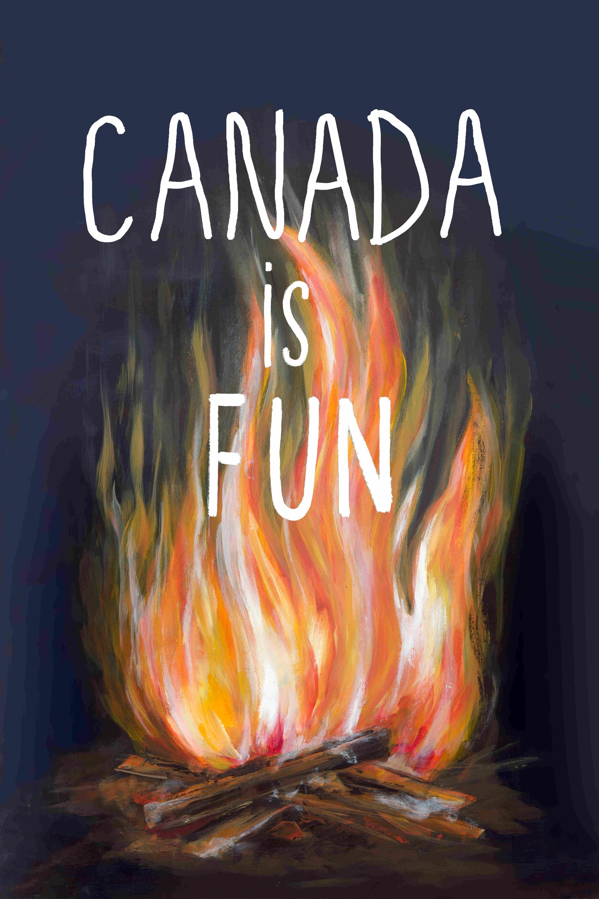 A vibrant illustration features a campfire with lively flames, set against a dark background. Inspired by the hit show Heated Rivalry, 'CANADA is FUN' is prominently displayed above the fire in bold, white hand-lettered text.