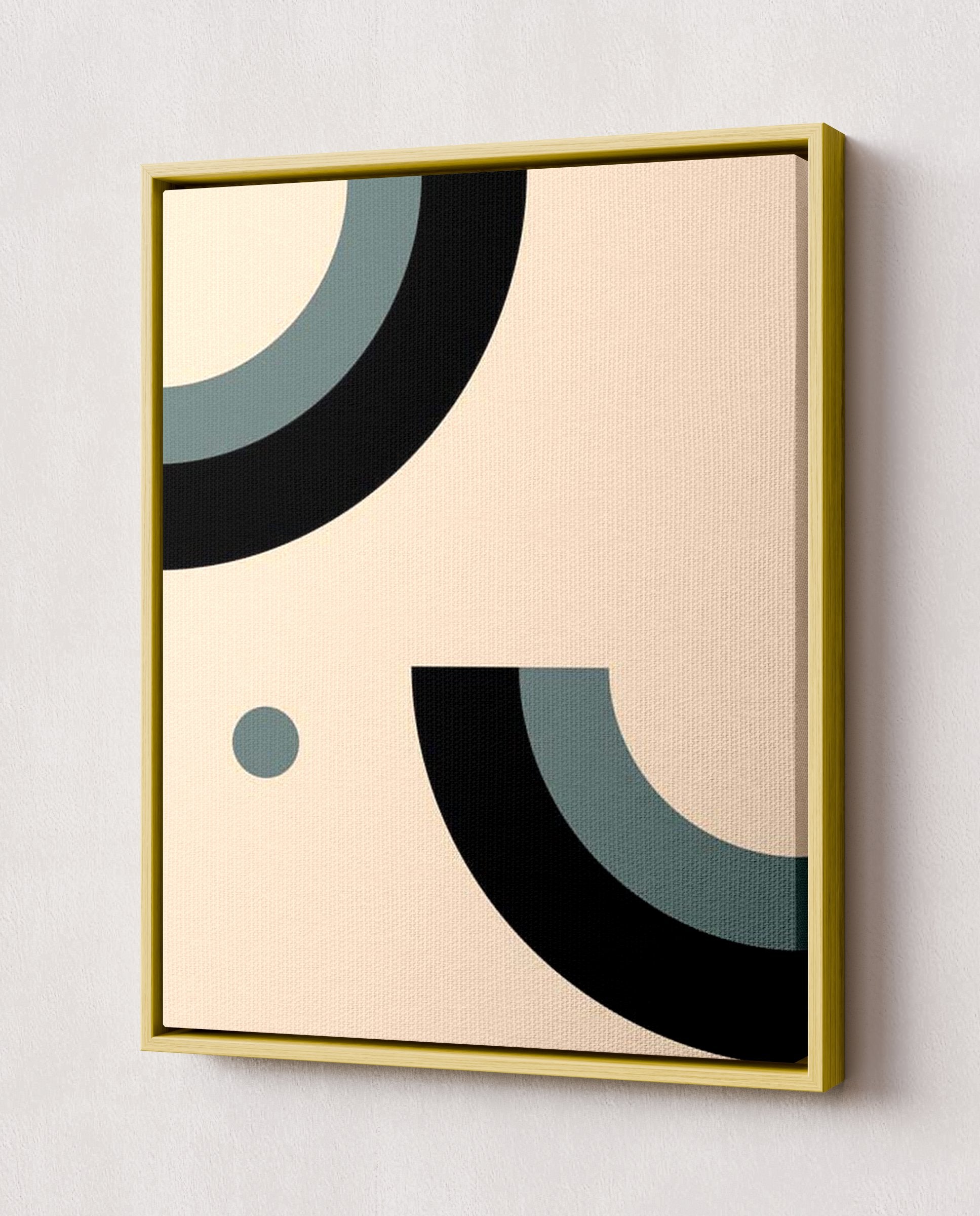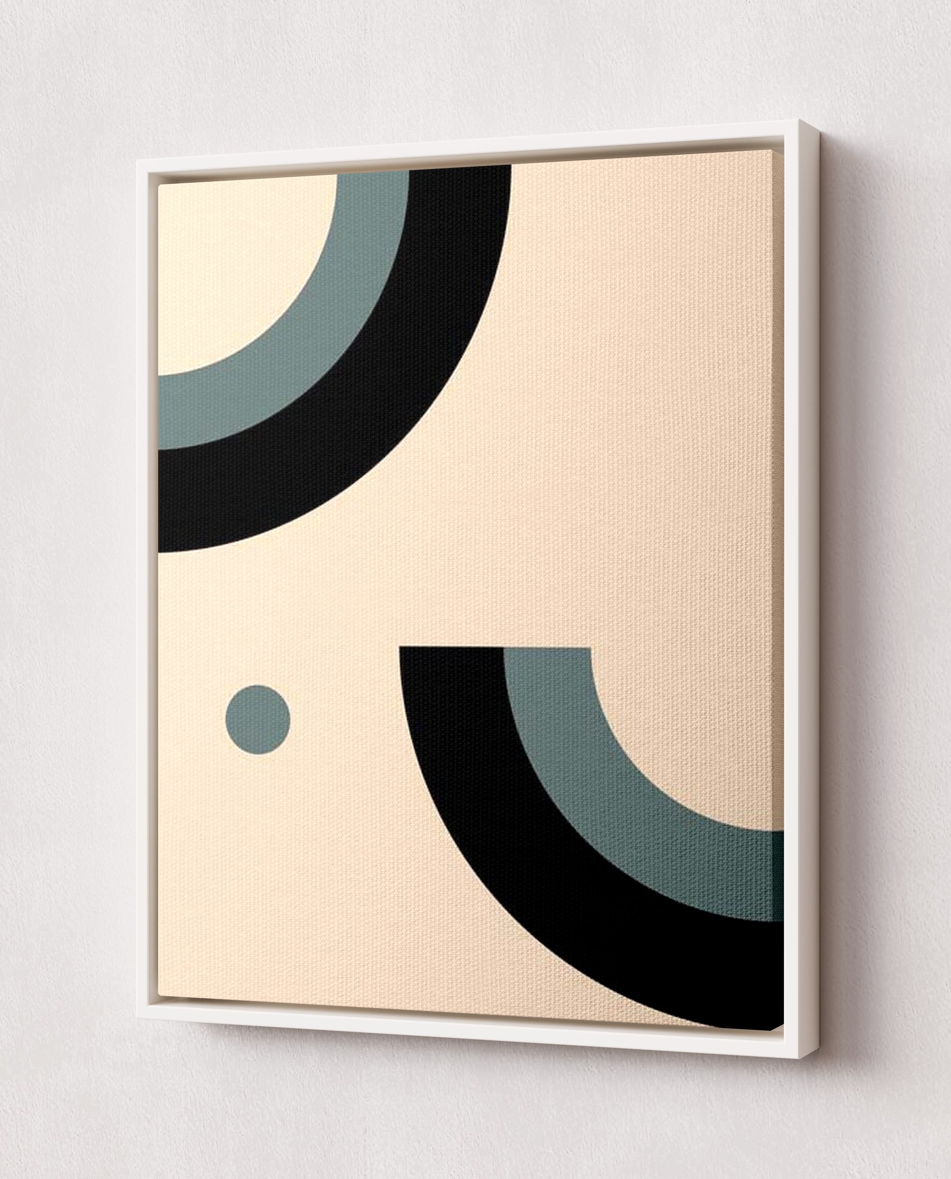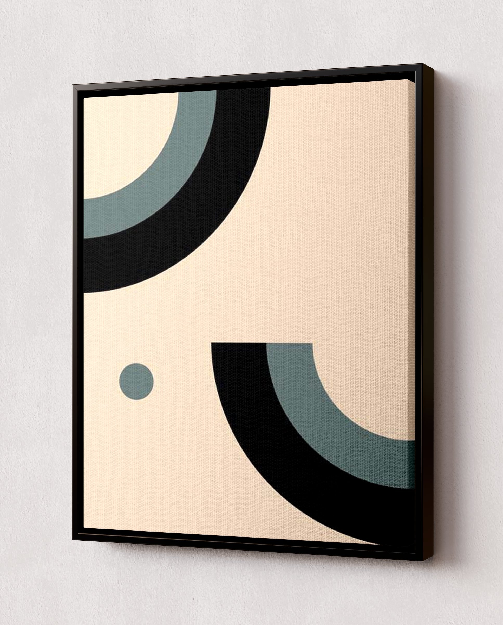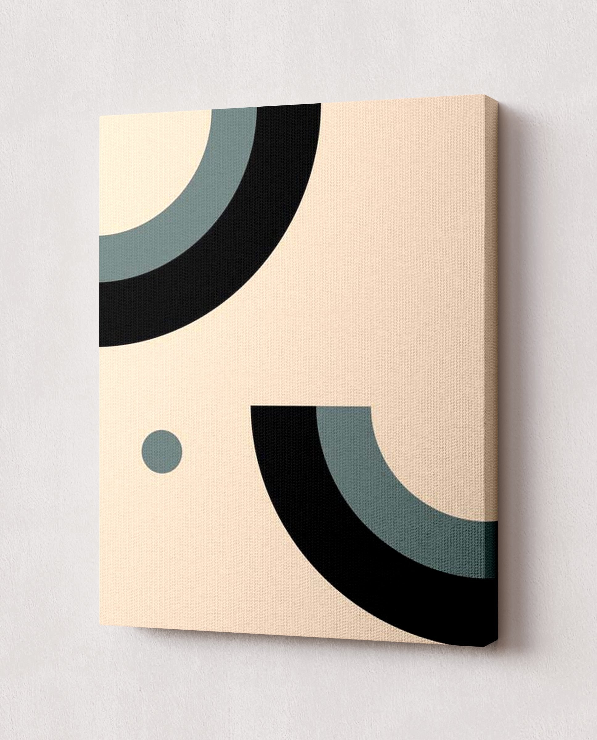 A minimalist abstract artwork featuring bold black and gray semi-circles and a dot on a beige background. The design emphasizes clean lines and geometric shapes, creating a modern and sophisticated aesthetic.