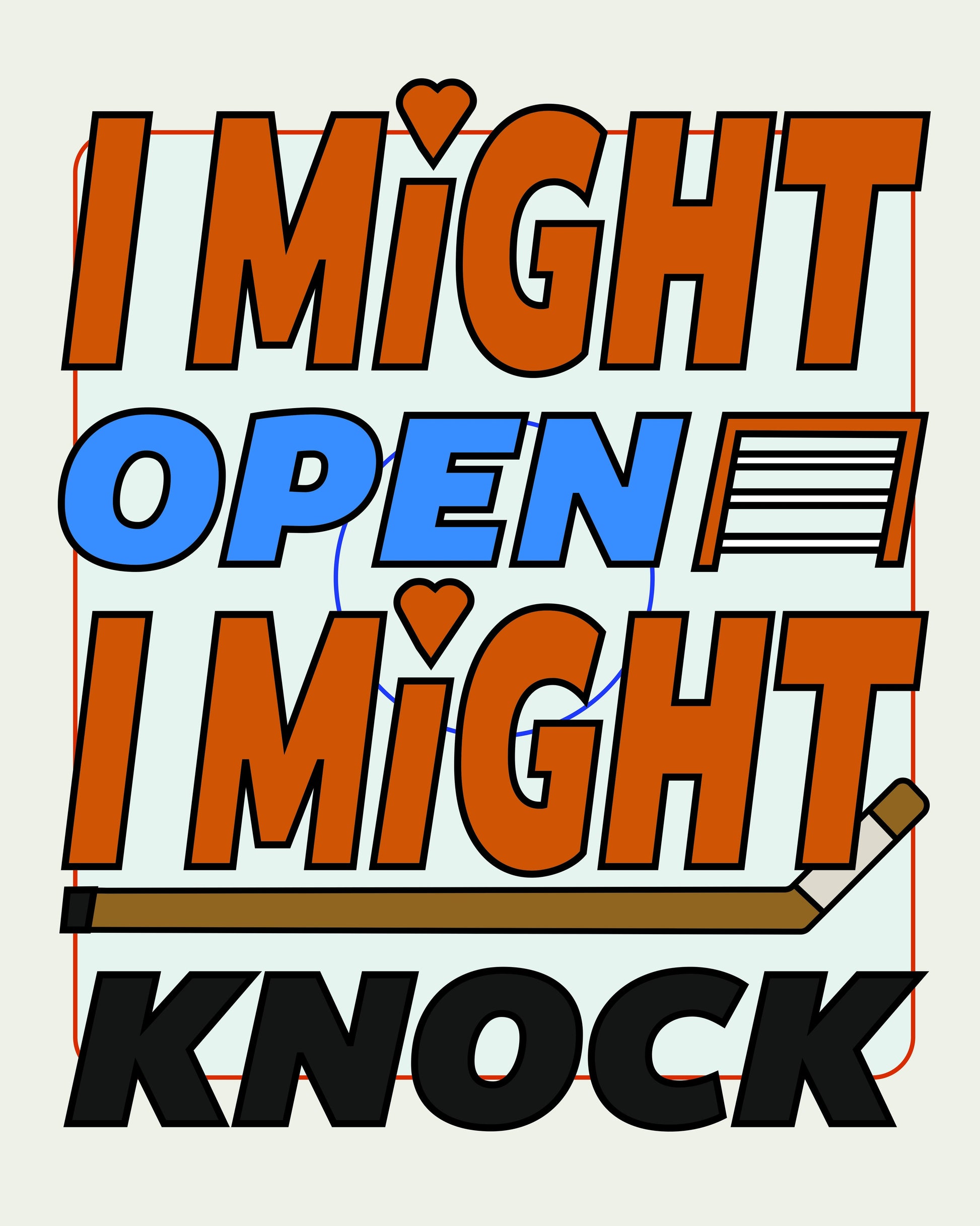 The image features a bold, colorful typographic quote inspired by the hit show Heated Rivalry. The words 'I MIGHT OPEN I MIGHT KNOCK.' are presented in orange, blue, and black, with heart shapes replacing the dots on the letter 'I.'