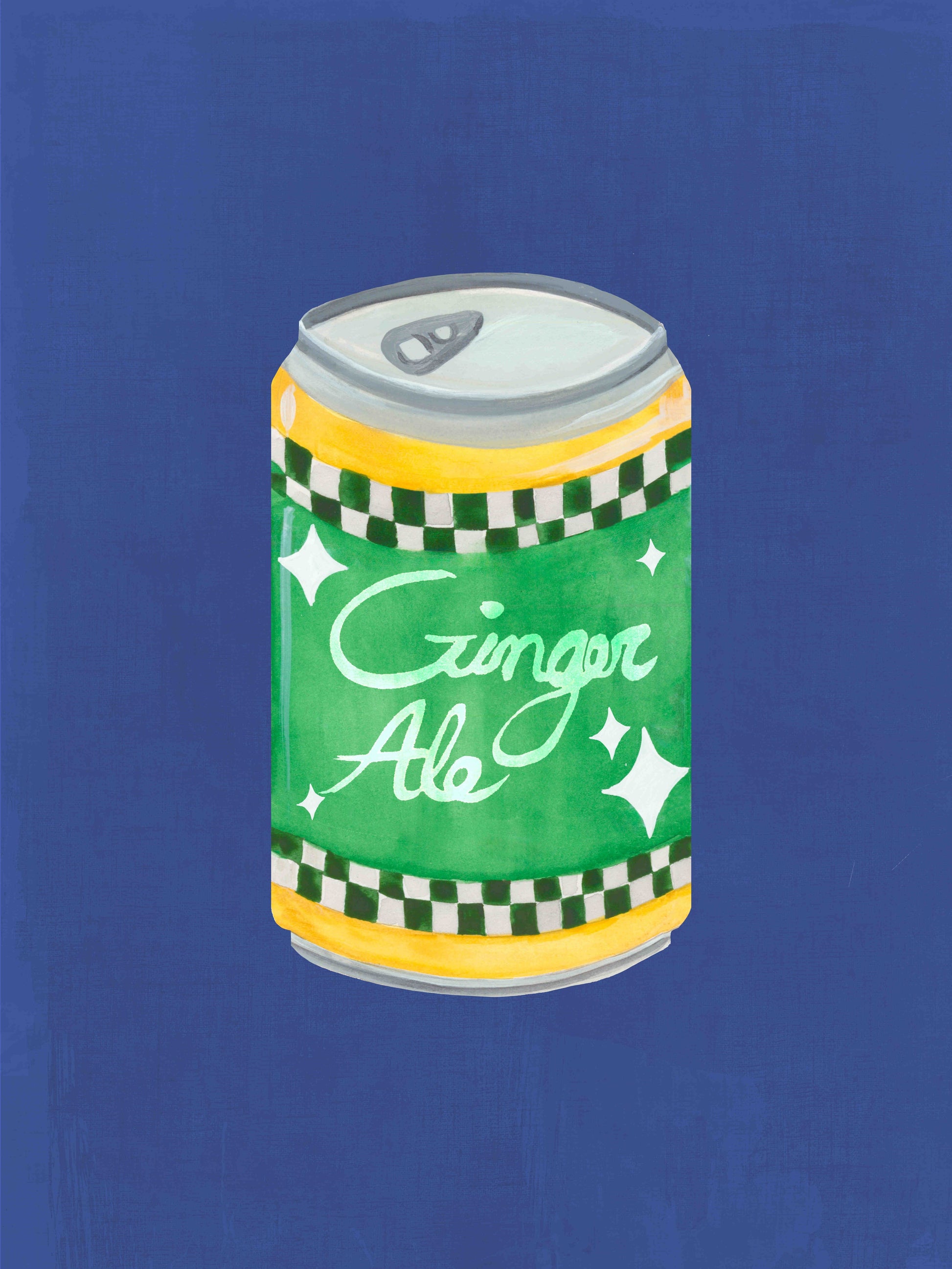 A hand-drawn illustration inspired by the show Heated Rivalry, features a green can labeled 'Ginger Ale' with a checkered black and white border near the top and bottom.