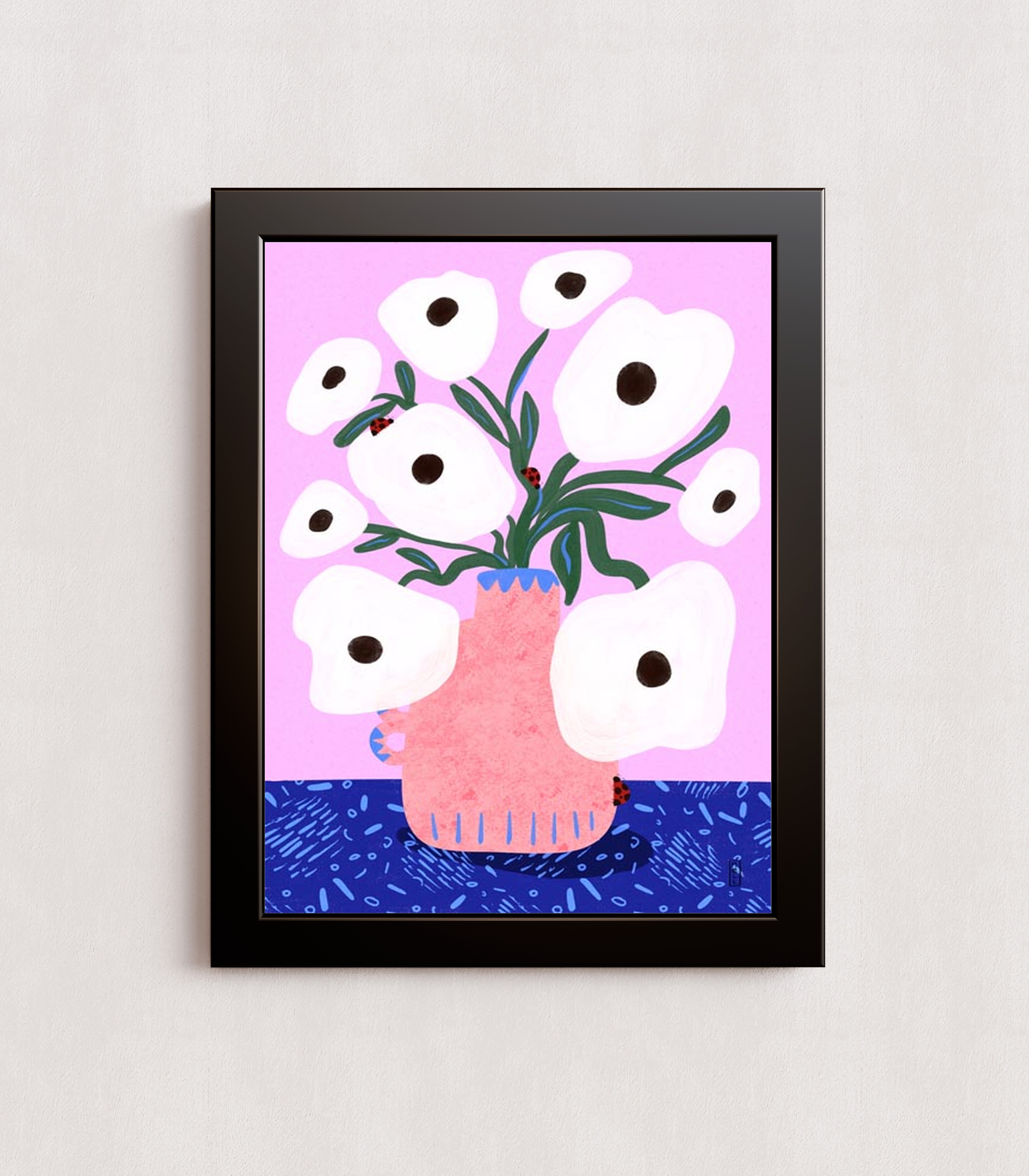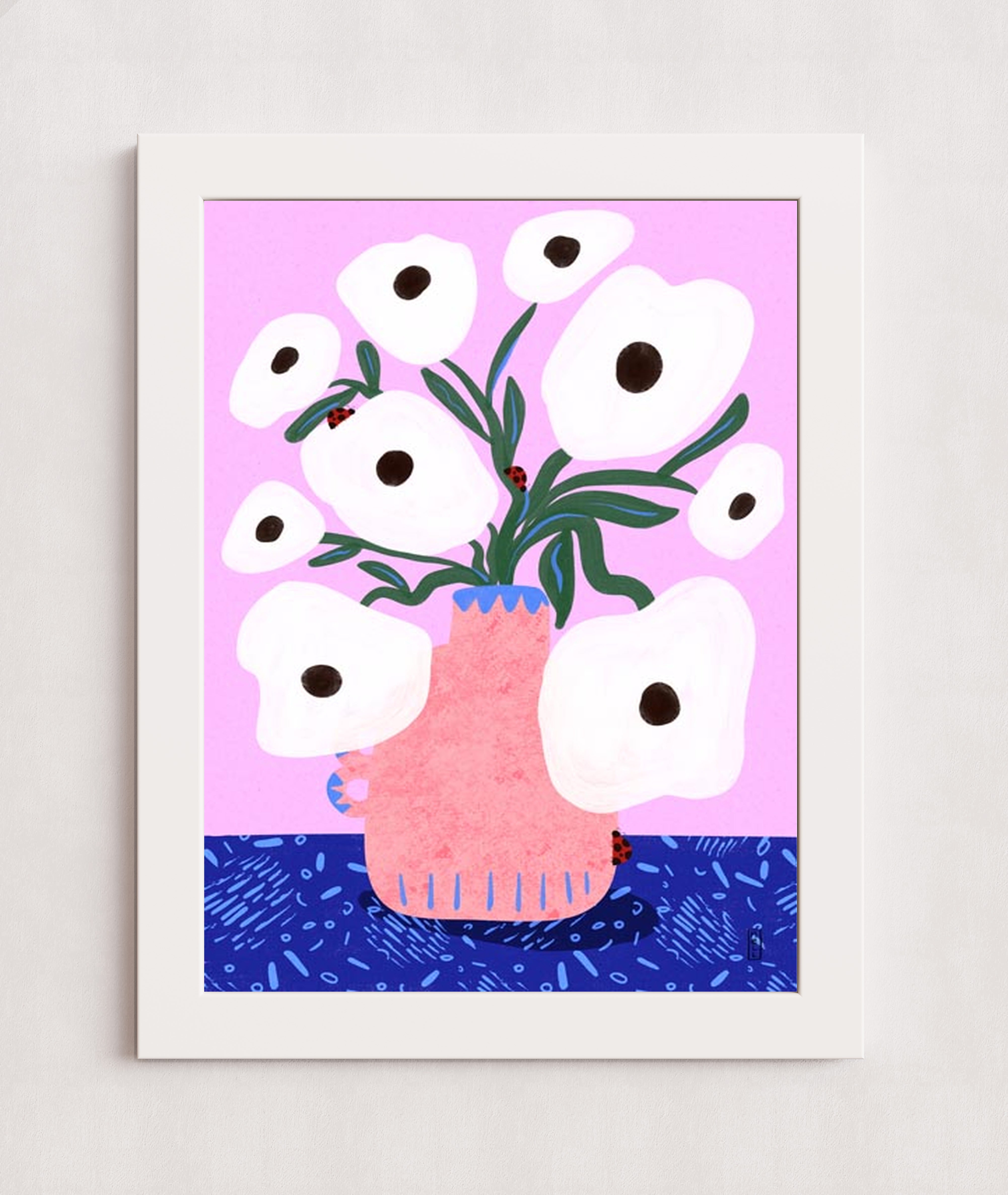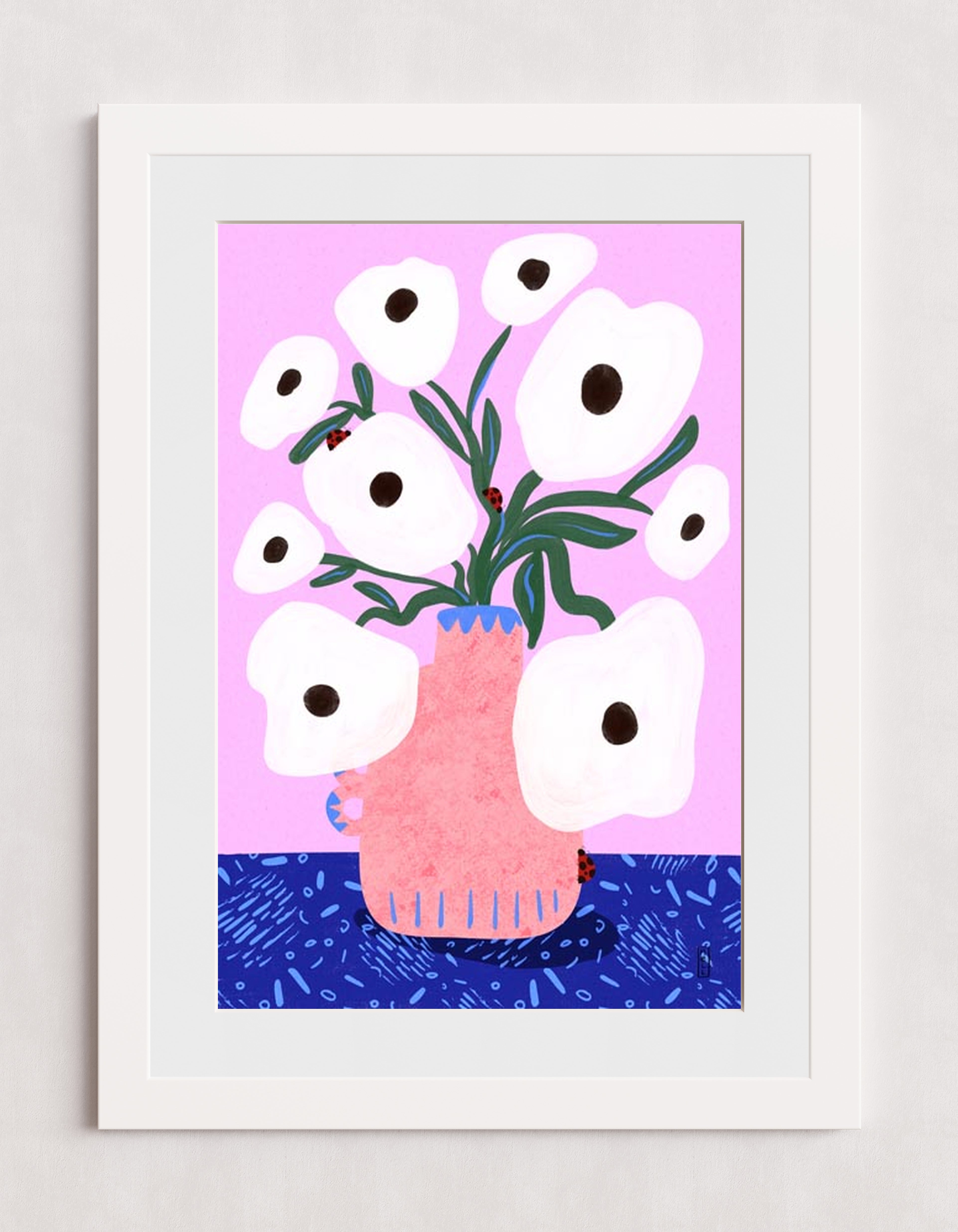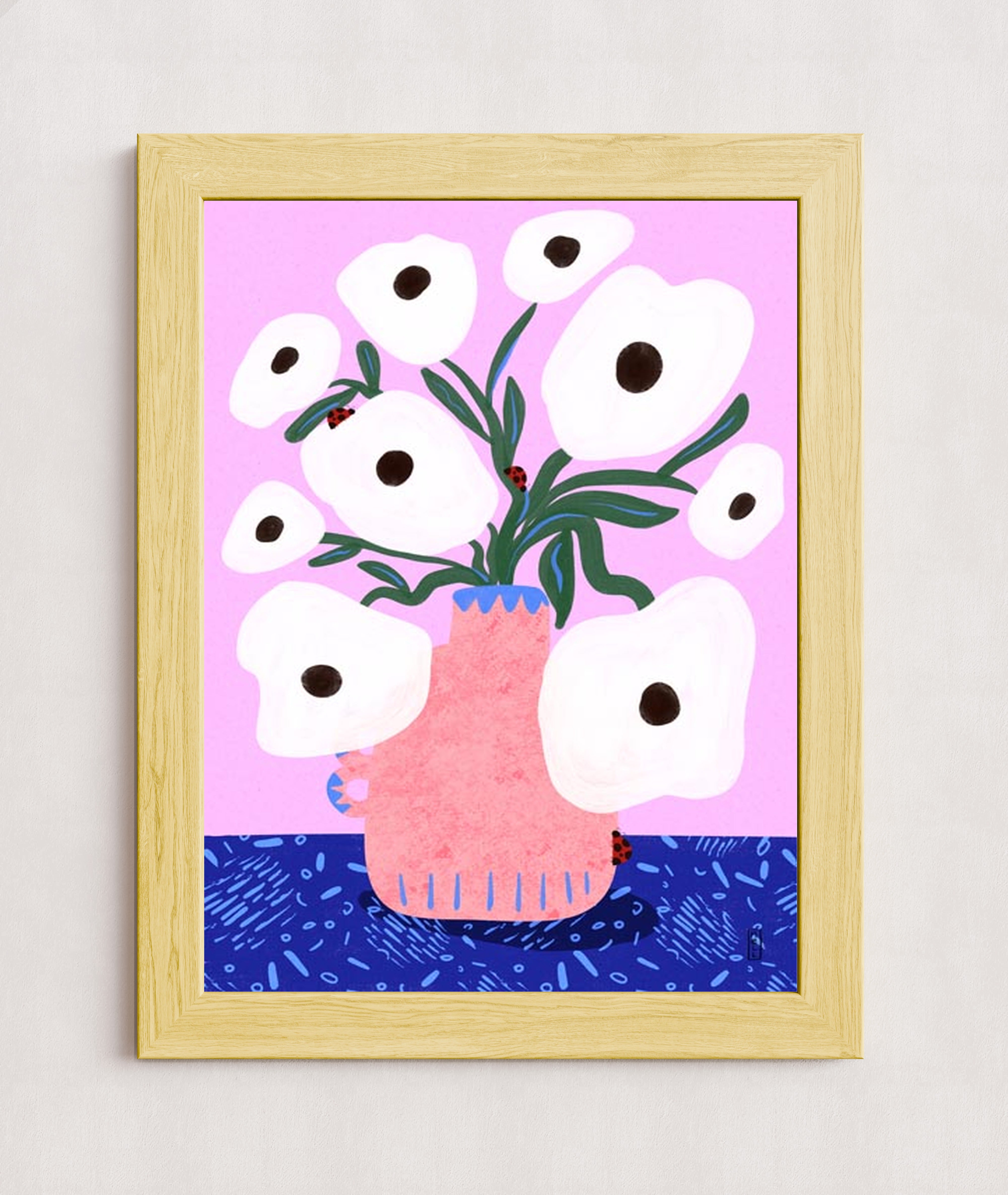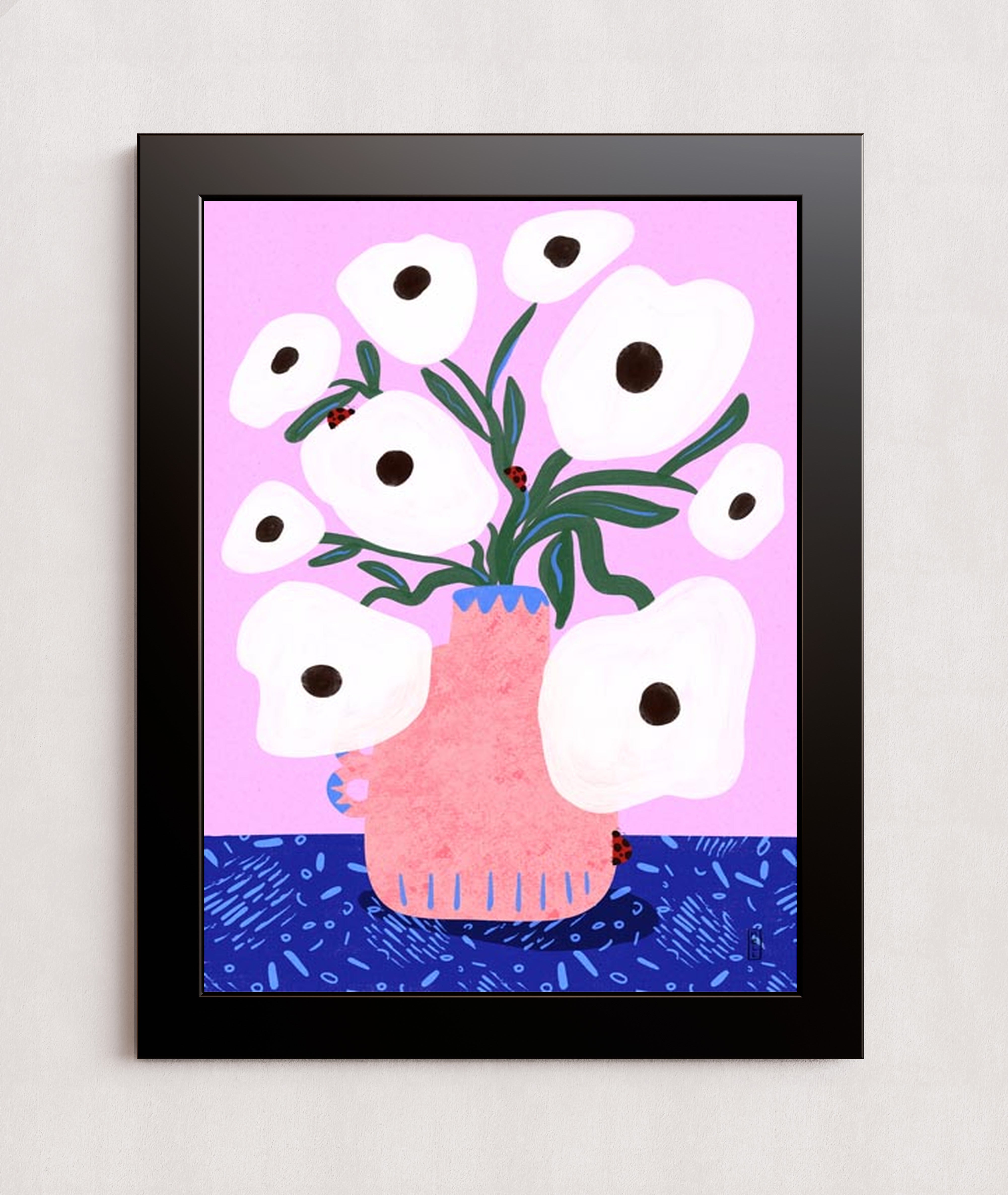 A vibrant illustration featuring a pink vase holding white flowers with black centers. The setting includes a patterned blue surface and a pink background, creating a playful and colorful aesthetic. Small ladybugs are visible on the flowers and leaves, adding a whimsical touch.