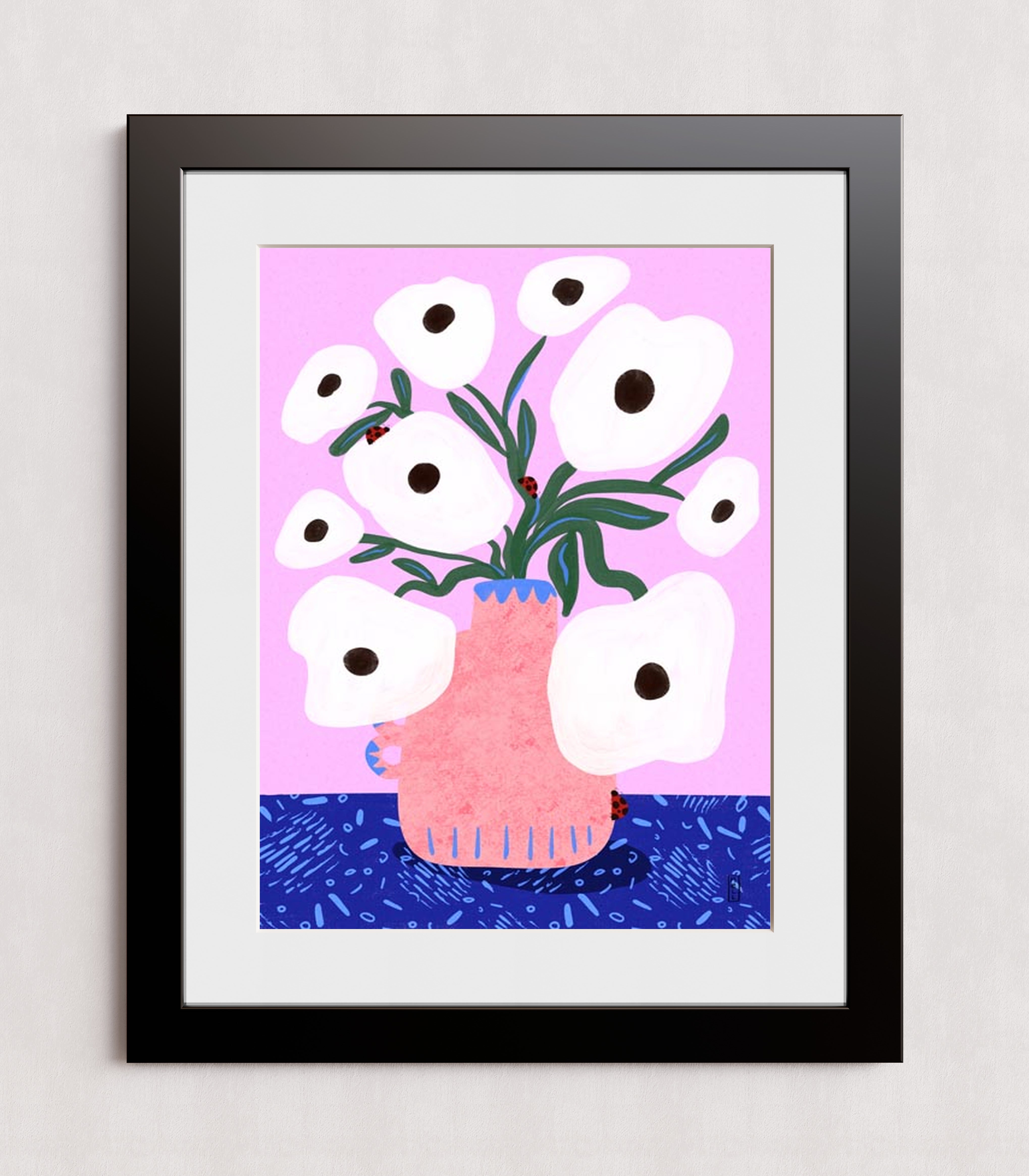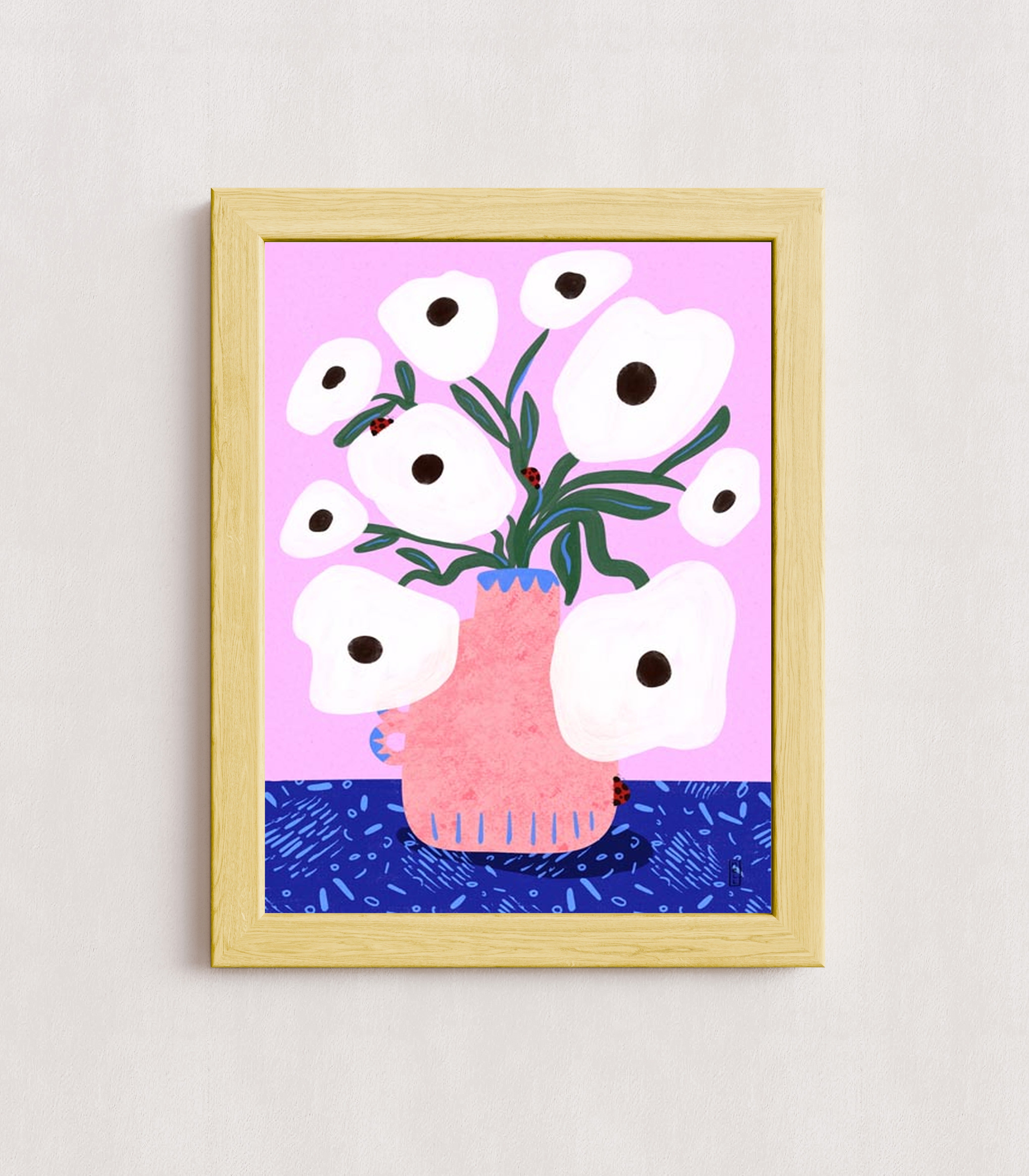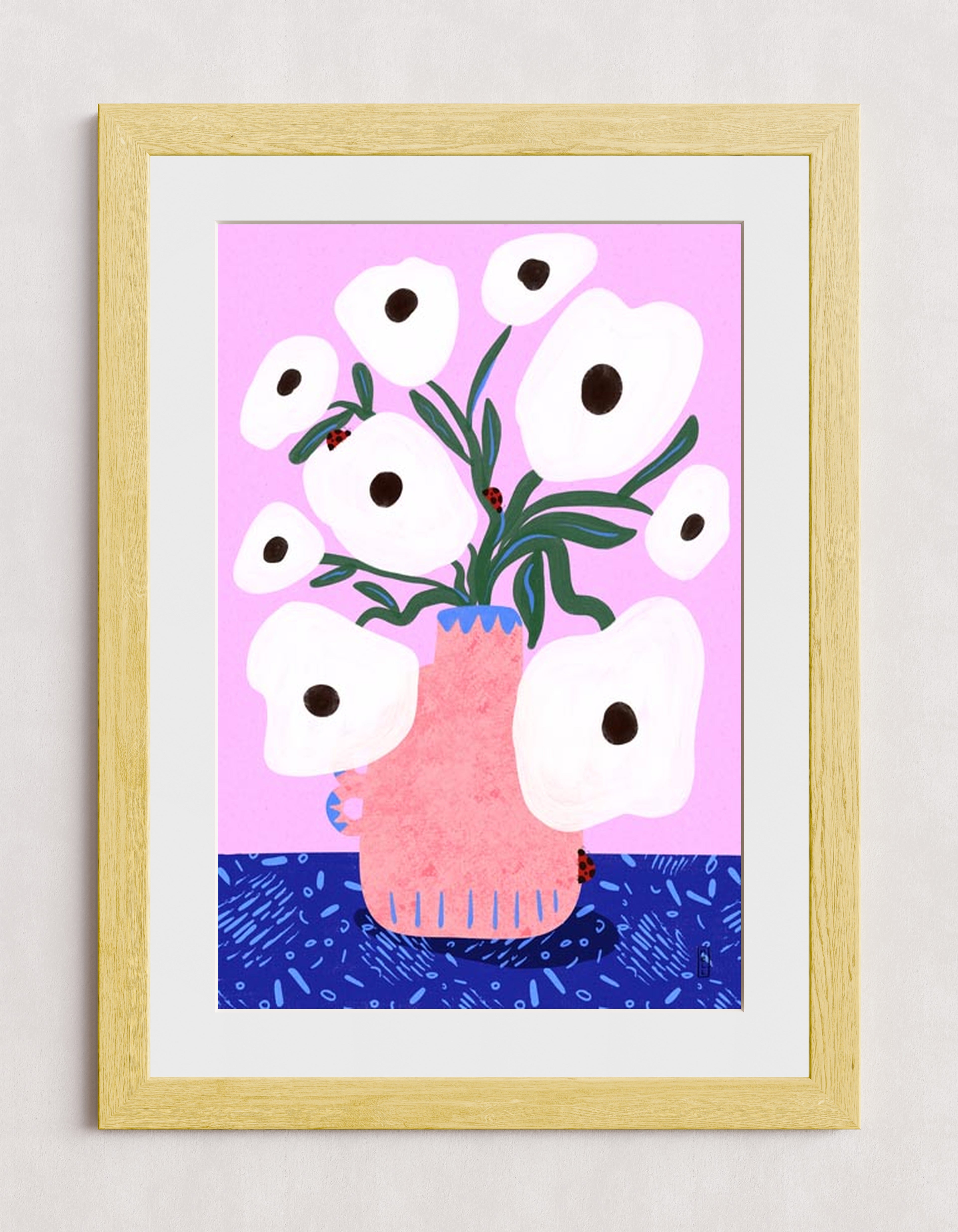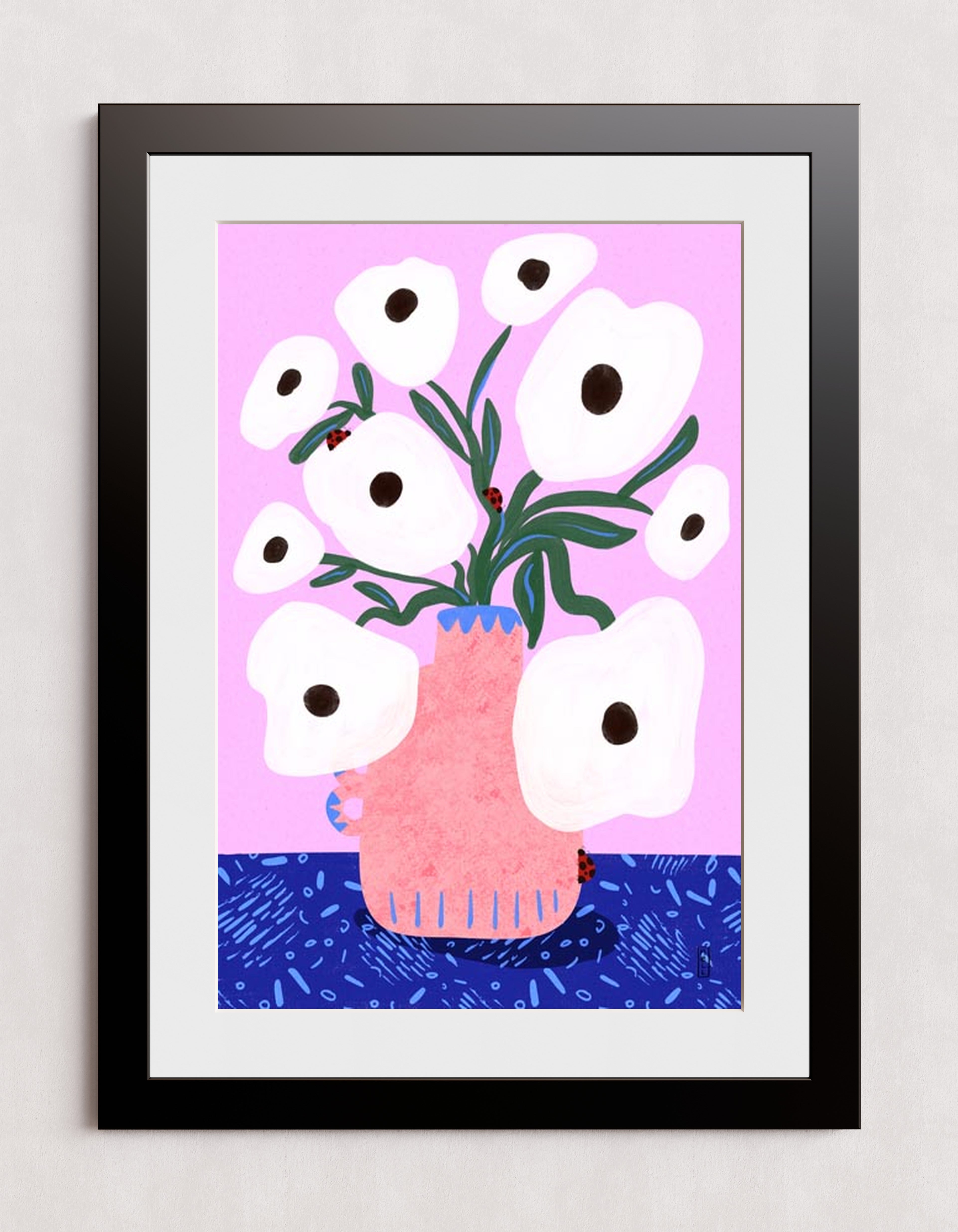 A vibrant illustration featuring a pink vase holding white flowers with black centers. The setting includes a patterned blue surface and a pink background, creating a playful and colorful aesthetic. Small ladybugs are visible on the flowers and leaves, adding a whimsical touch.