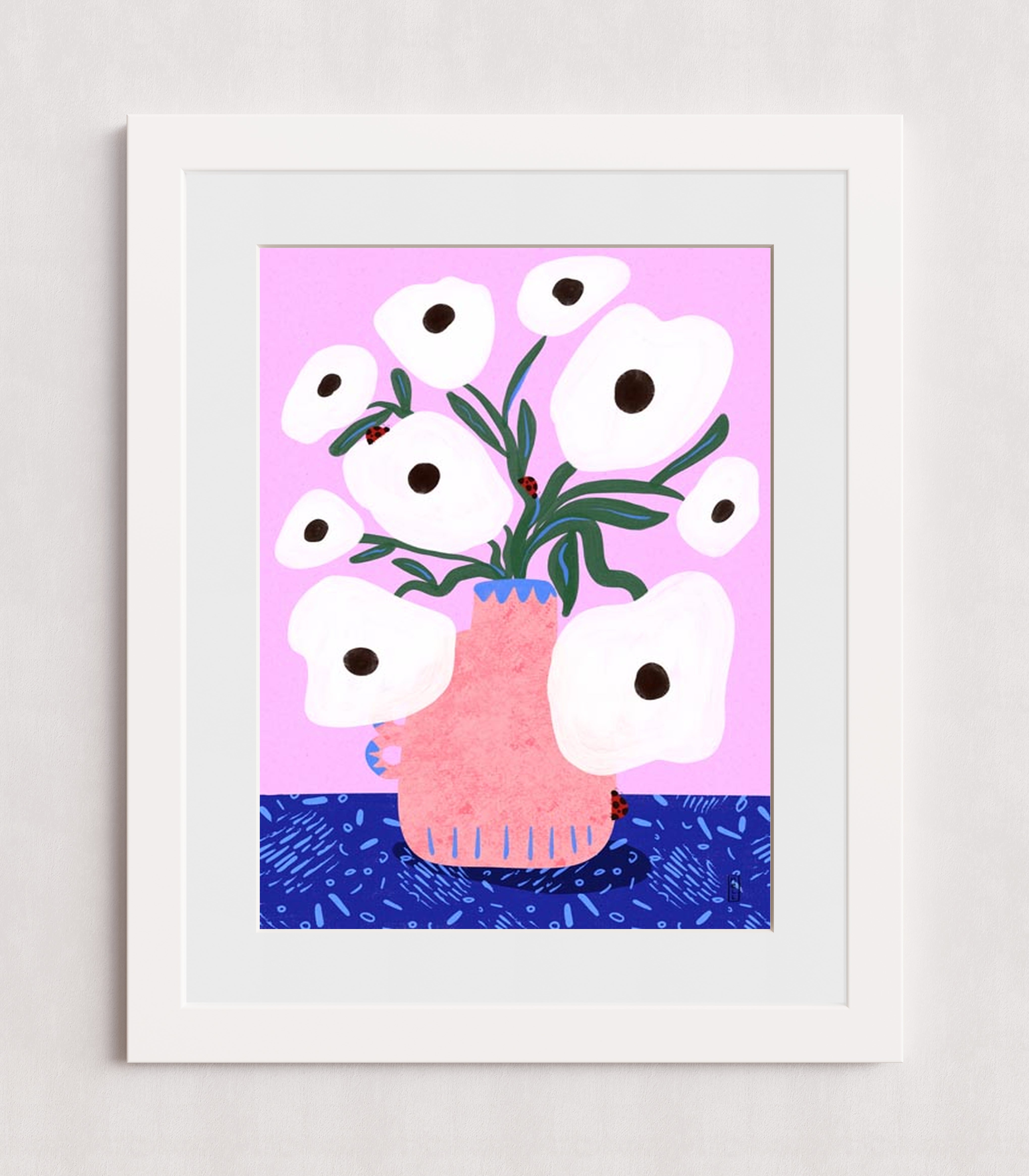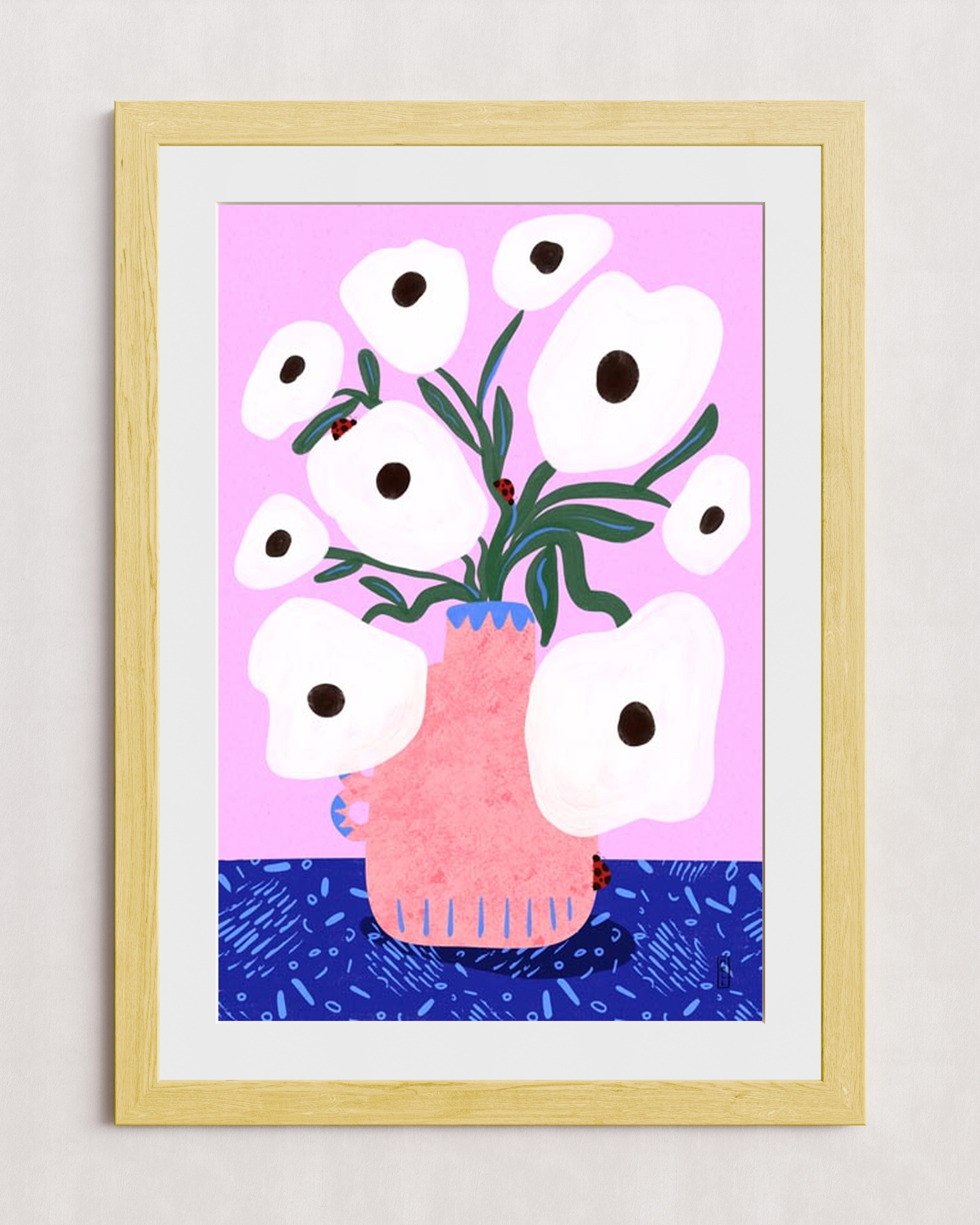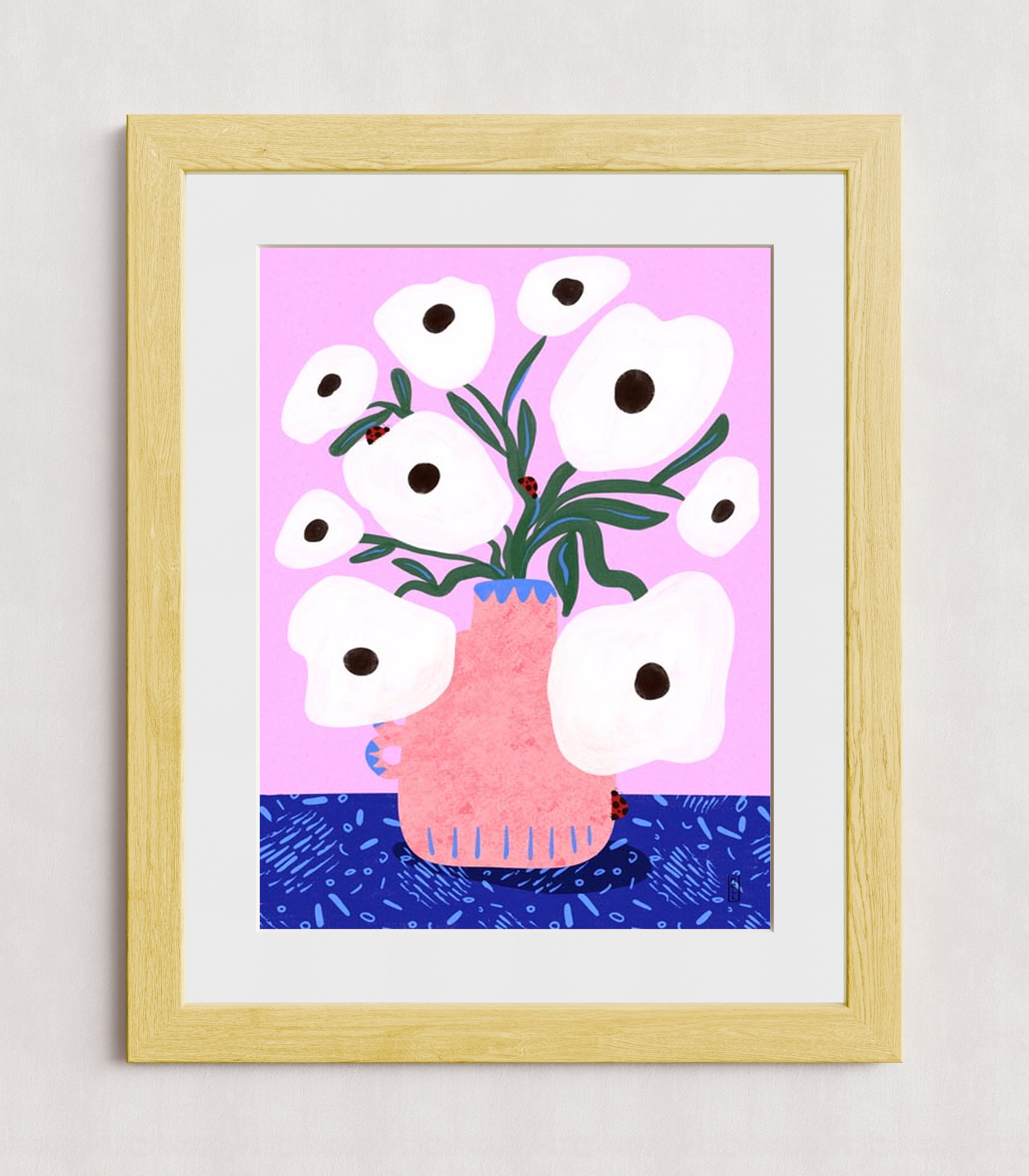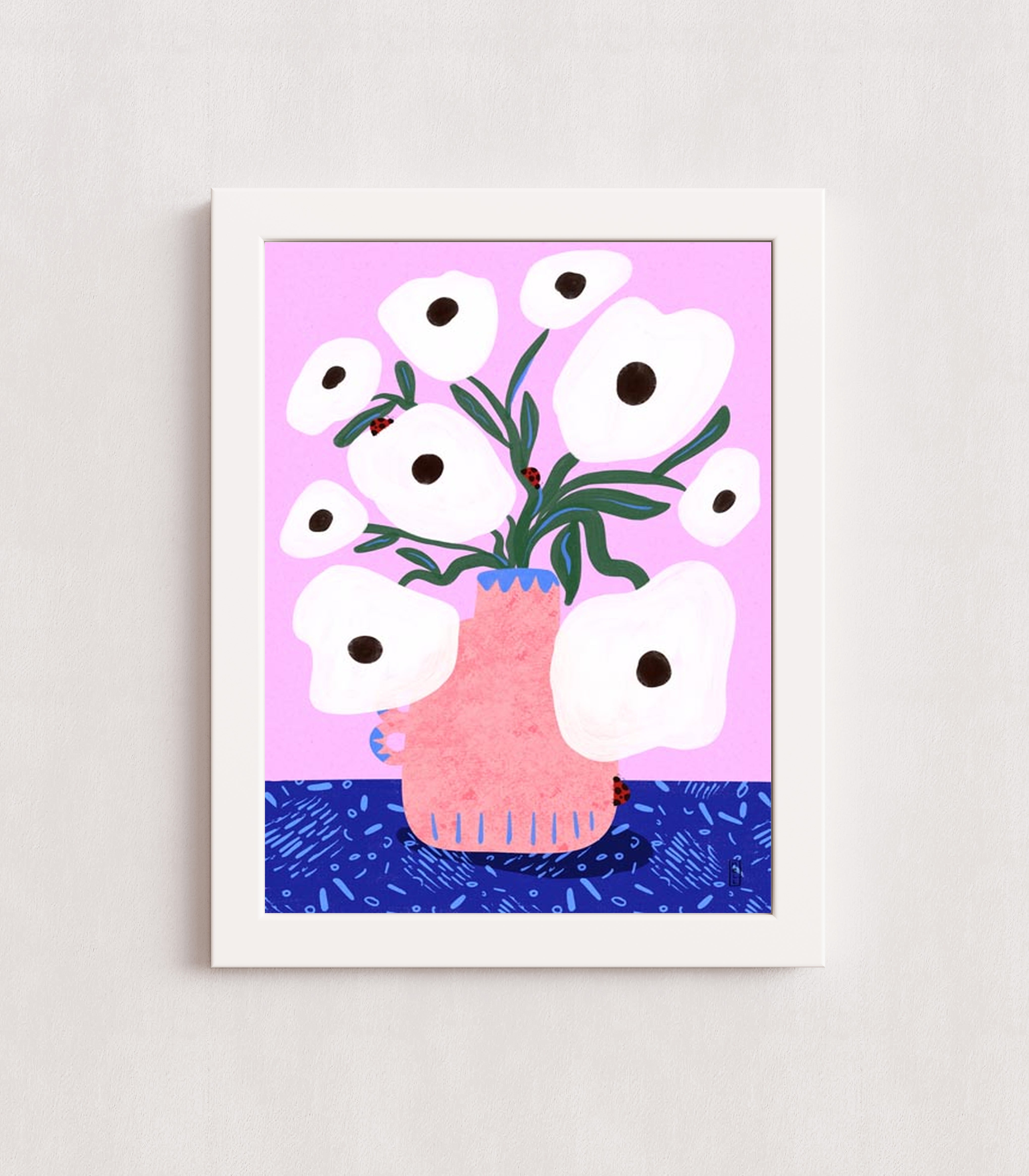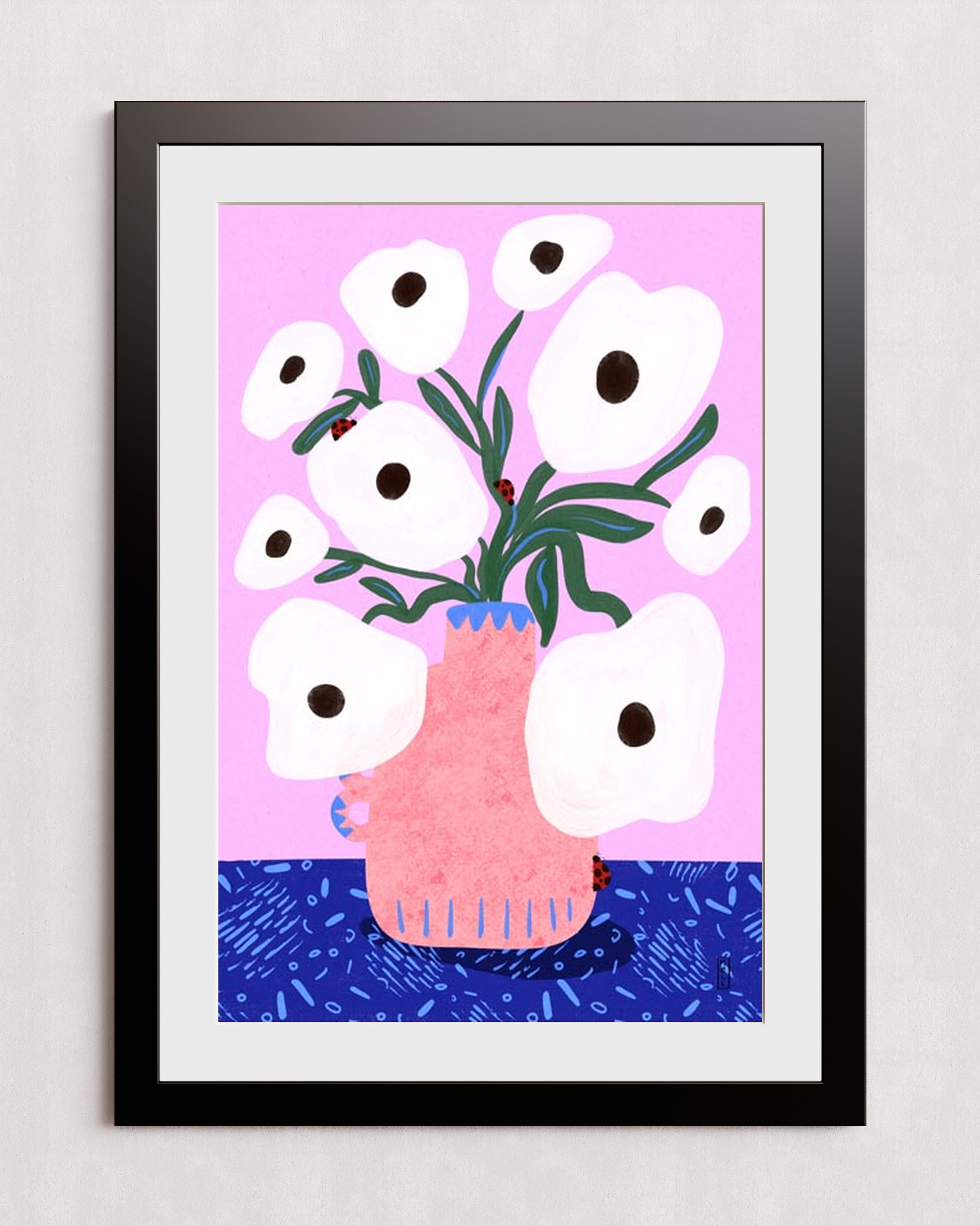A vibrant illustration featuring a pink vase holding white flowers with black centers. The setting includes a patterned blue surface and a pink background, creating a playful and colorful aesthetic. Small ladybugs are visible on the flowers and leaves, adding a whimsical touch.