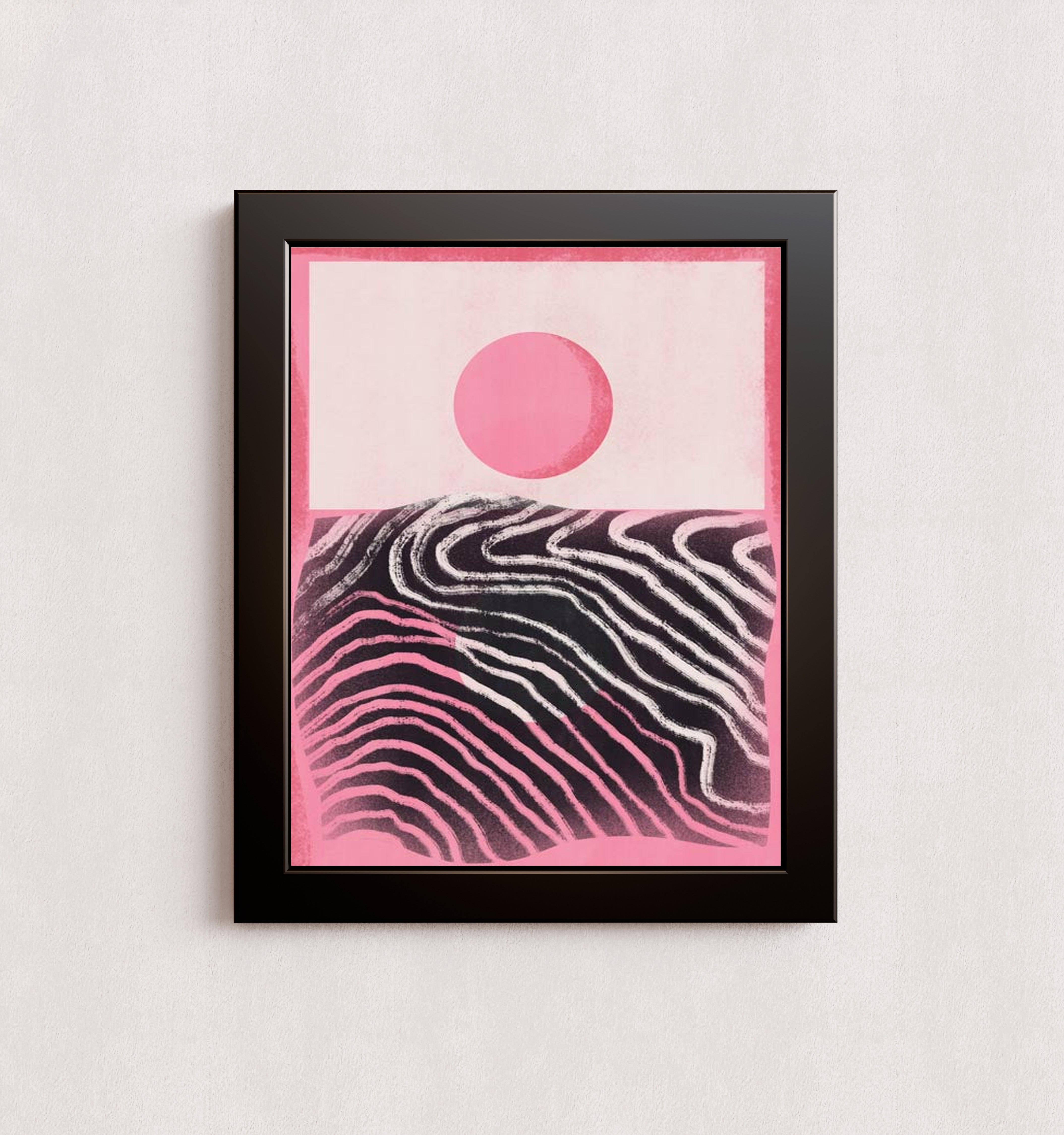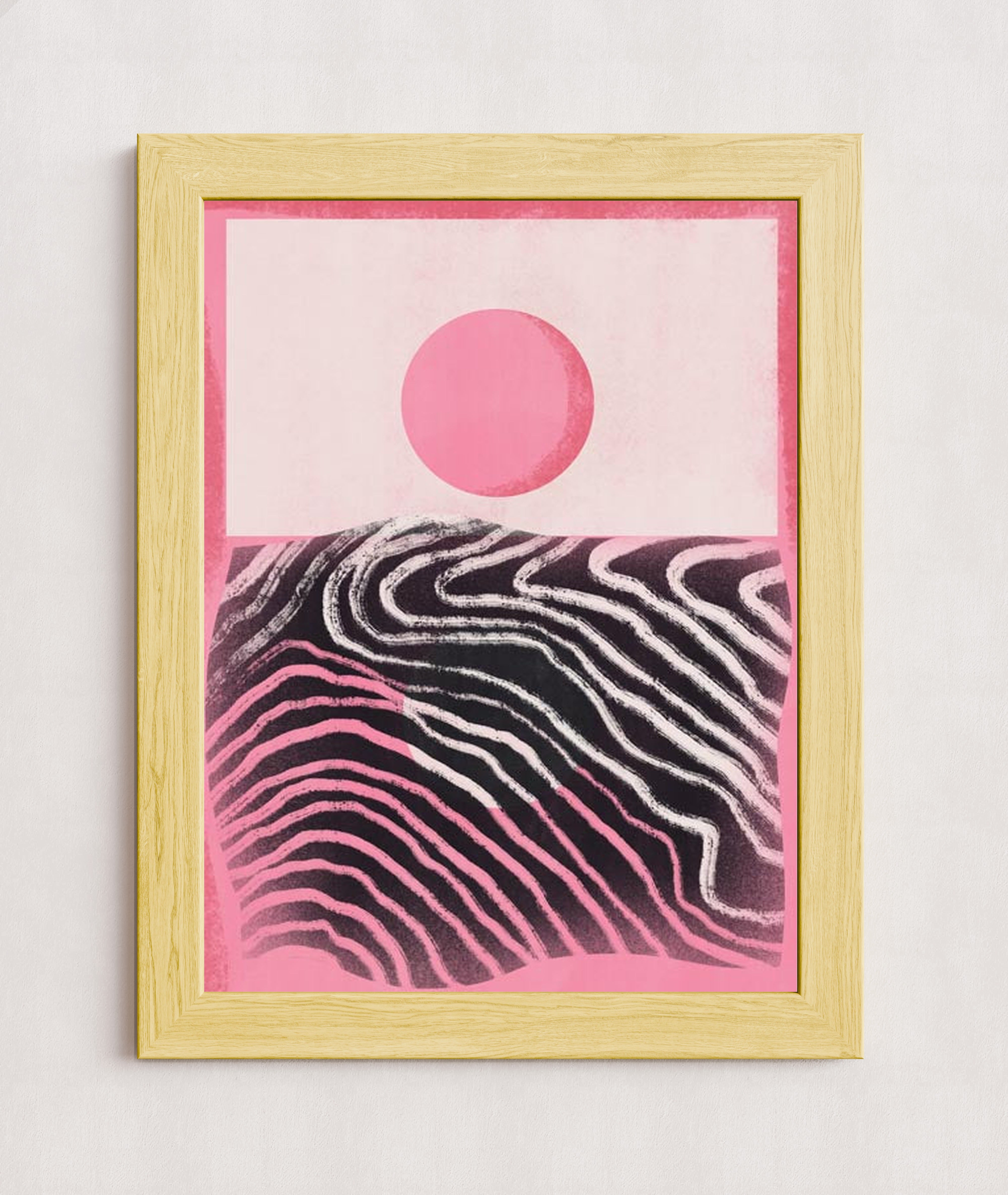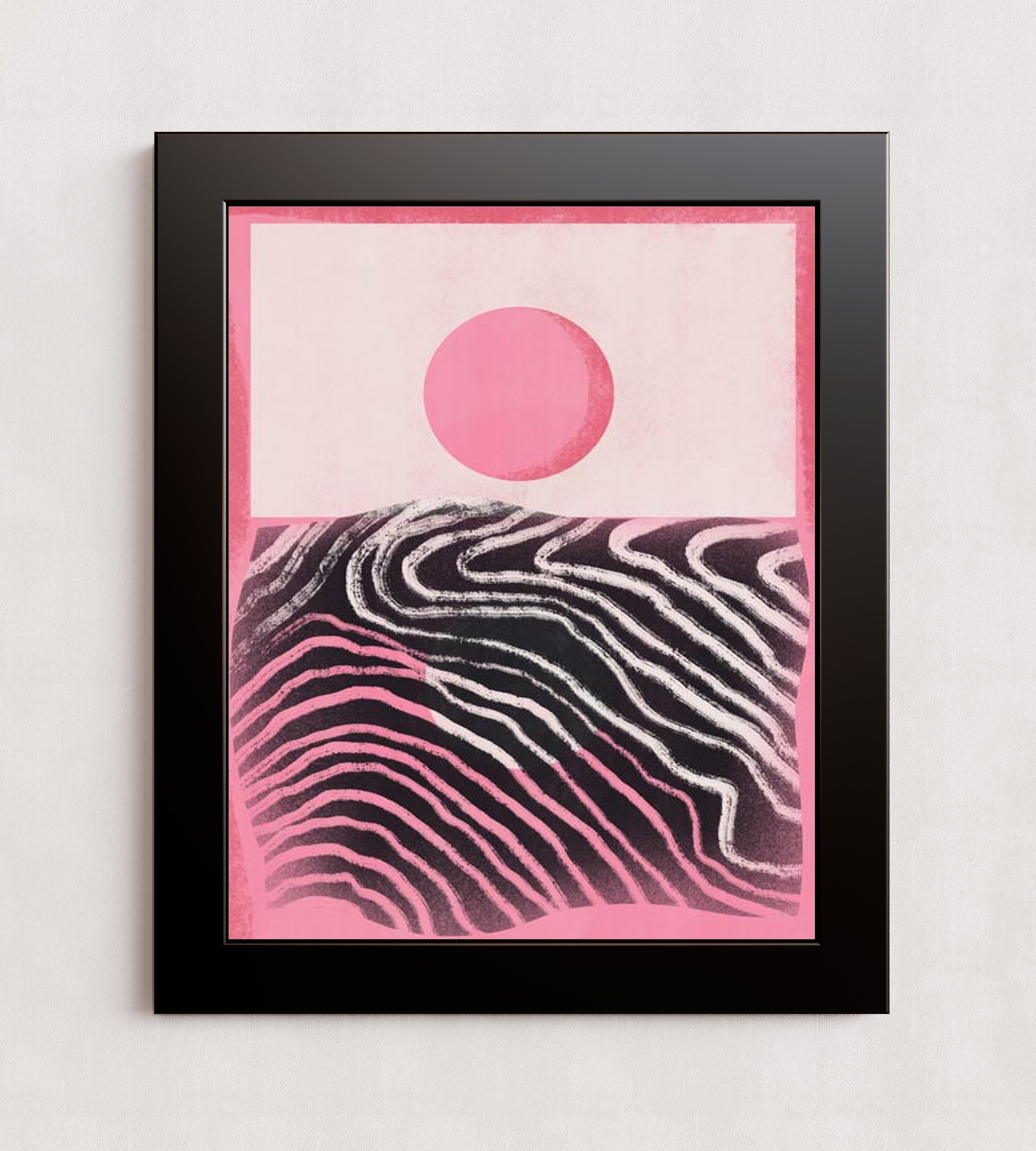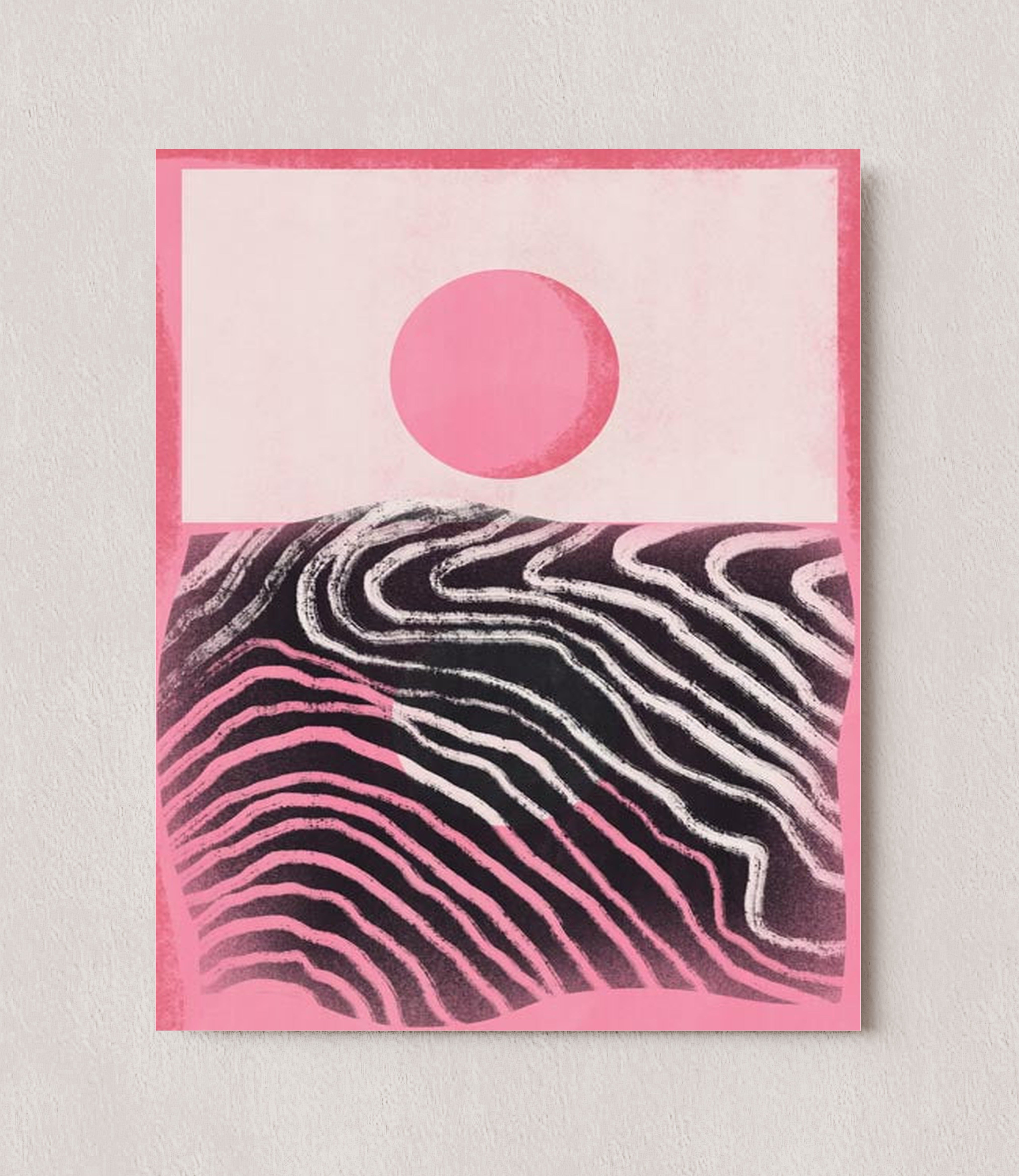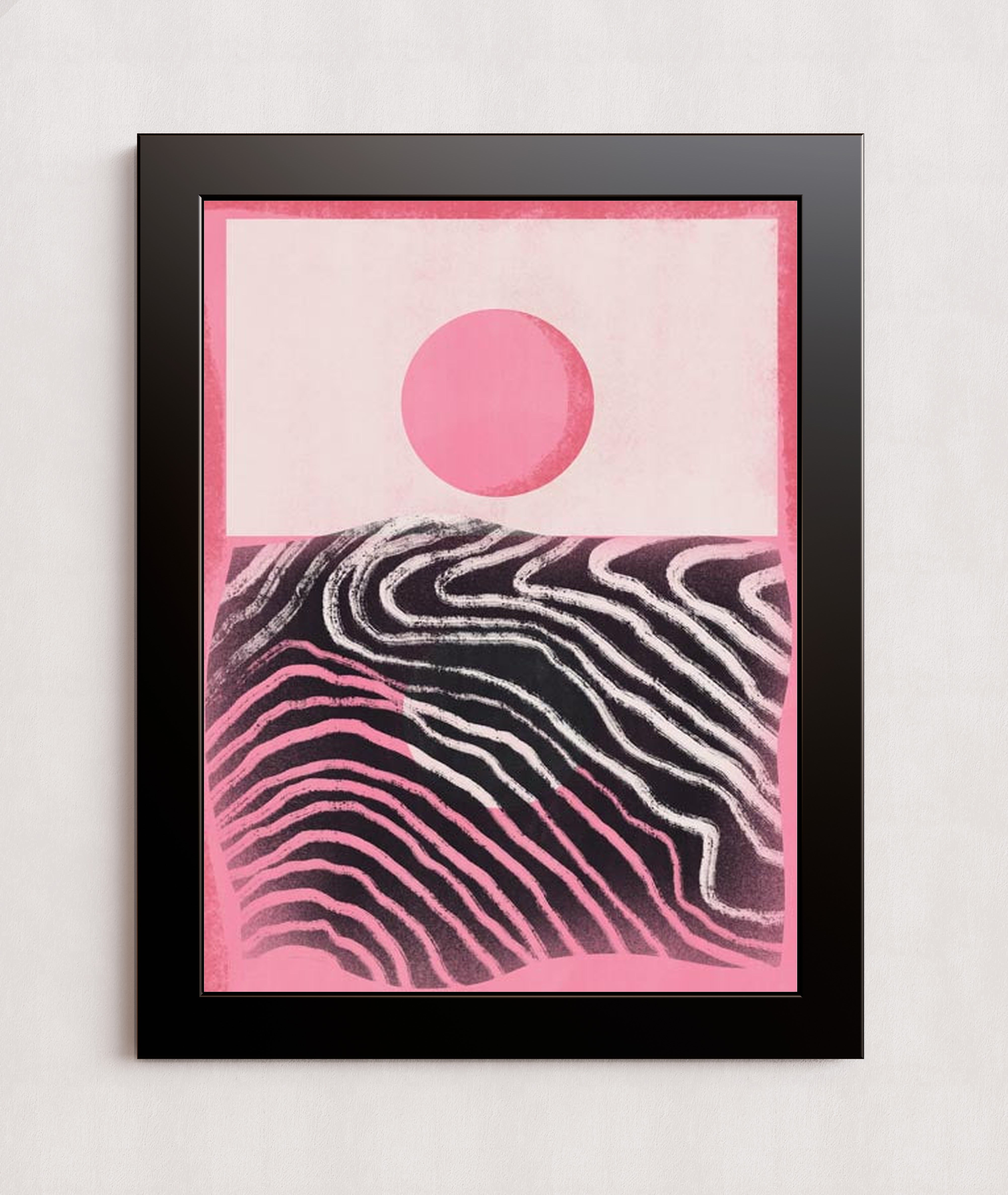 A modern abstract artwork featuring a pink circular shape above a wavy black and white striped pattern. The composition is set against a textured pink background, creating a bold and artistic visual.