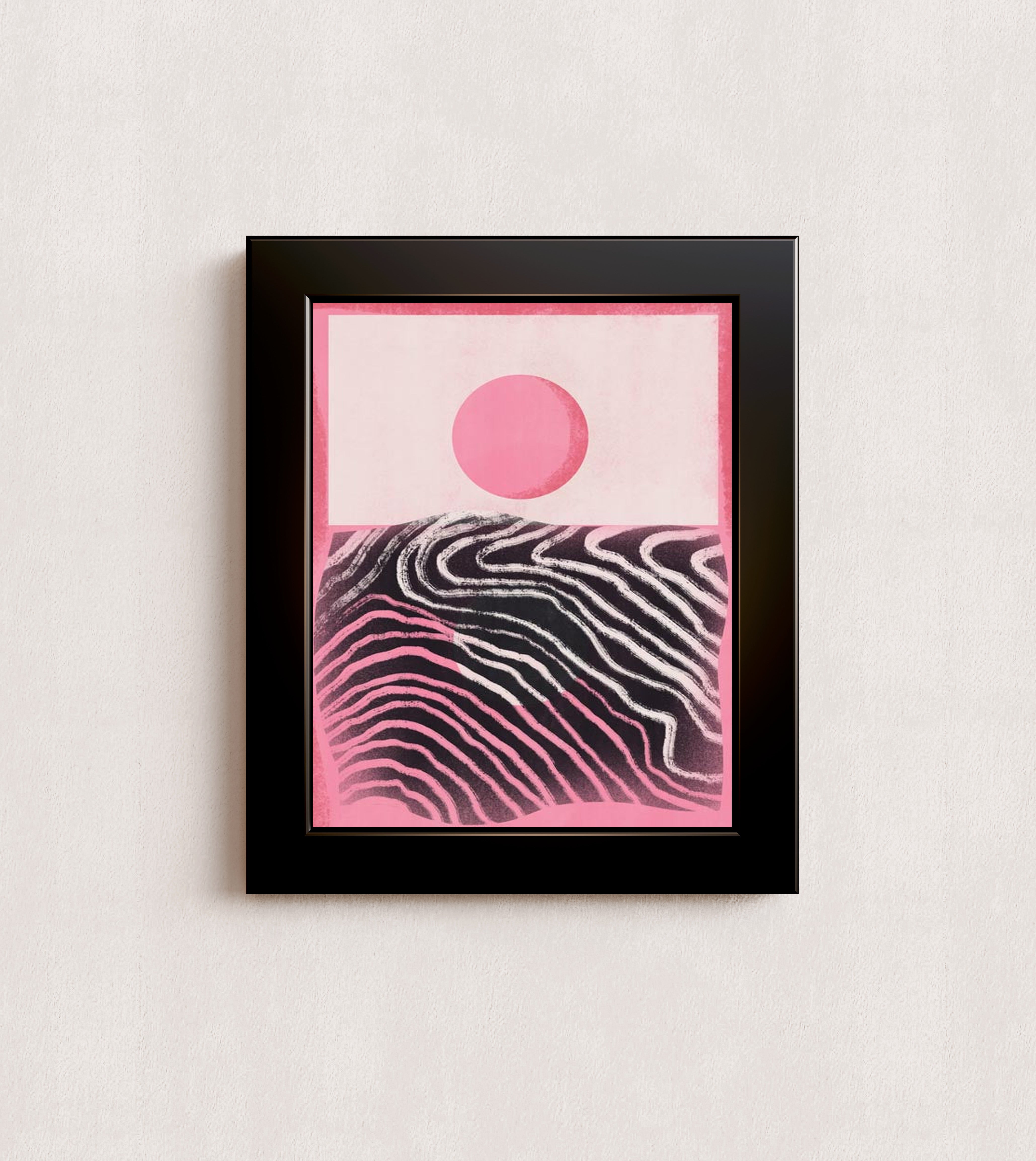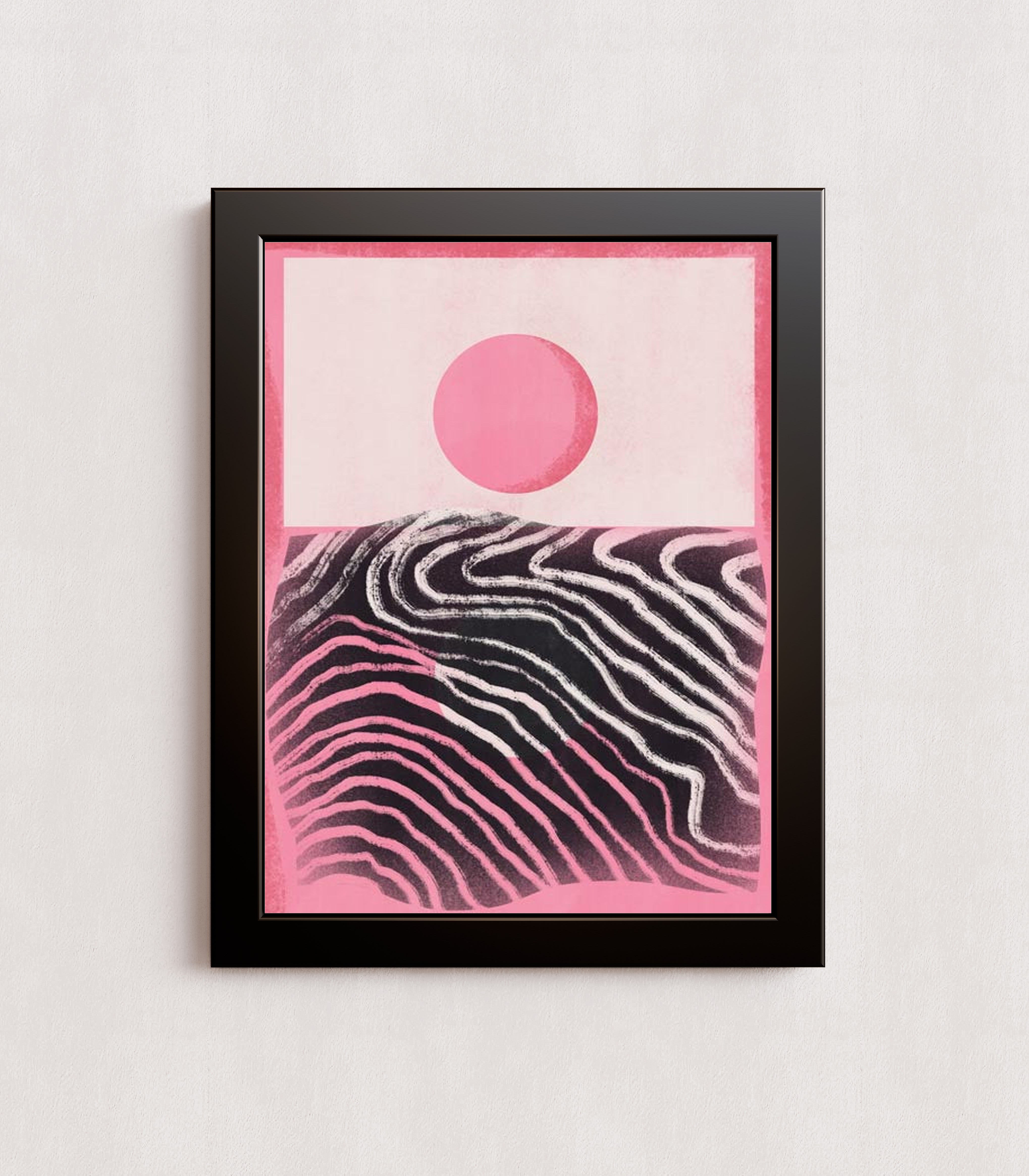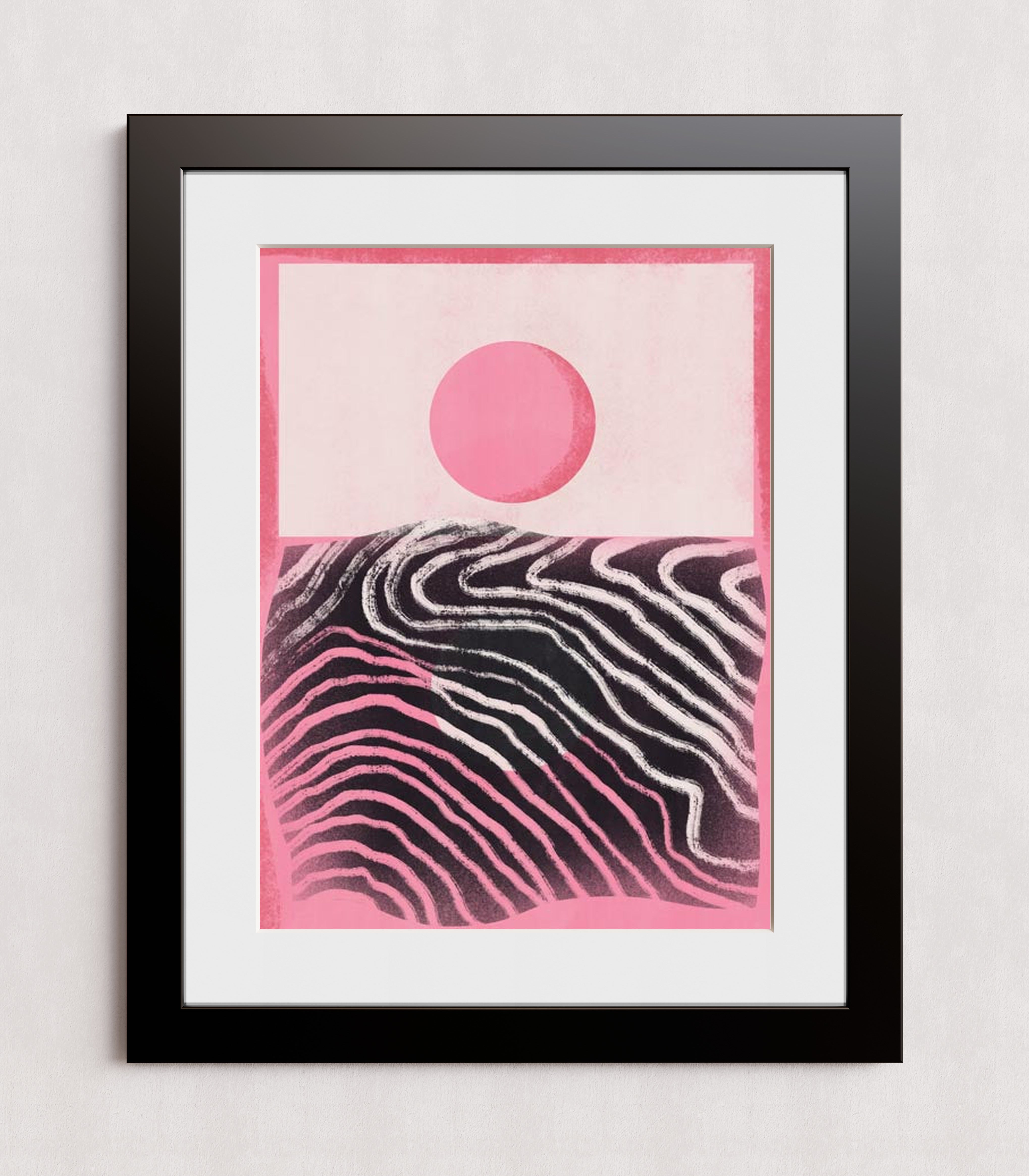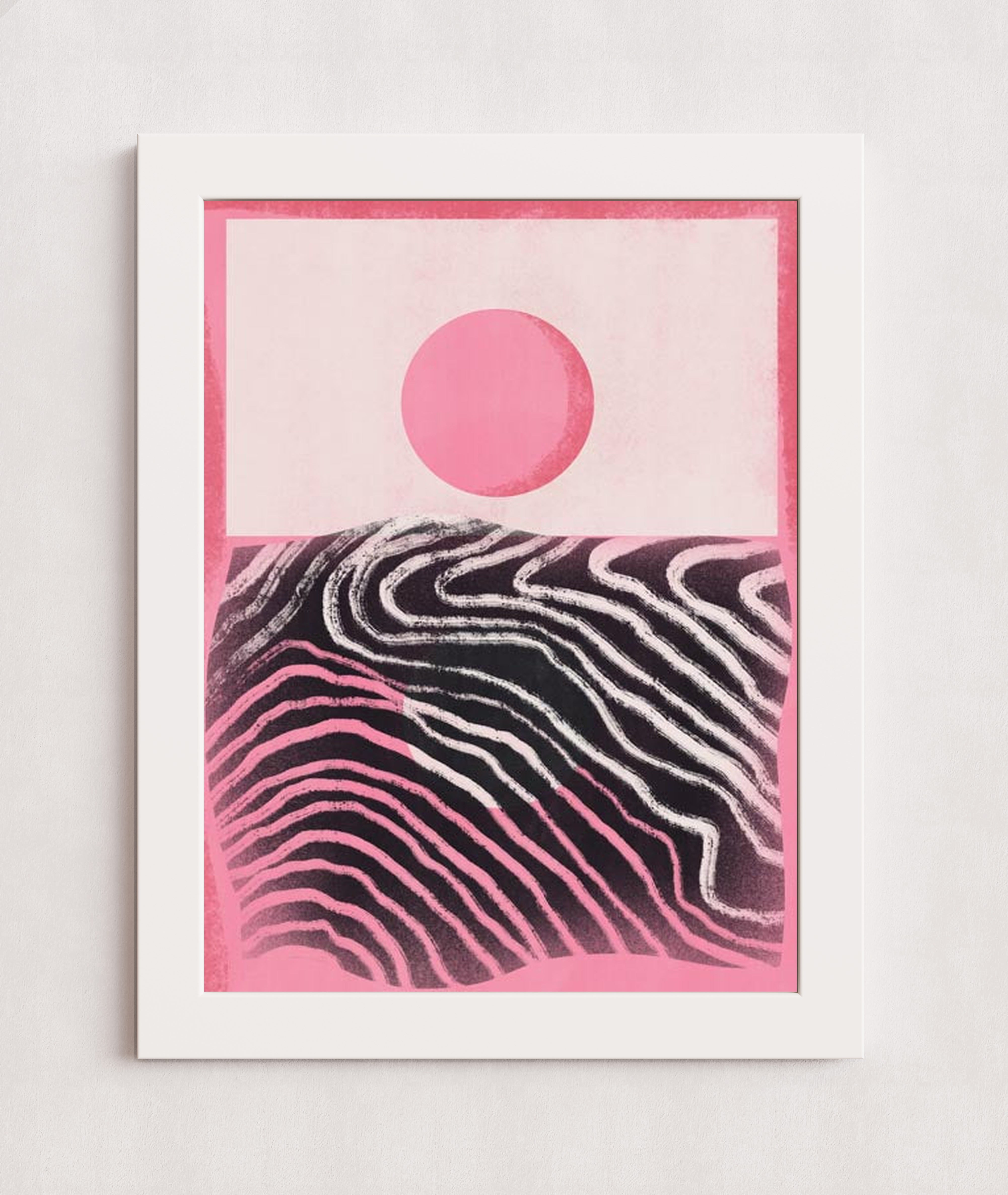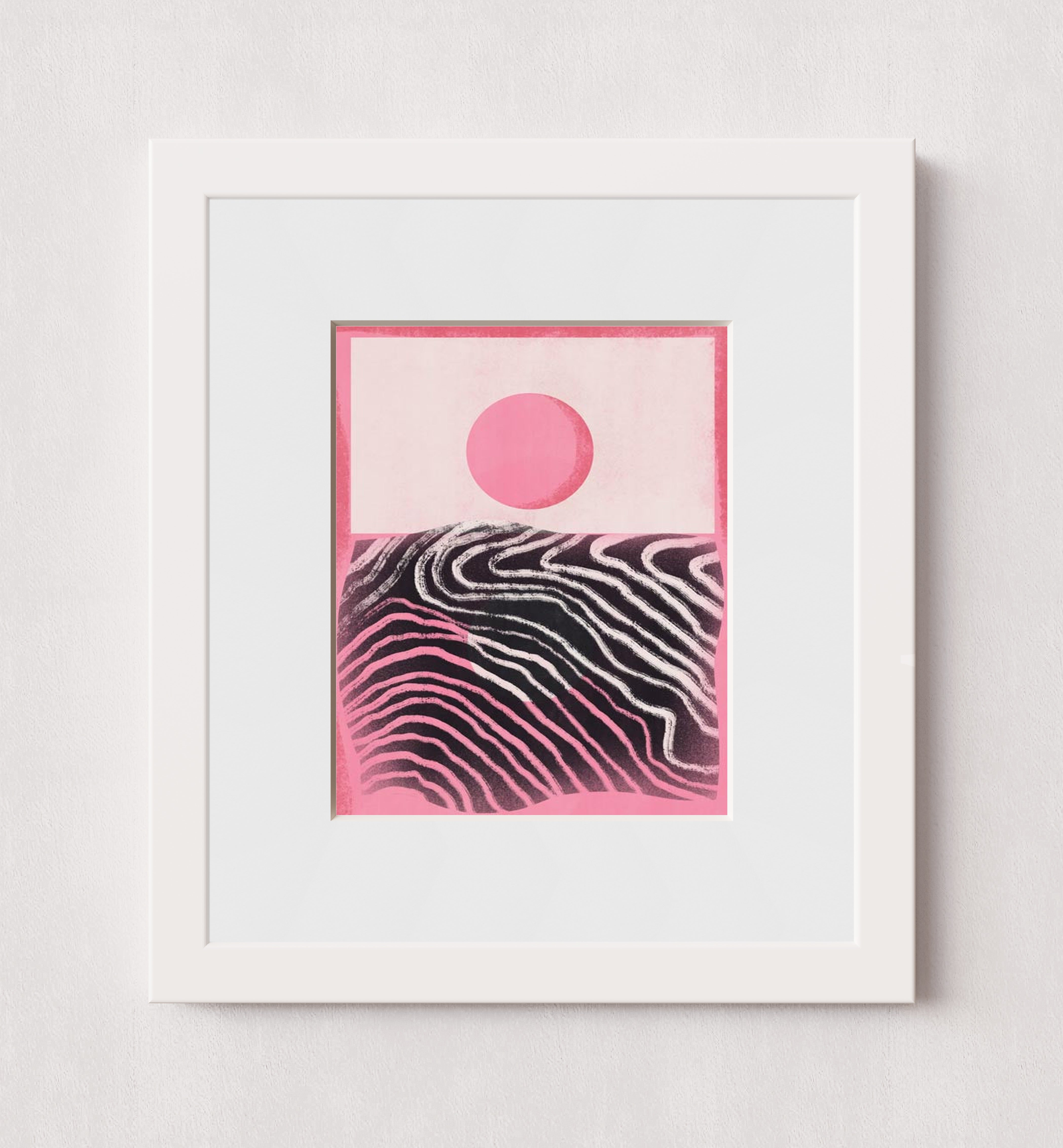 A modern abstract artwork featuring a pink circular shape above a wavy black and white striped pattern. The composition is set against a textured pink background, creating a bold and artistic visual.