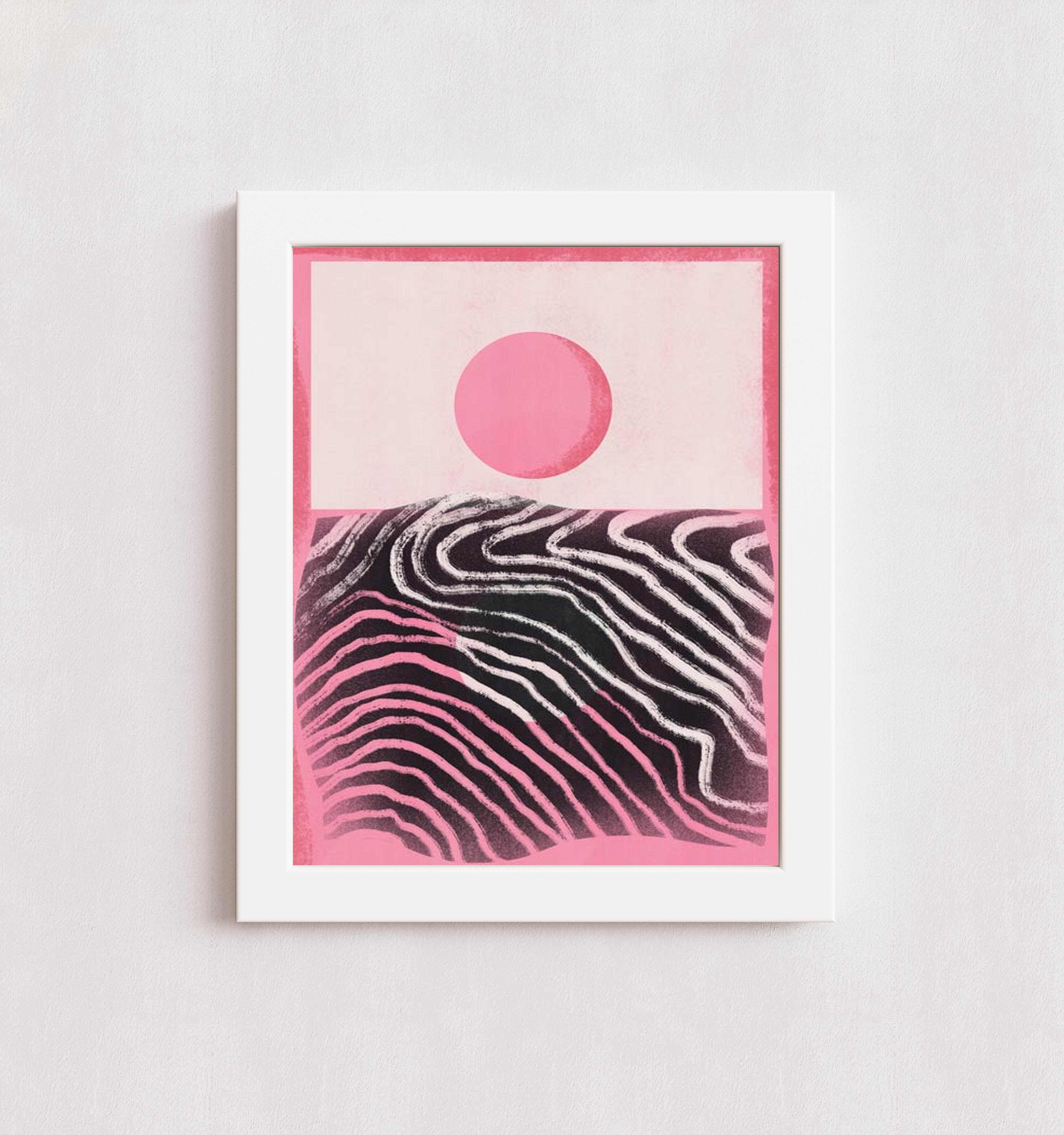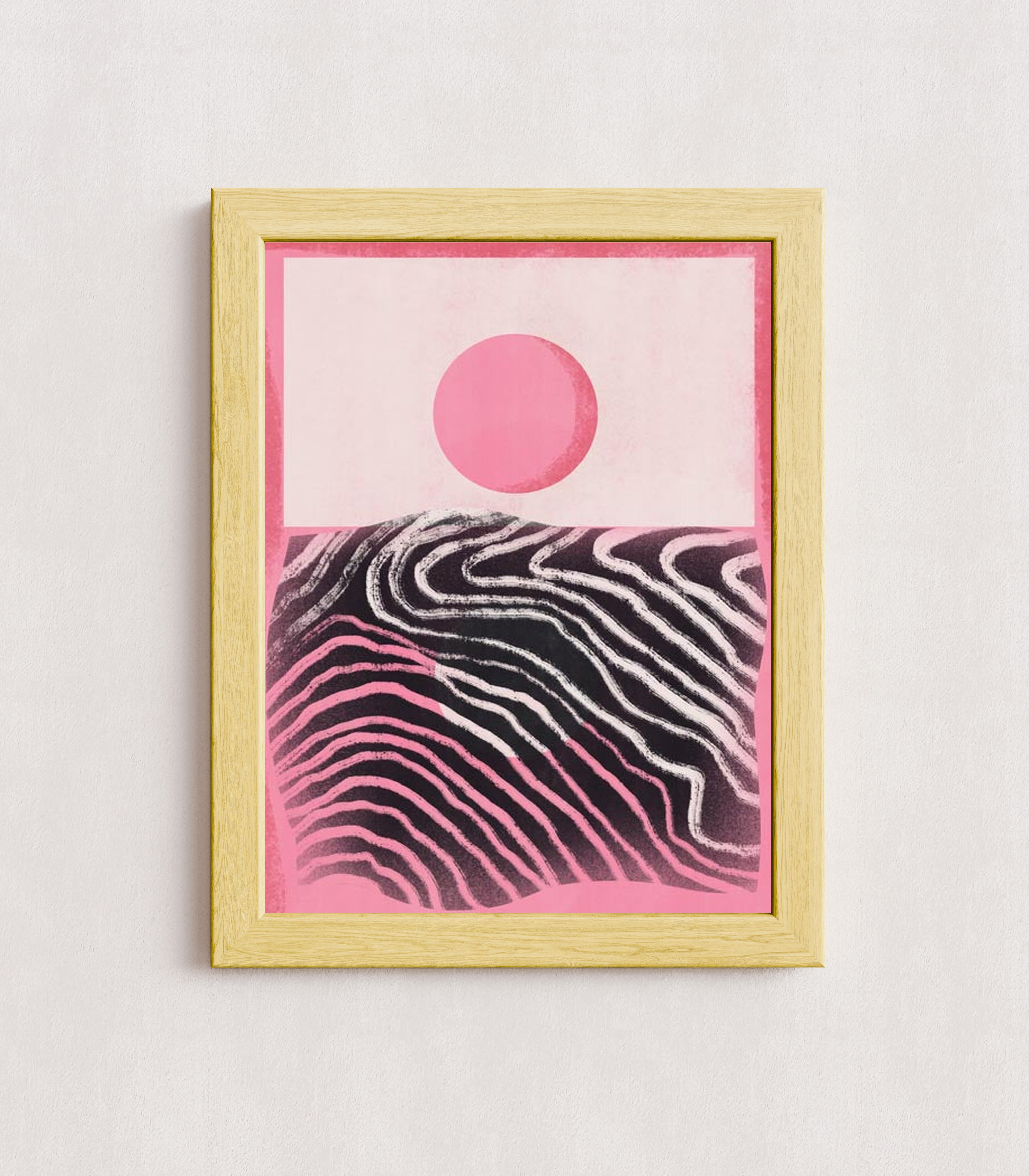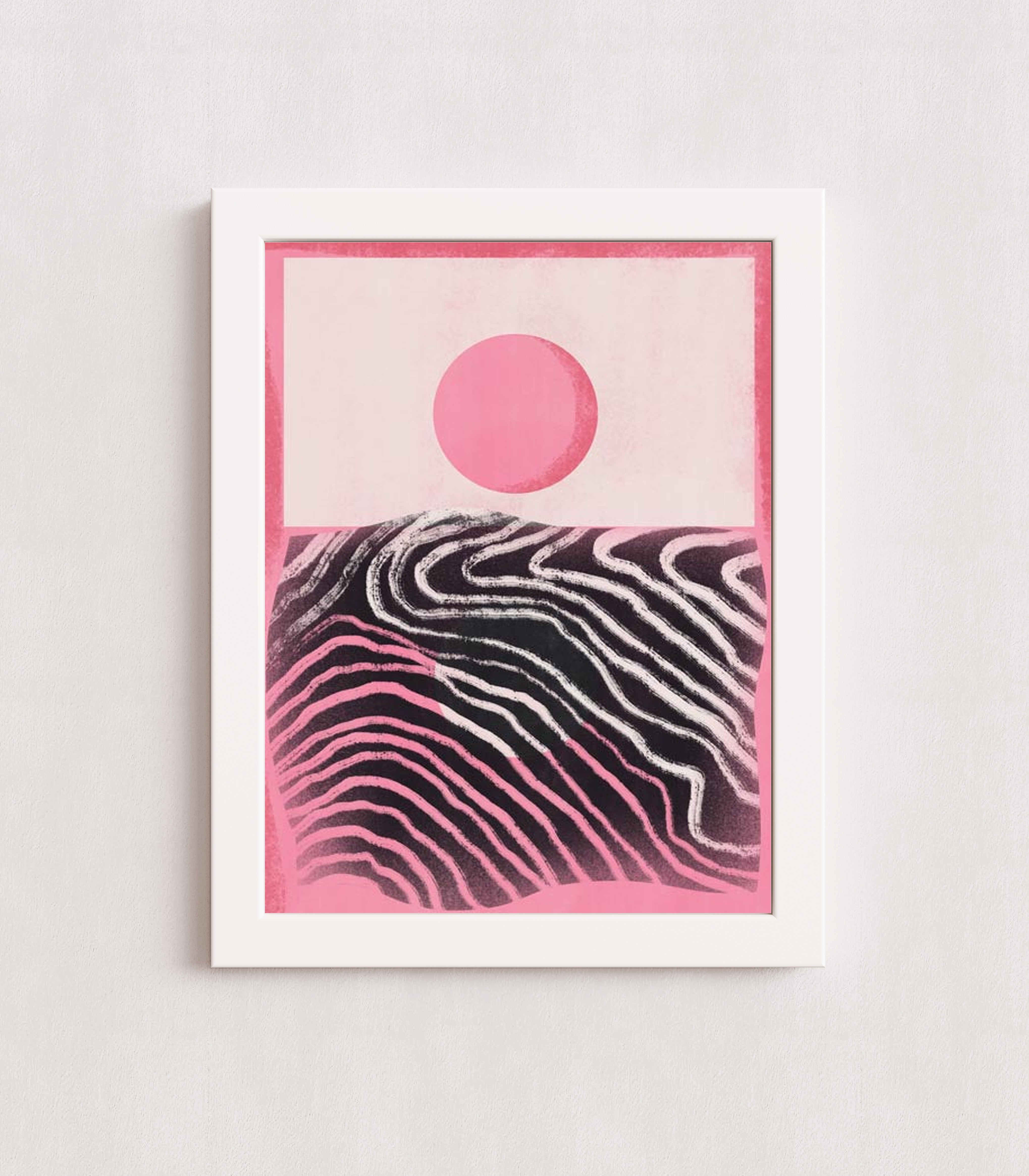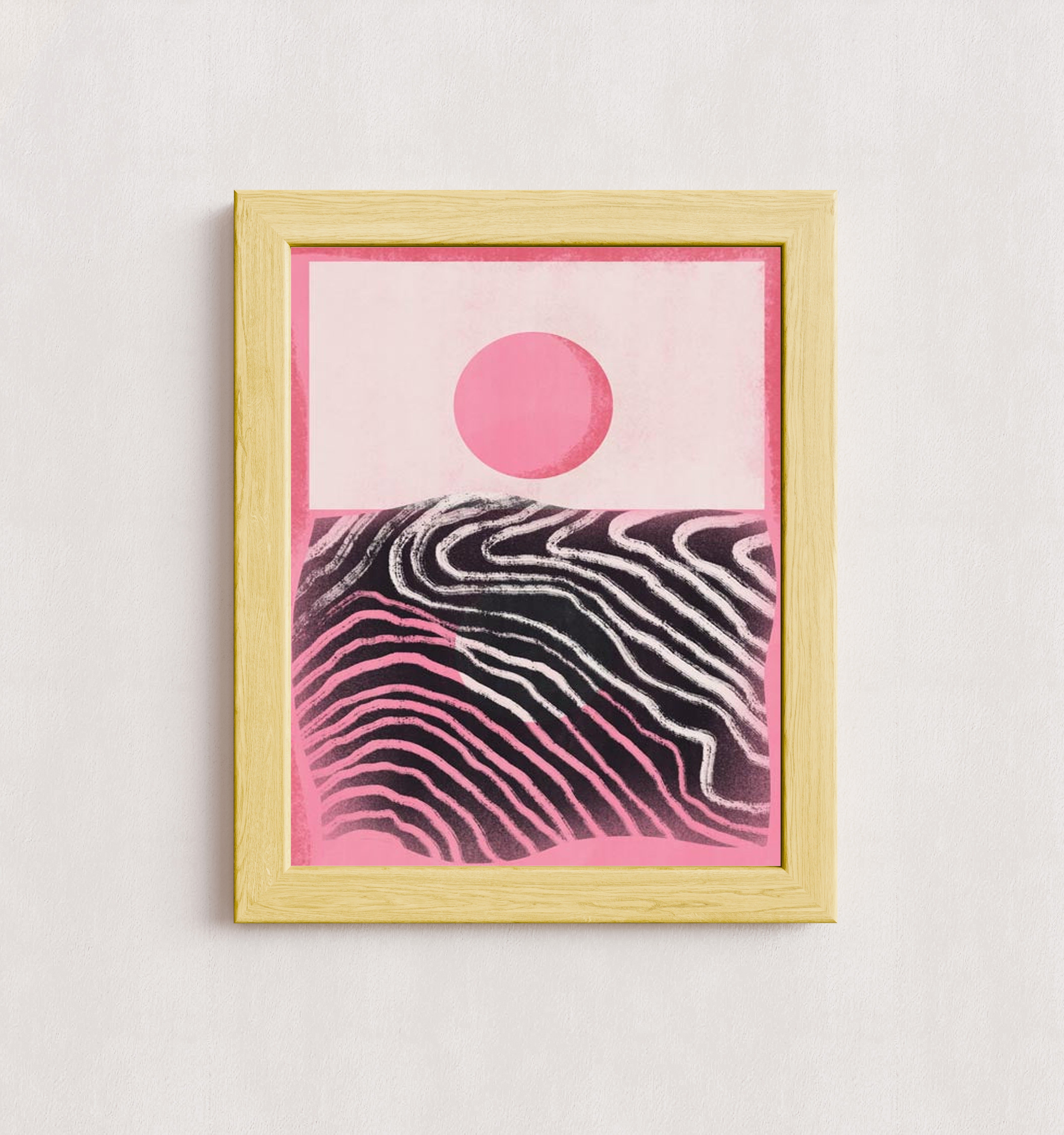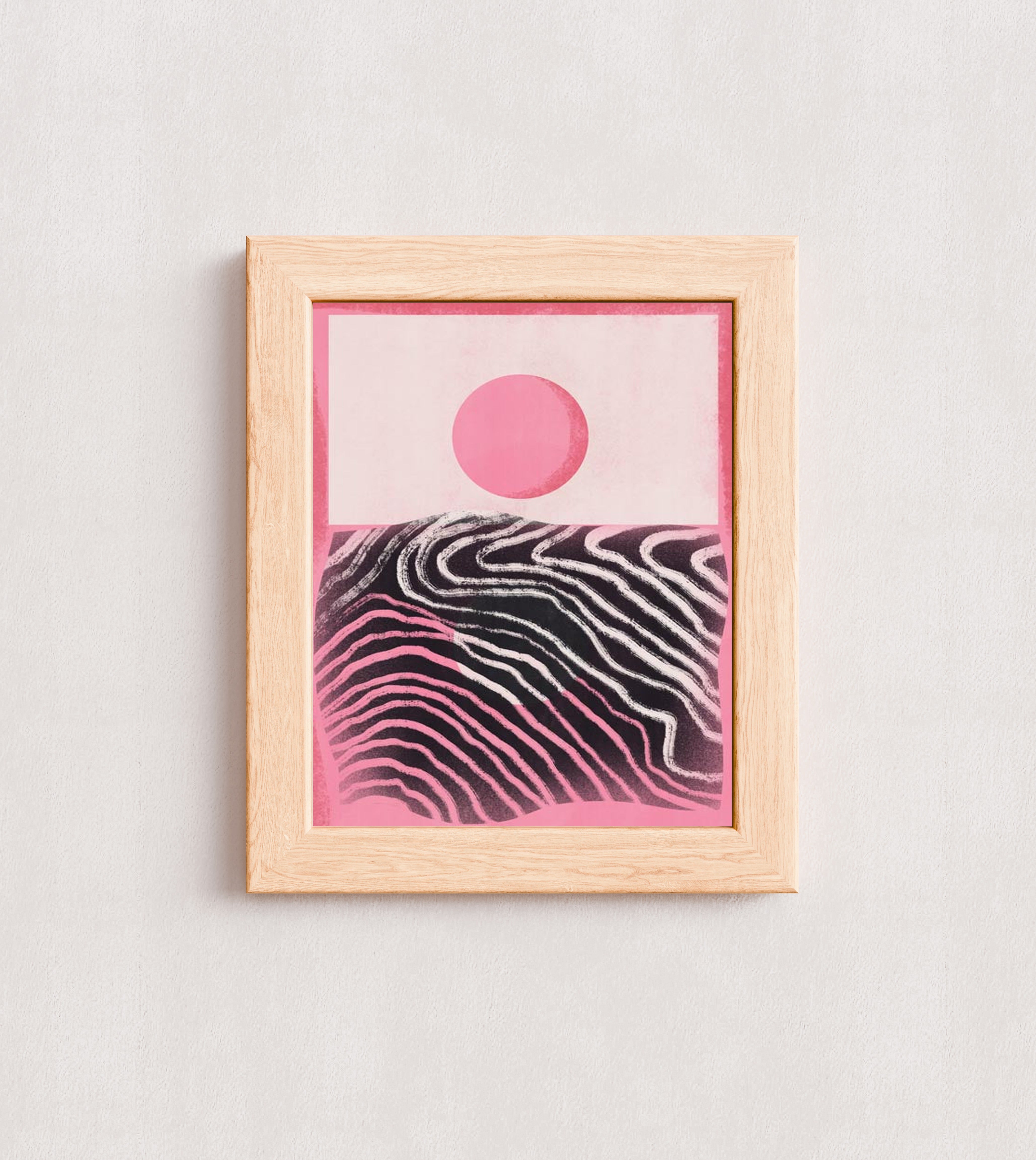 A modern abstract artwork featuring a pink circular shape above a wavy black and white striped pattern. The composition is set against a textured pink background, creating a bold and artistic visual.