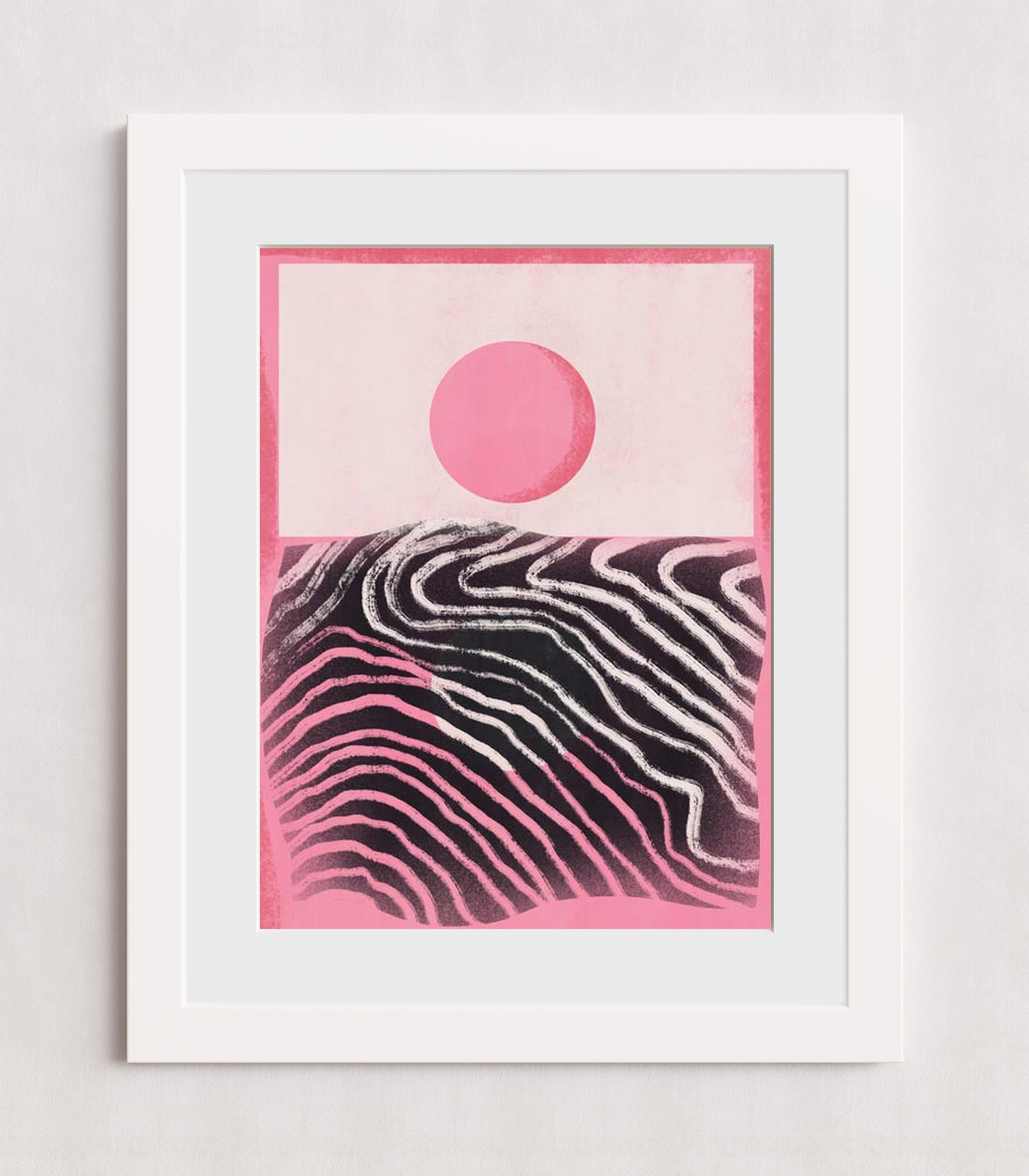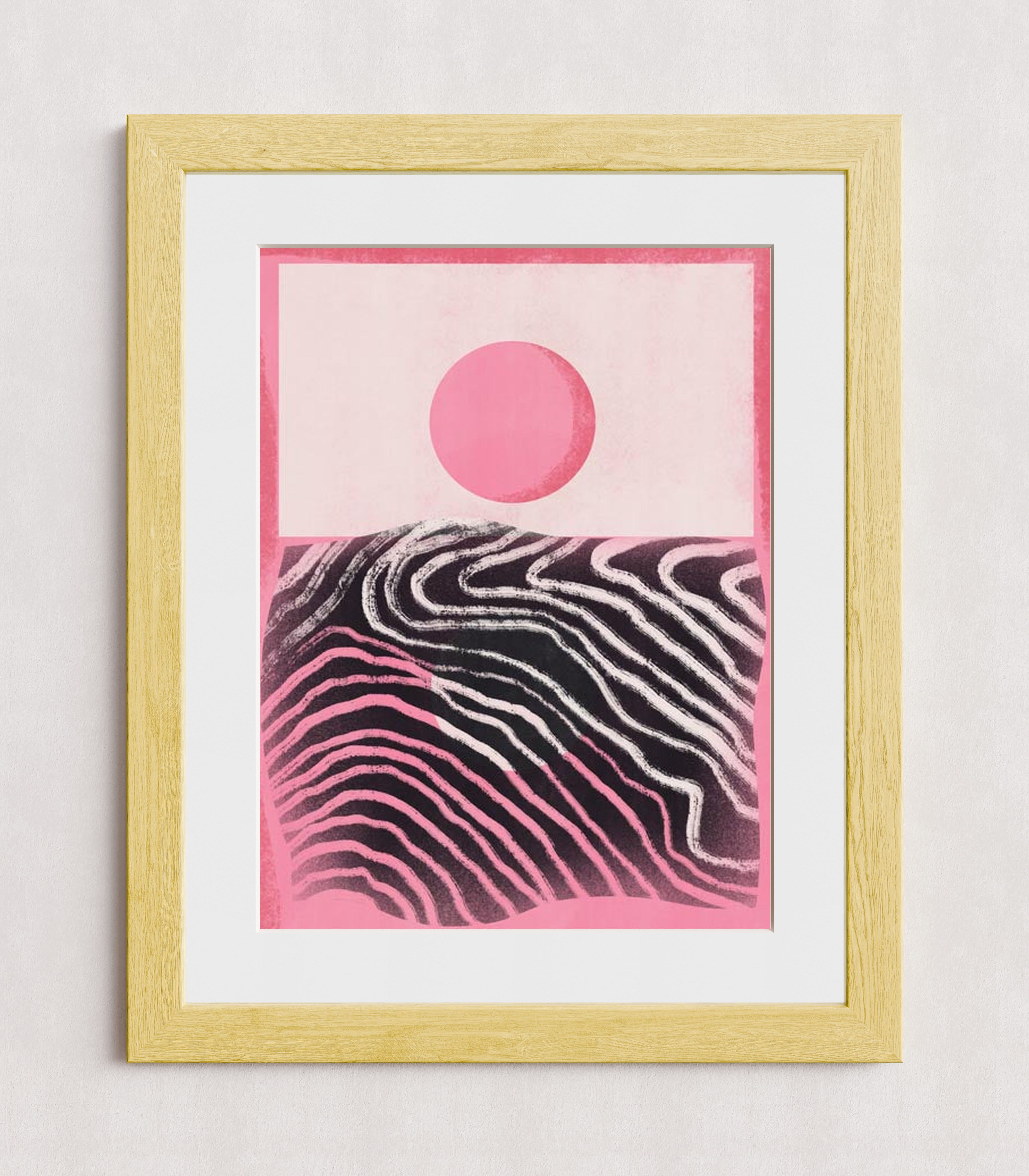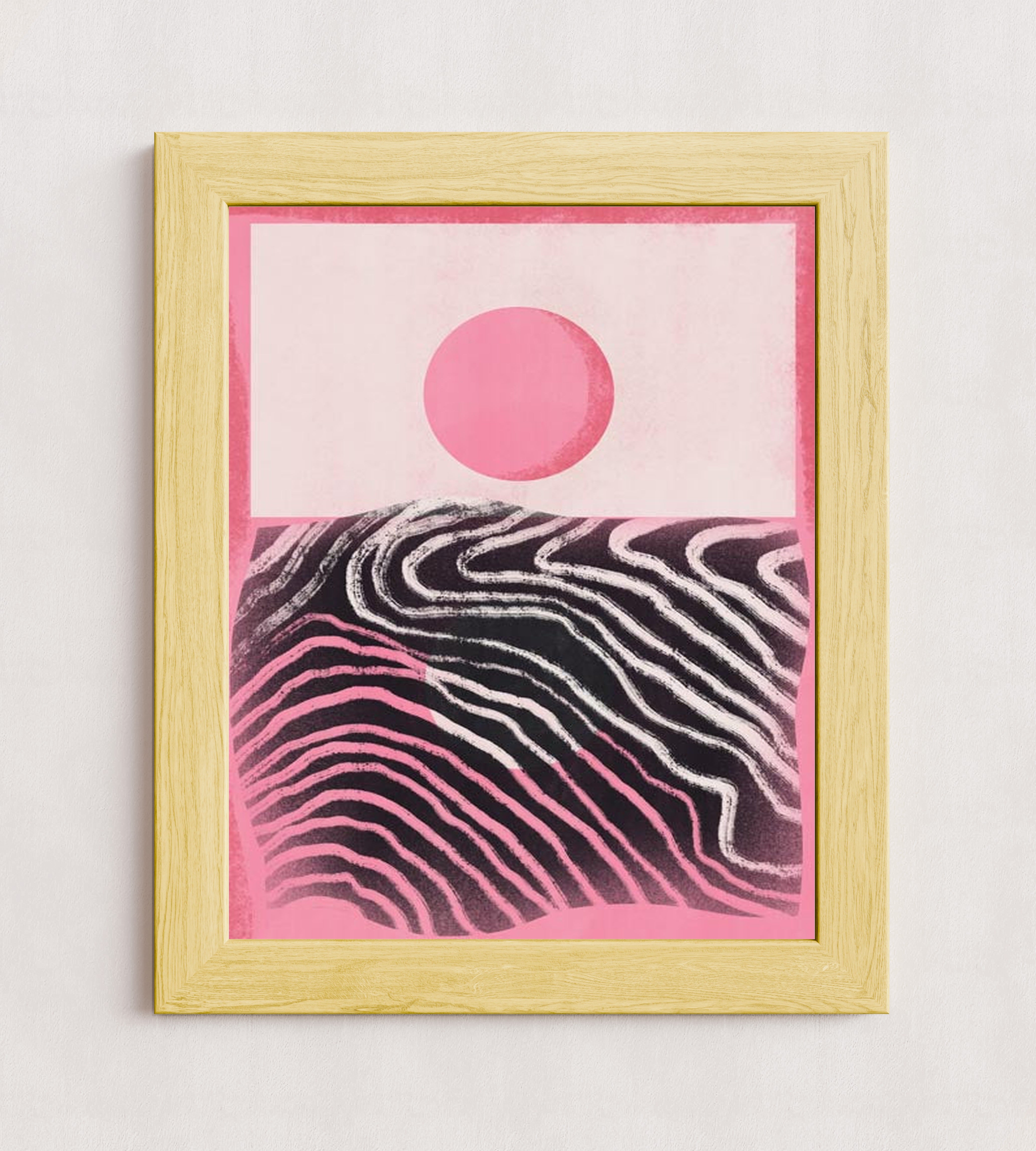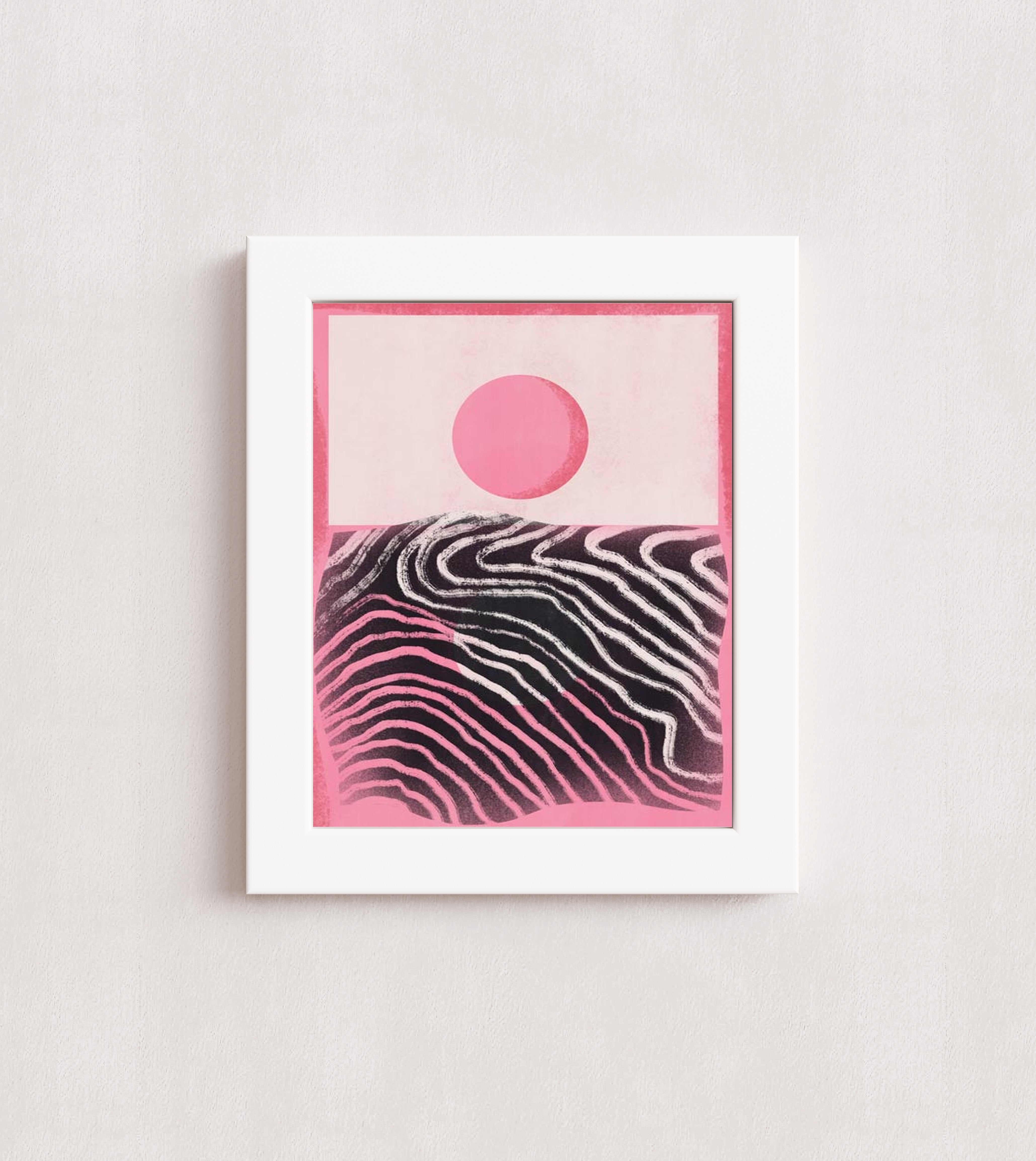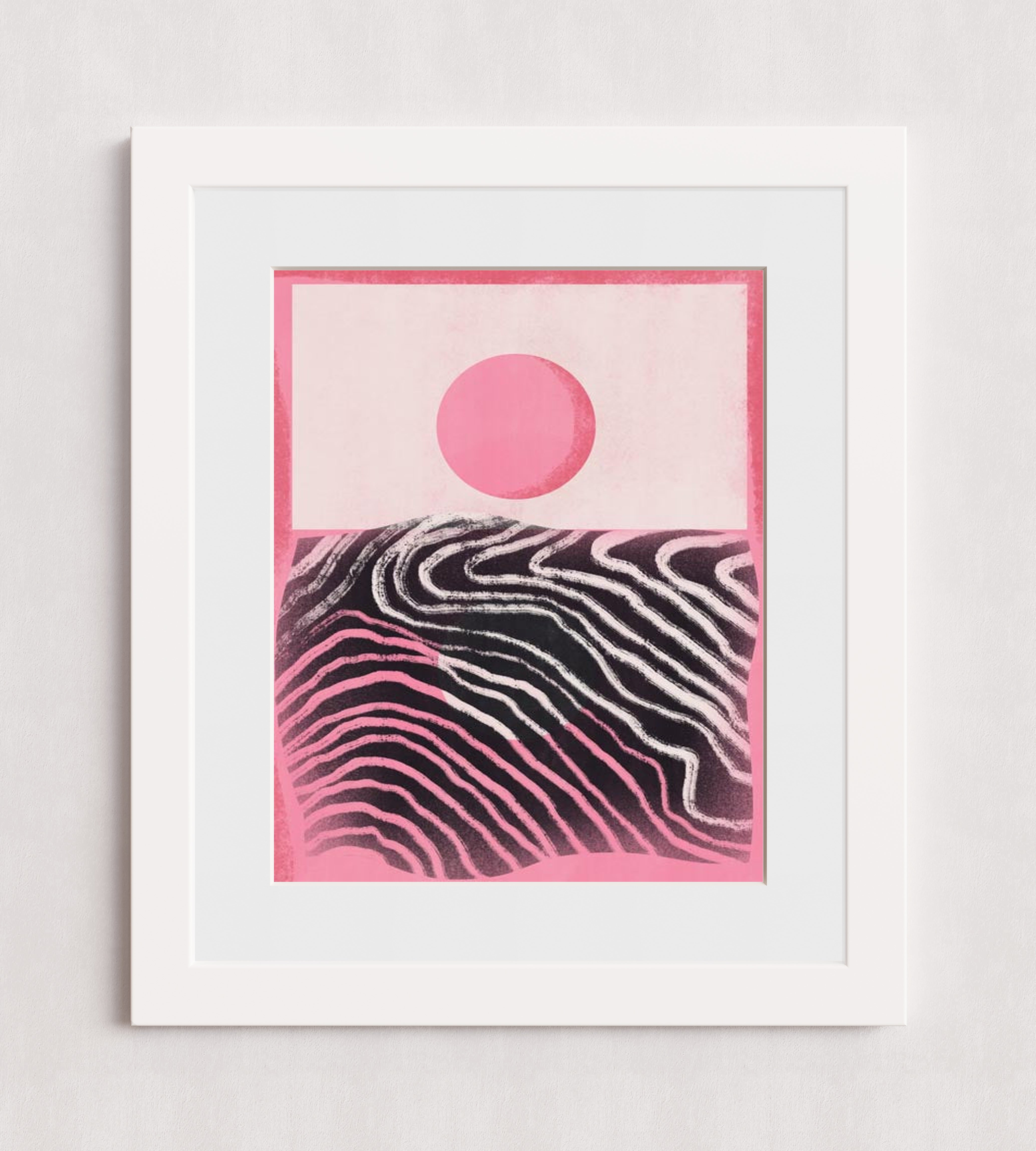 A modern abstract artwork featuring a pink circular shape above a wavy black and white striped pattern. The composition is set against a textured pink background, creating a bold and artistic visual.