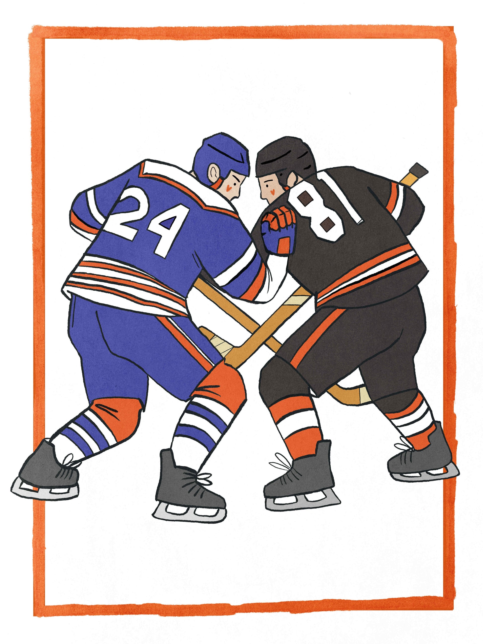 Inspired by the hit show Heated Rivalry, this image features two male hockey players engaged in a face-off. One is wearing a blue and white jersey with the number 24, and the other is in a black and orange jersey with the number 81.