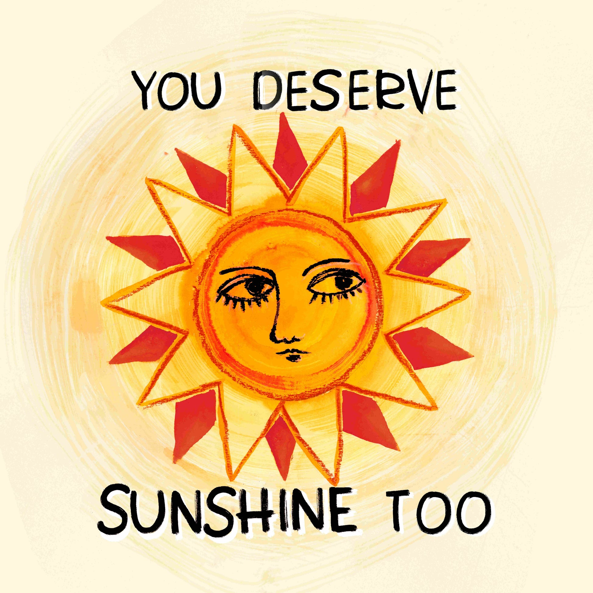 A hand-drawn sun with vibrant yellow and red rays is featured at the center of the image. The background is soft, light yellow, with text inspired by the hit show Heated Rivalry: 'YOU DESERVE SUNSHINE TOO’.