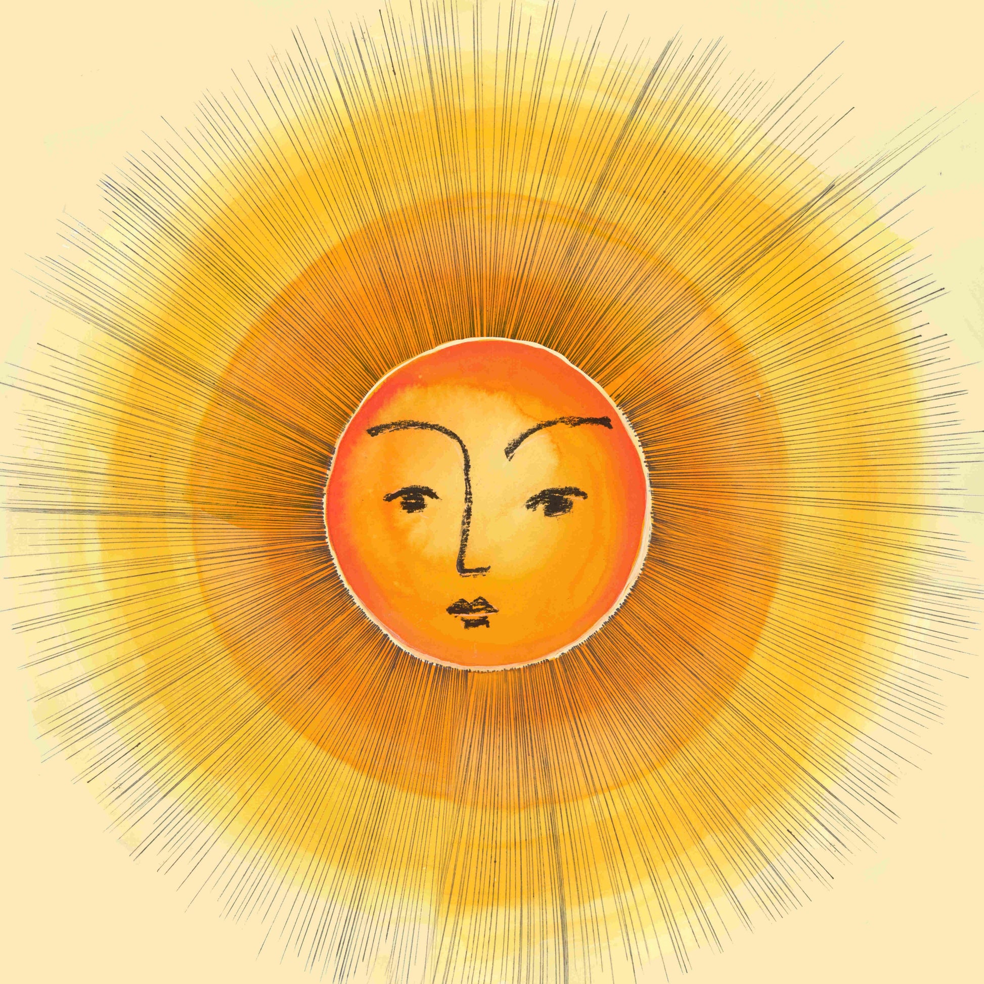 A vibrant abstract artwork inspired by the hit show Heated Rivalry, featuring a central orange circle surrounded by radiating yellow and gold lines, creating a sunburst effect.